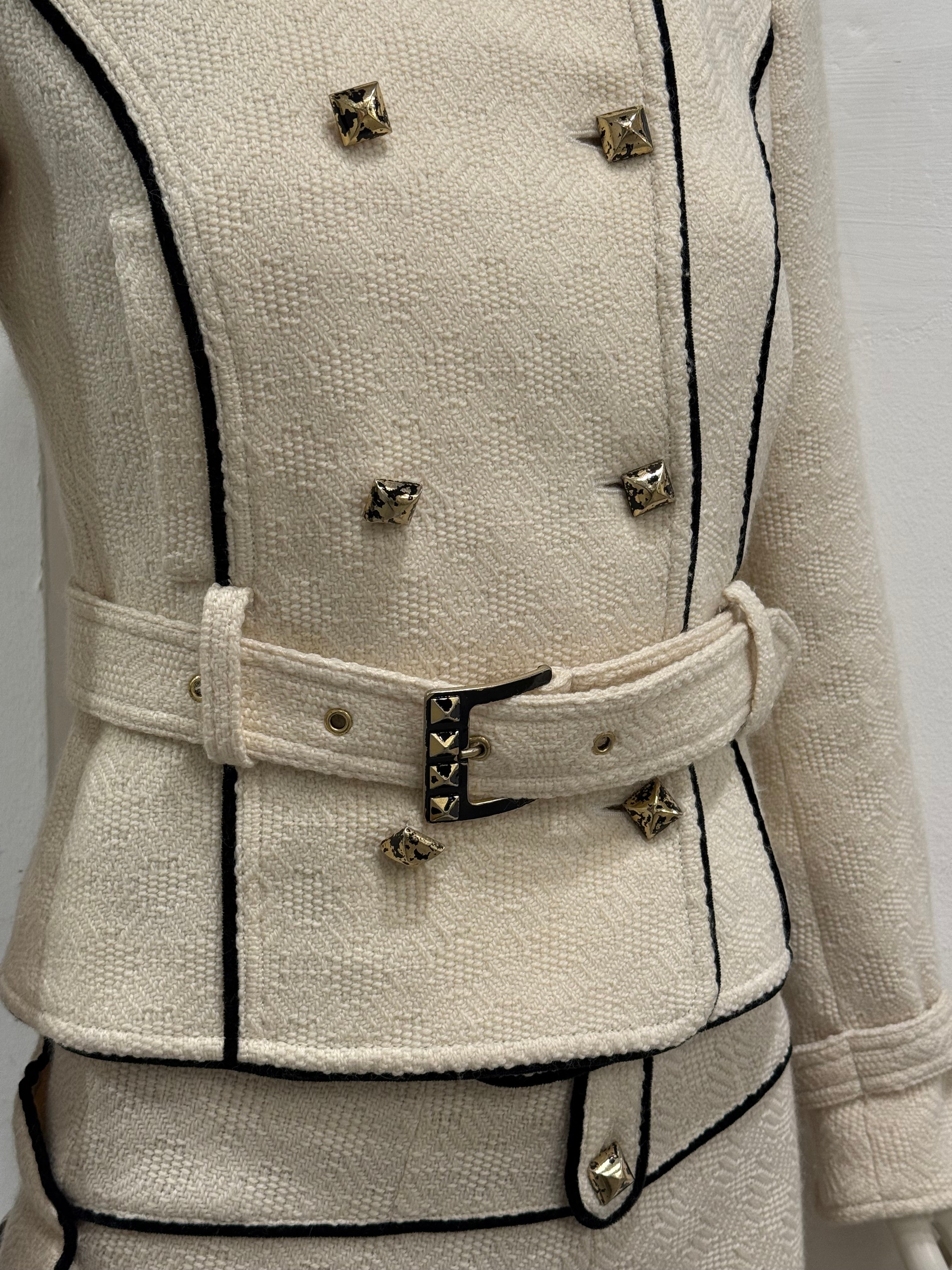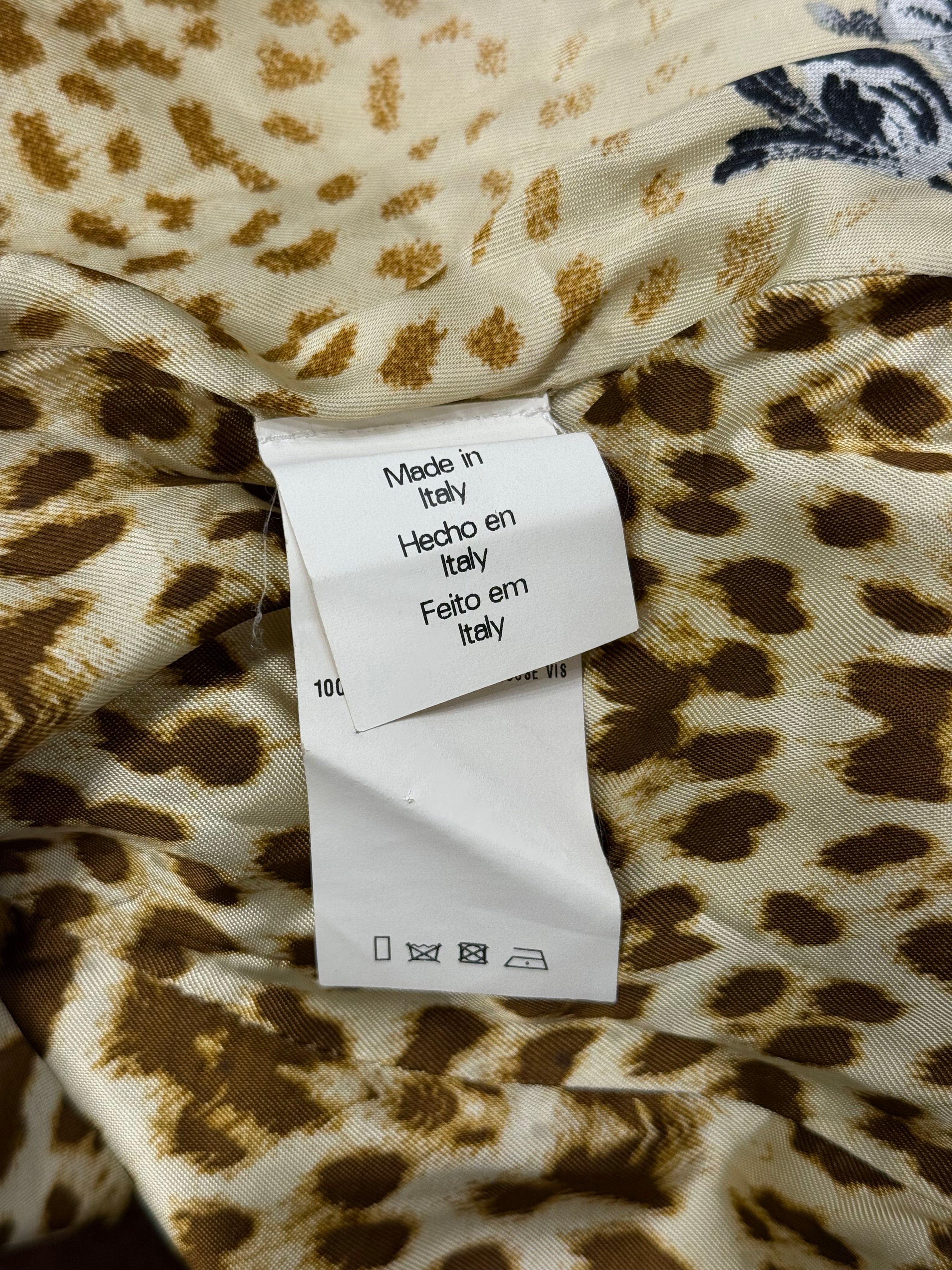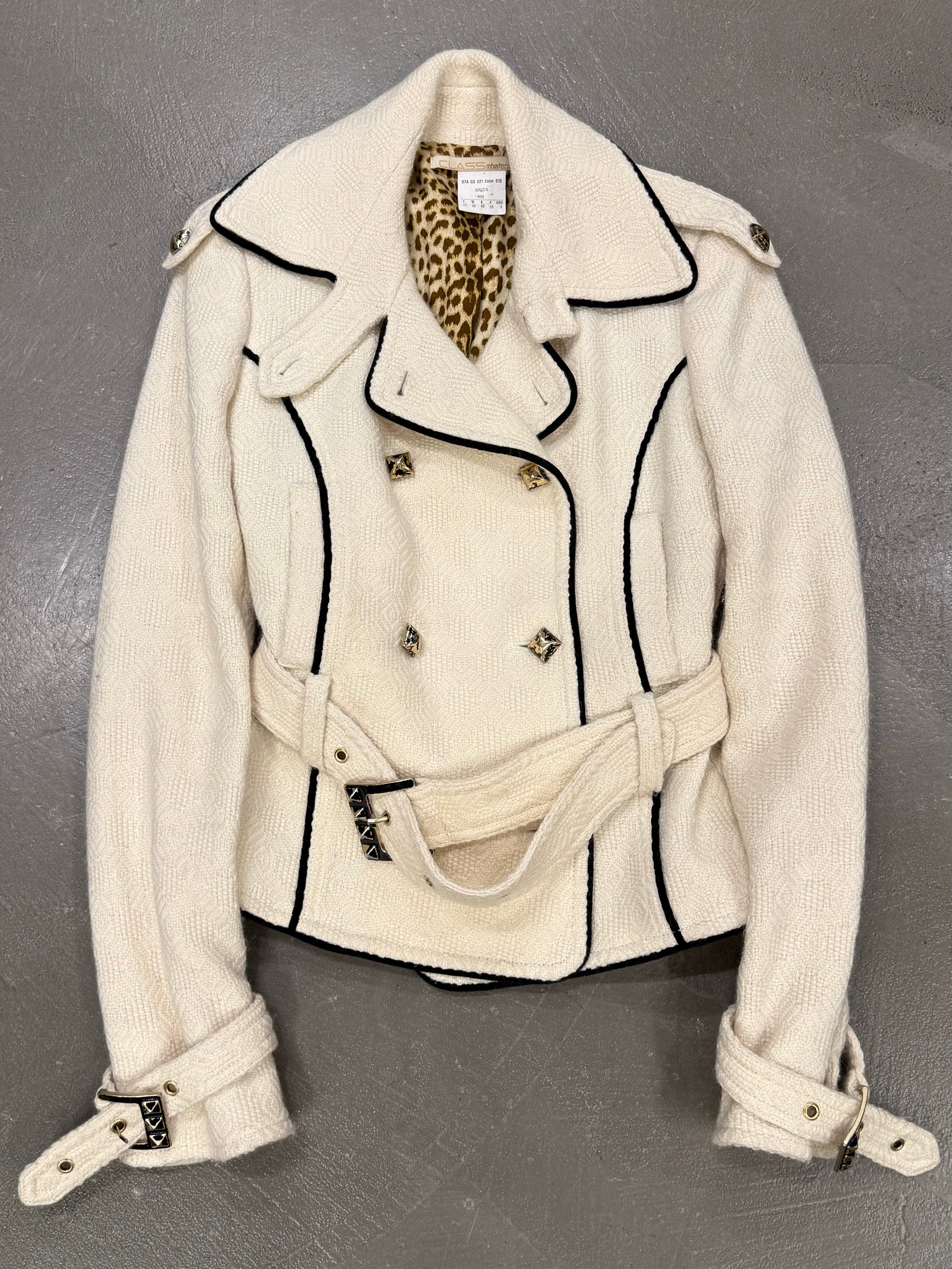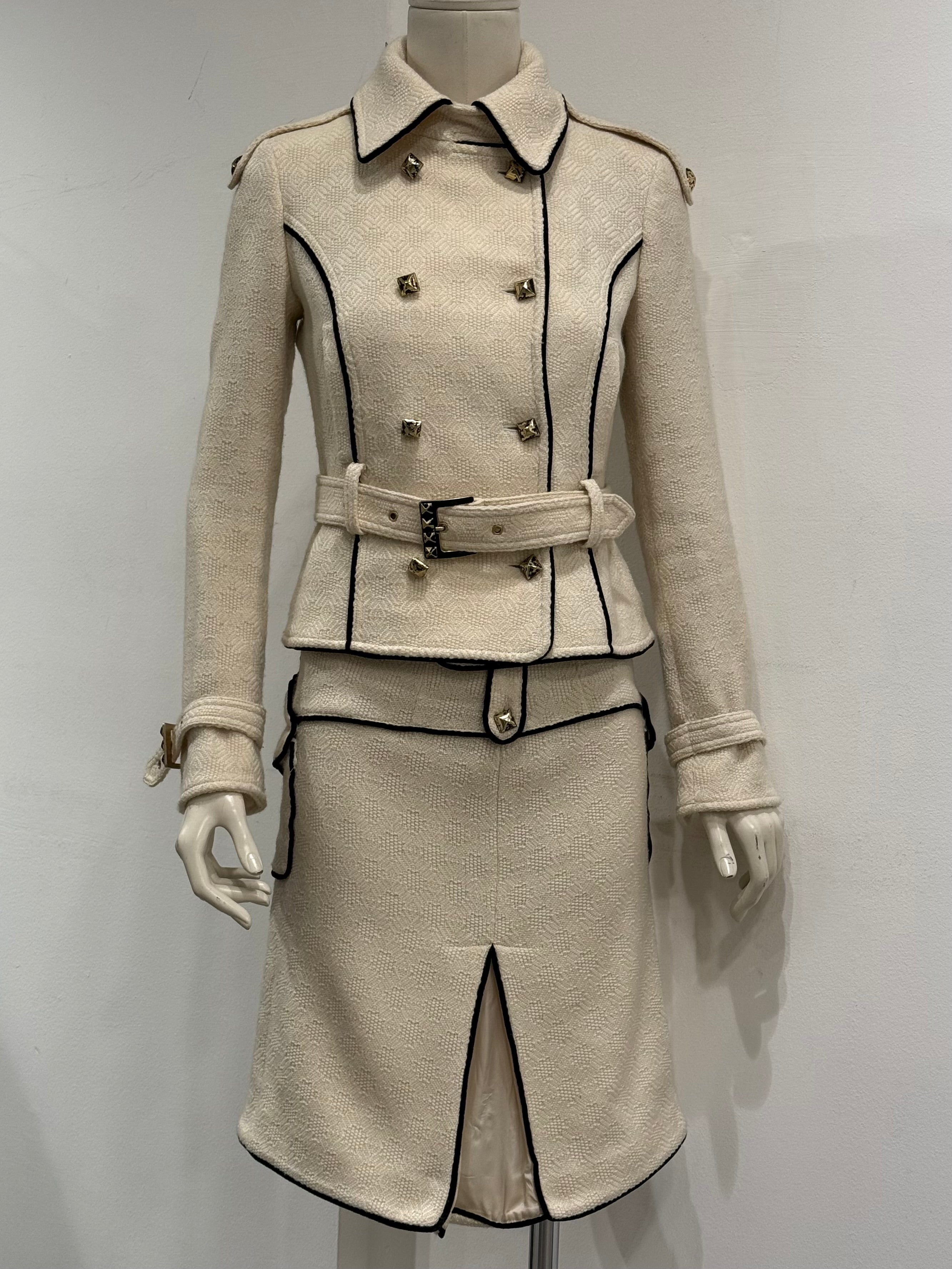 This early-2000s Roberto Cavalli tweed set embodies the brand’s refined yet sensual tailoring from the era. Crafted in a wool and polyamide blend, the jacket features a sharp, structured silhouette with belt detailing that defines the waist, while the matching skirt completes the look with a clean and elegant line. A cohesive archival set that balances classic tailoring with Cavalli’s distinctive feminine edge.