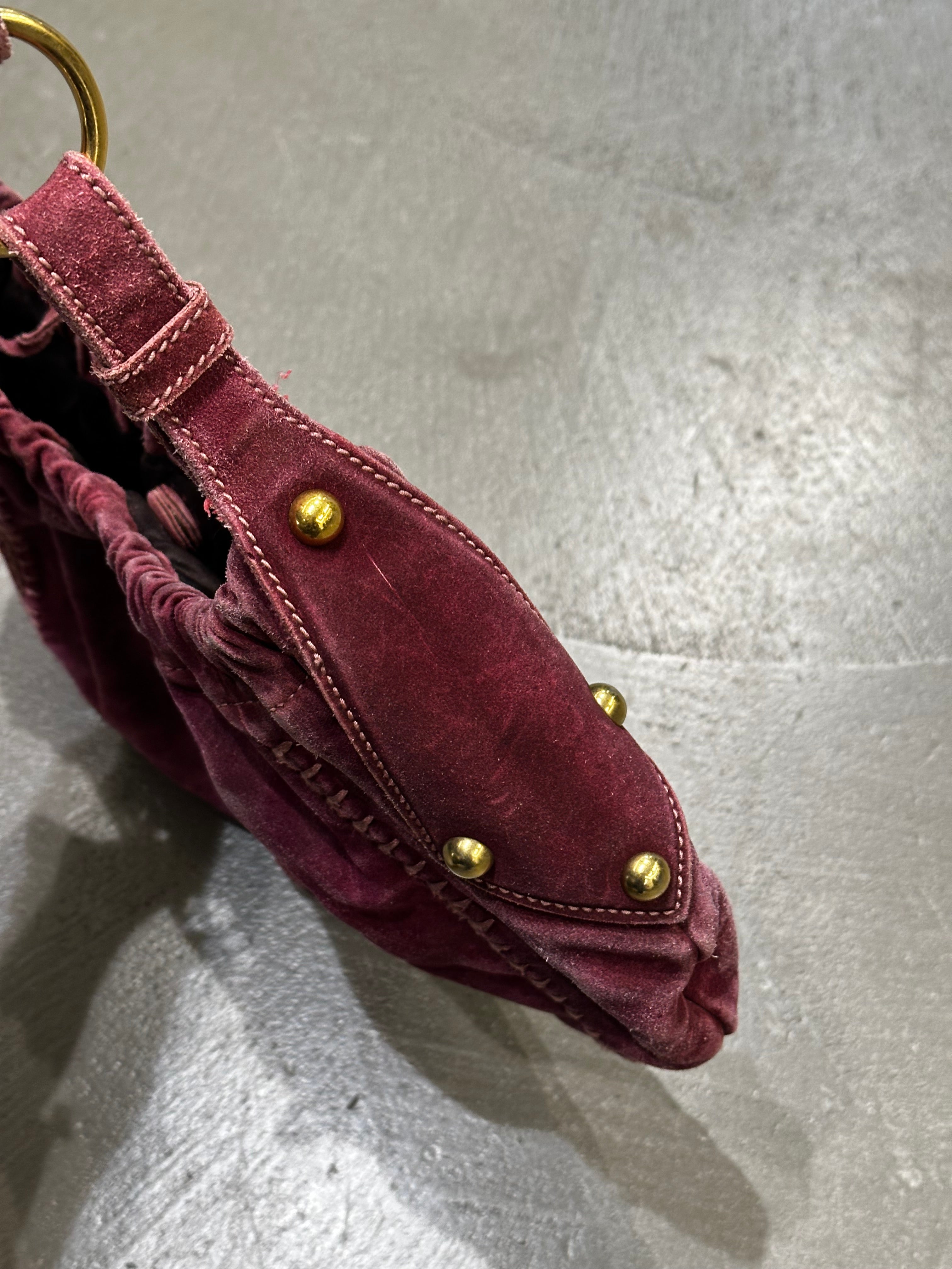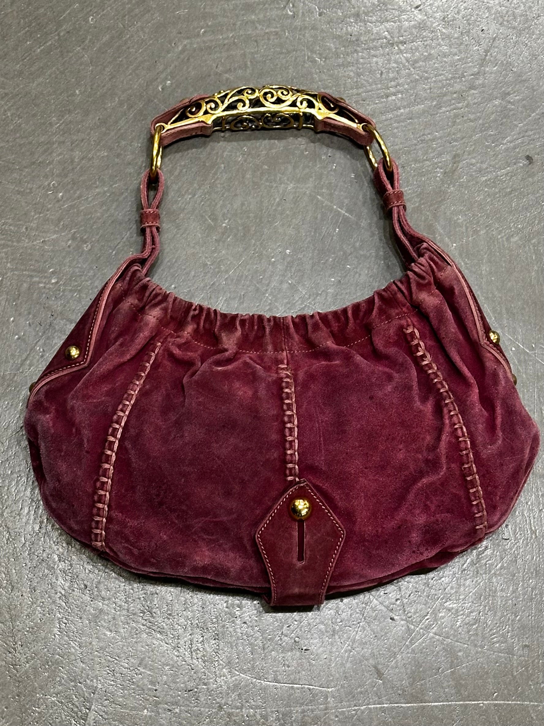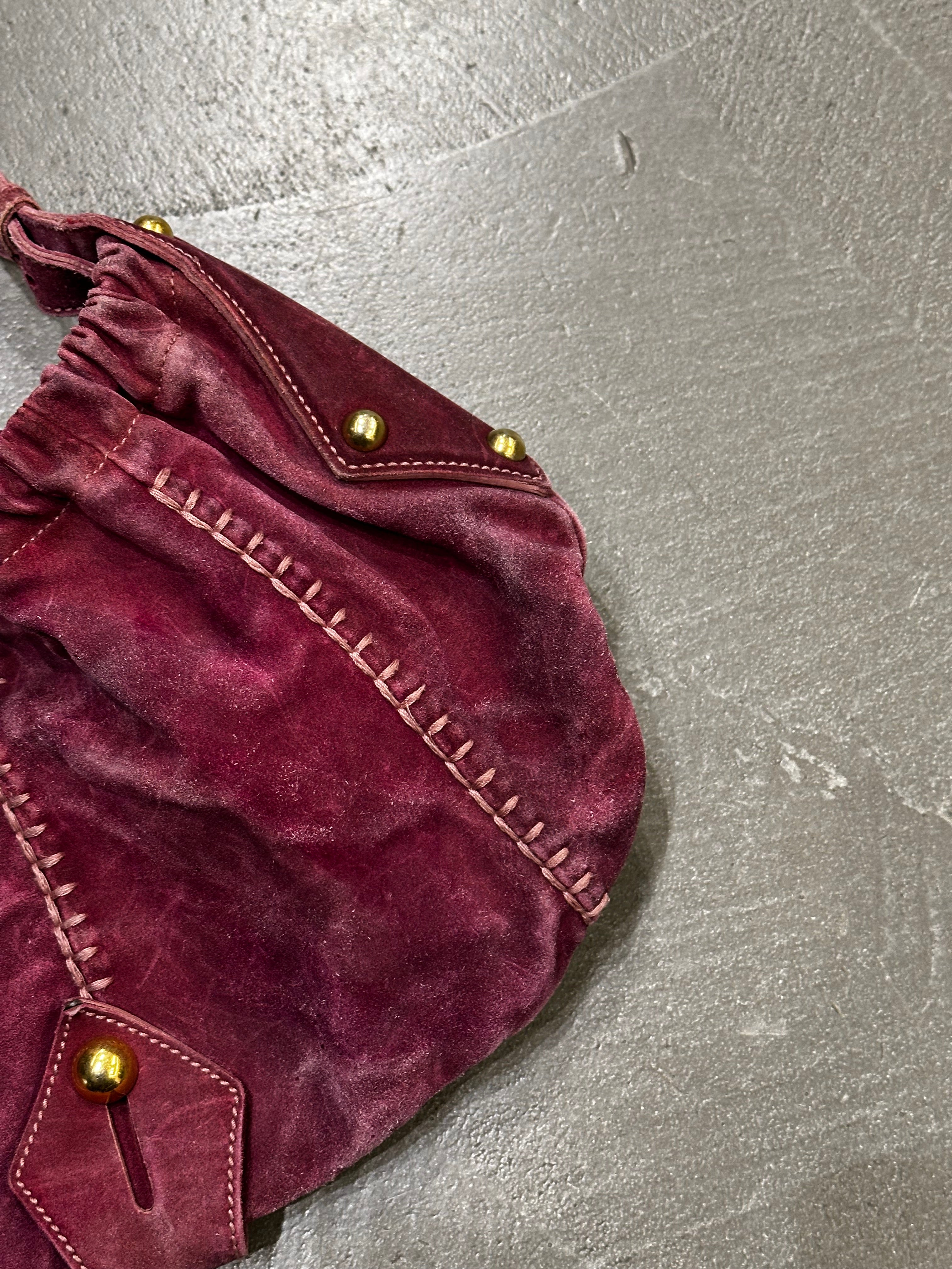 The rich suede leather enhances the tactile appeal of the piece, while the gathered construction and visible stitching emphasize its relaxed yet luxurious structure. The warm pink hue introduces a feminine softness that contrasts beautifully with the powerful, sculptural handle, resulting in a design that feels both daring and timeless. A true collector’s piece, the Mombasa remains a symbol of early-2000s glamour and confident, expressive design.
