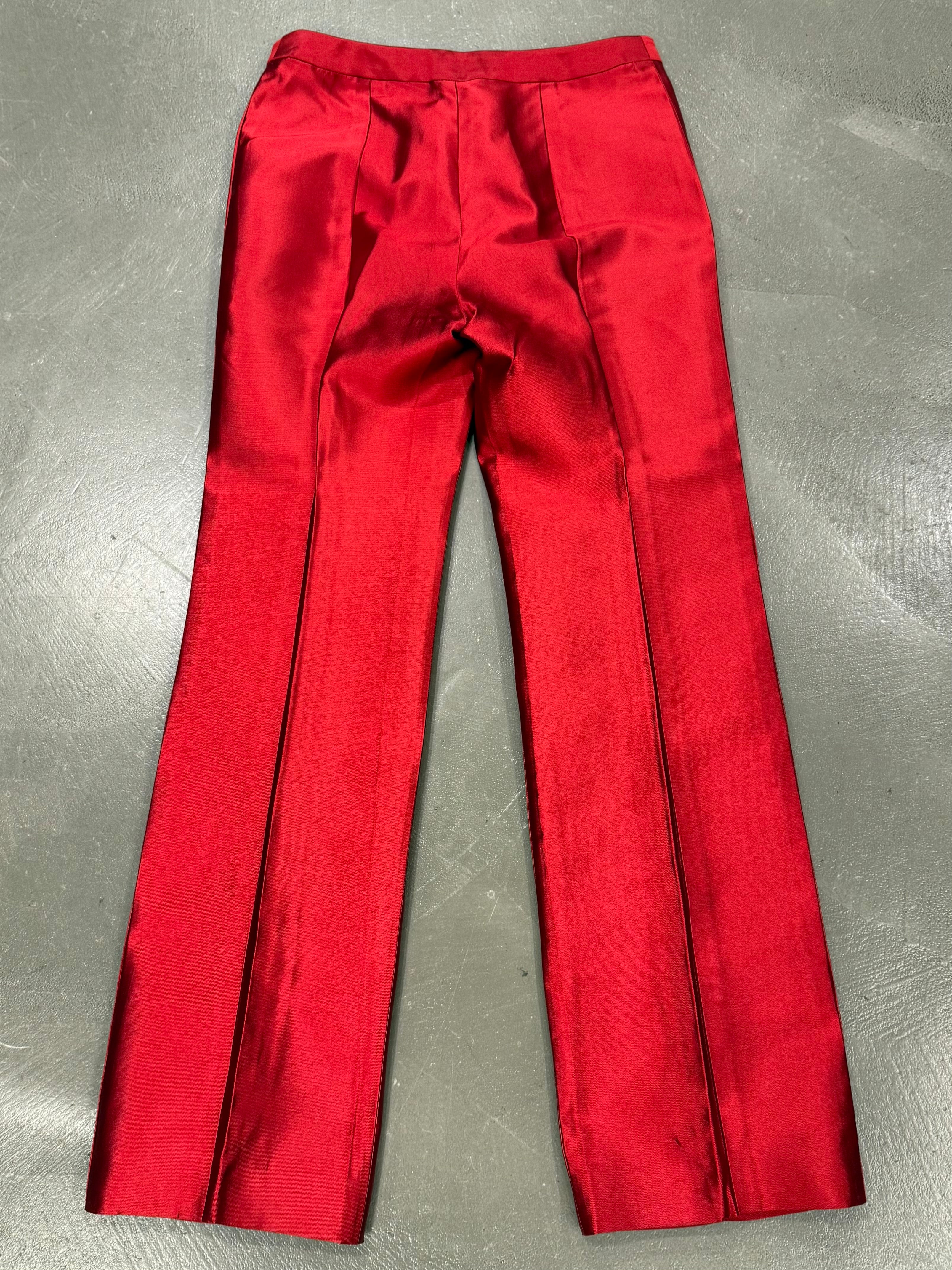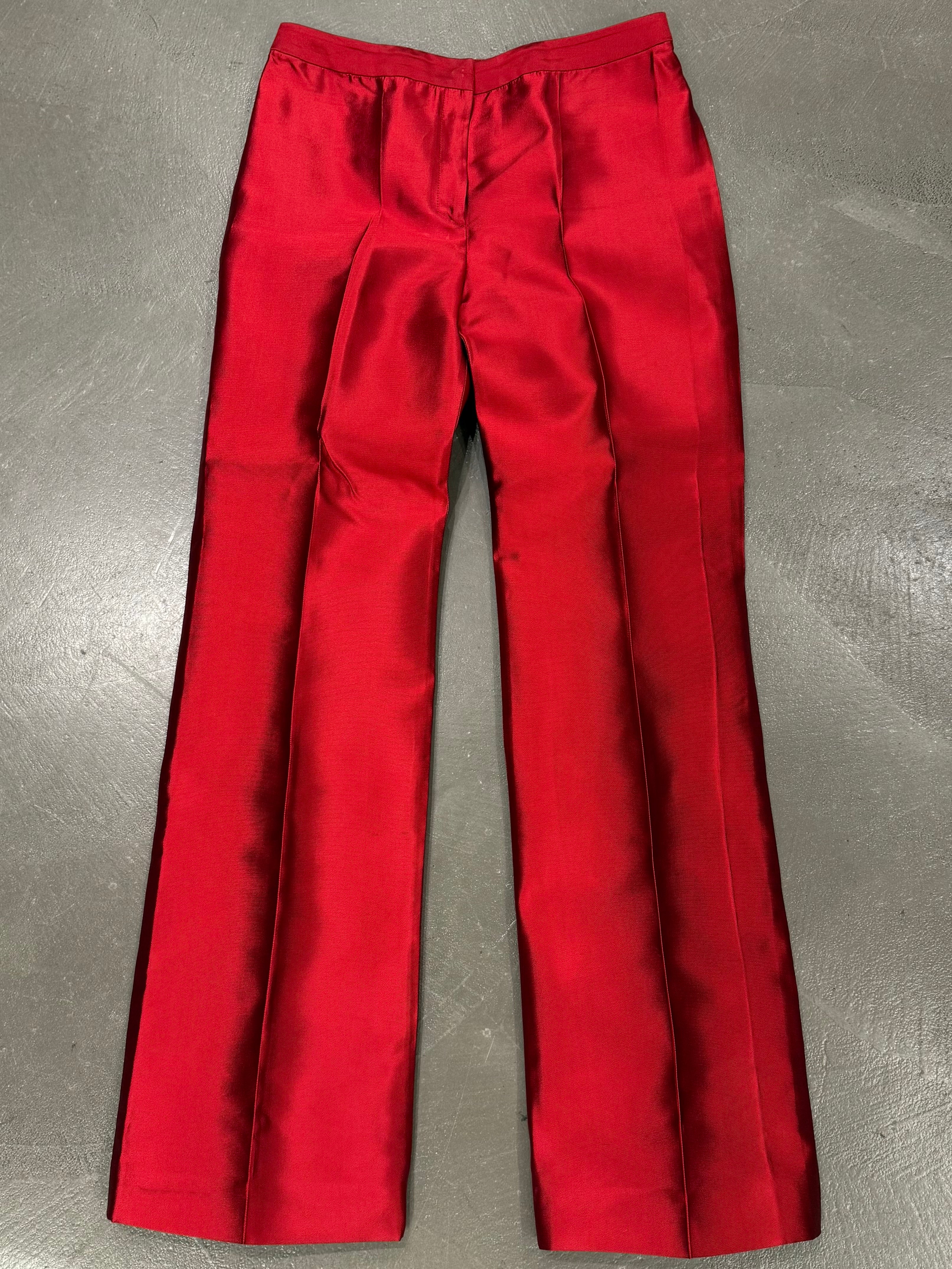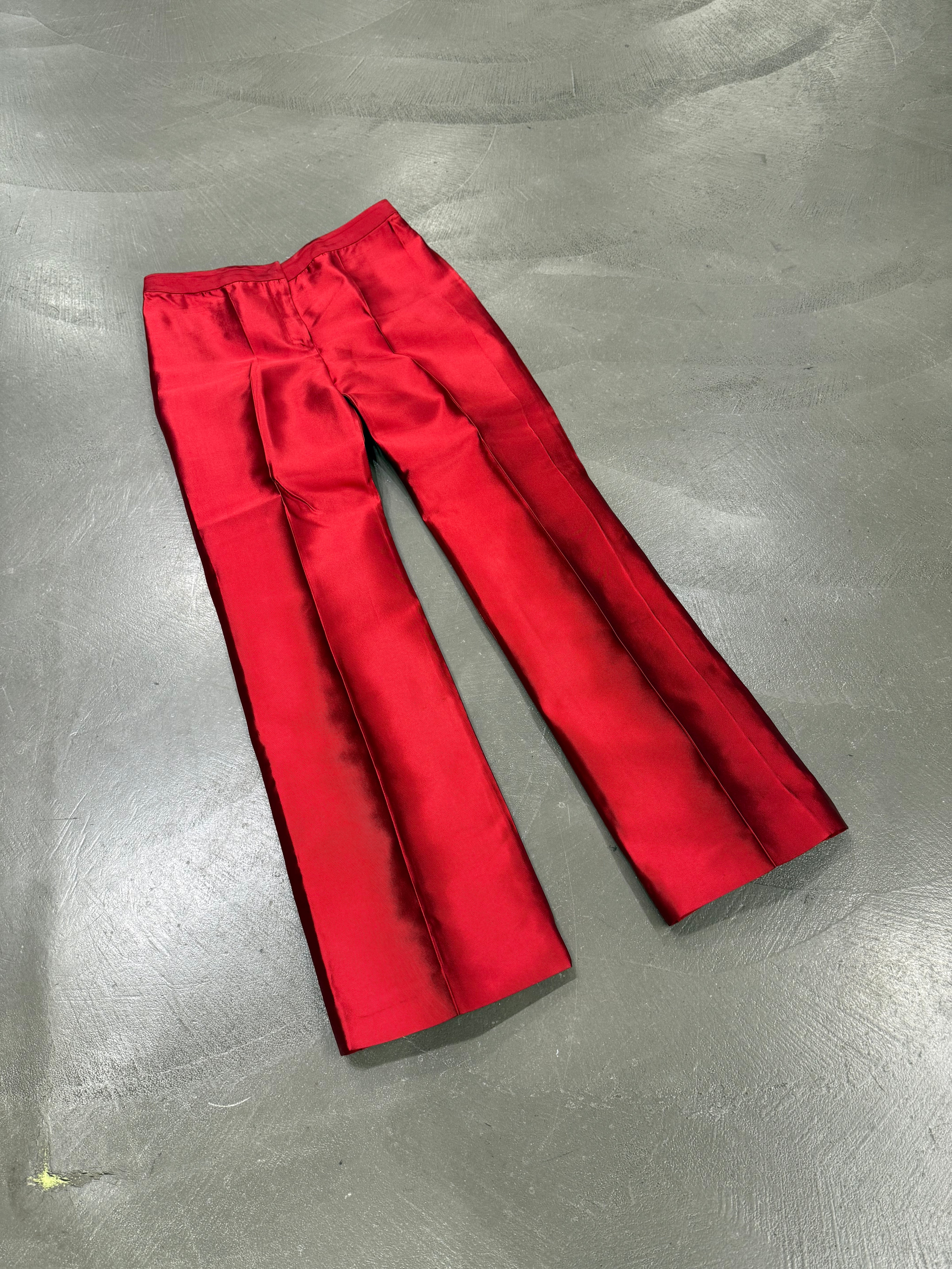 Iridescent silk pants from Gianni Versace’s 1990s production, featuring a flared cut and fluid drape. The vibrant sheen and sensual silhouette embody the bold glamour and expressive spirit that defined Versace during the decade.