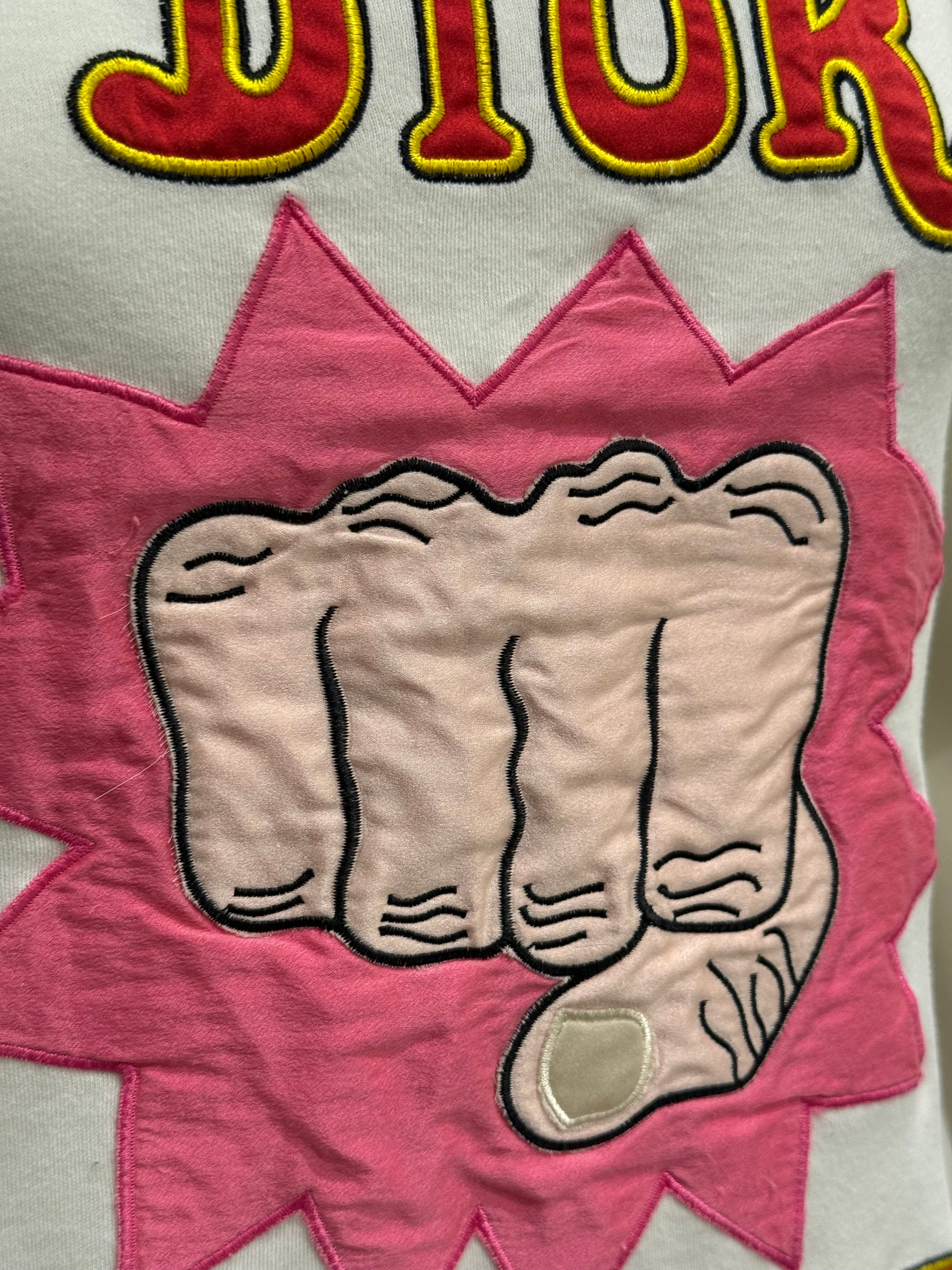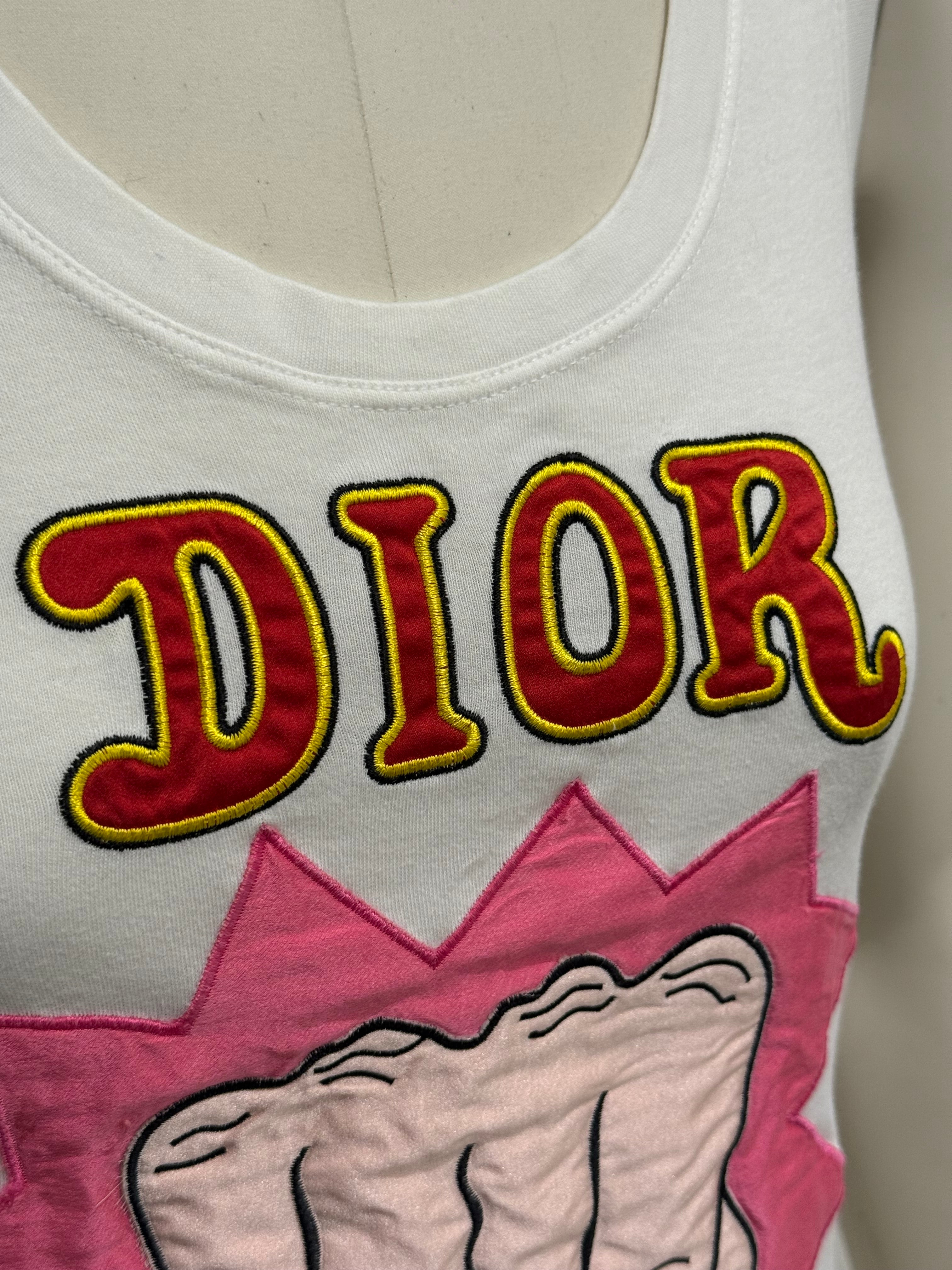 Runway piece from John Galliano’s early-2000s Dior era, featuring the bold “Dior Not War” graphic print. Constructed in soft white poly fabric with a fitted cut and ribbed neckline, encapsulating Galliano’s provocative blend of glamour and political pop culture references.