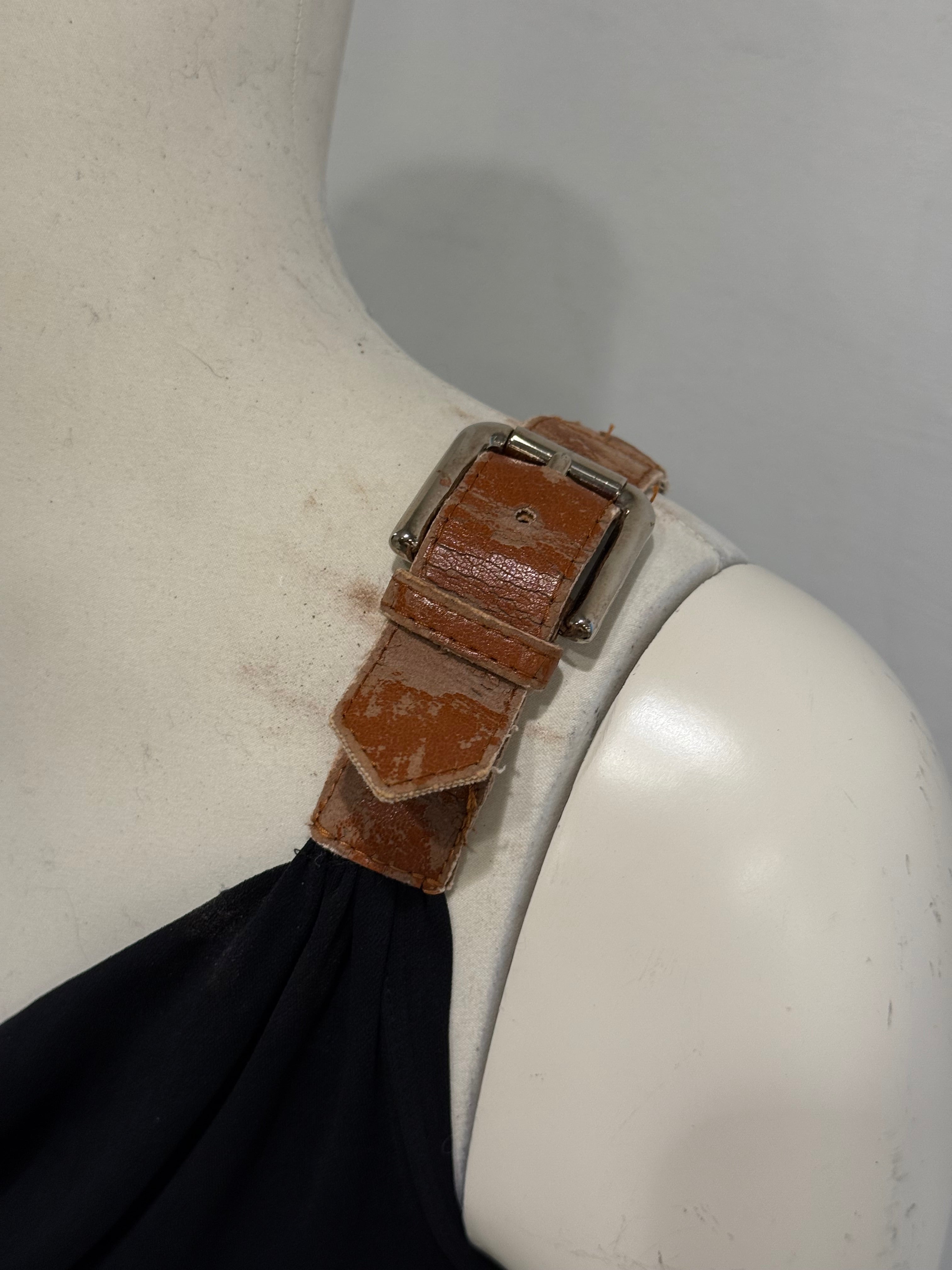 This Dolce & Gabbana tank top from the Spring/Summer 2003 runway collection is crafted from lightweight viscose with an intricate button detailing throughout the front. Its fitted silhouette and sharp cut embody the sensual yet structured aesthetic of early-2000s Dolce & Gabbana. A rare piece that captures the brand’s iconic era of bold femininity.