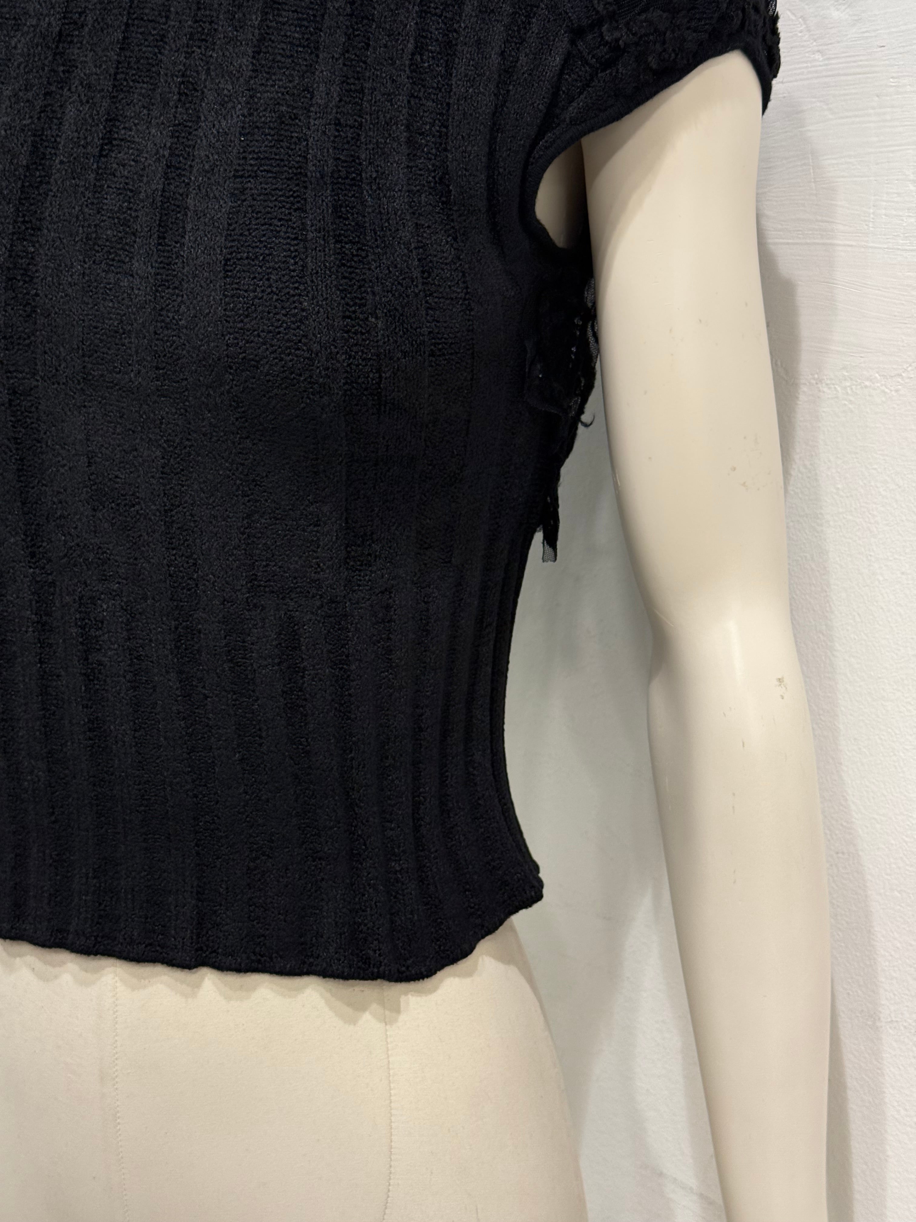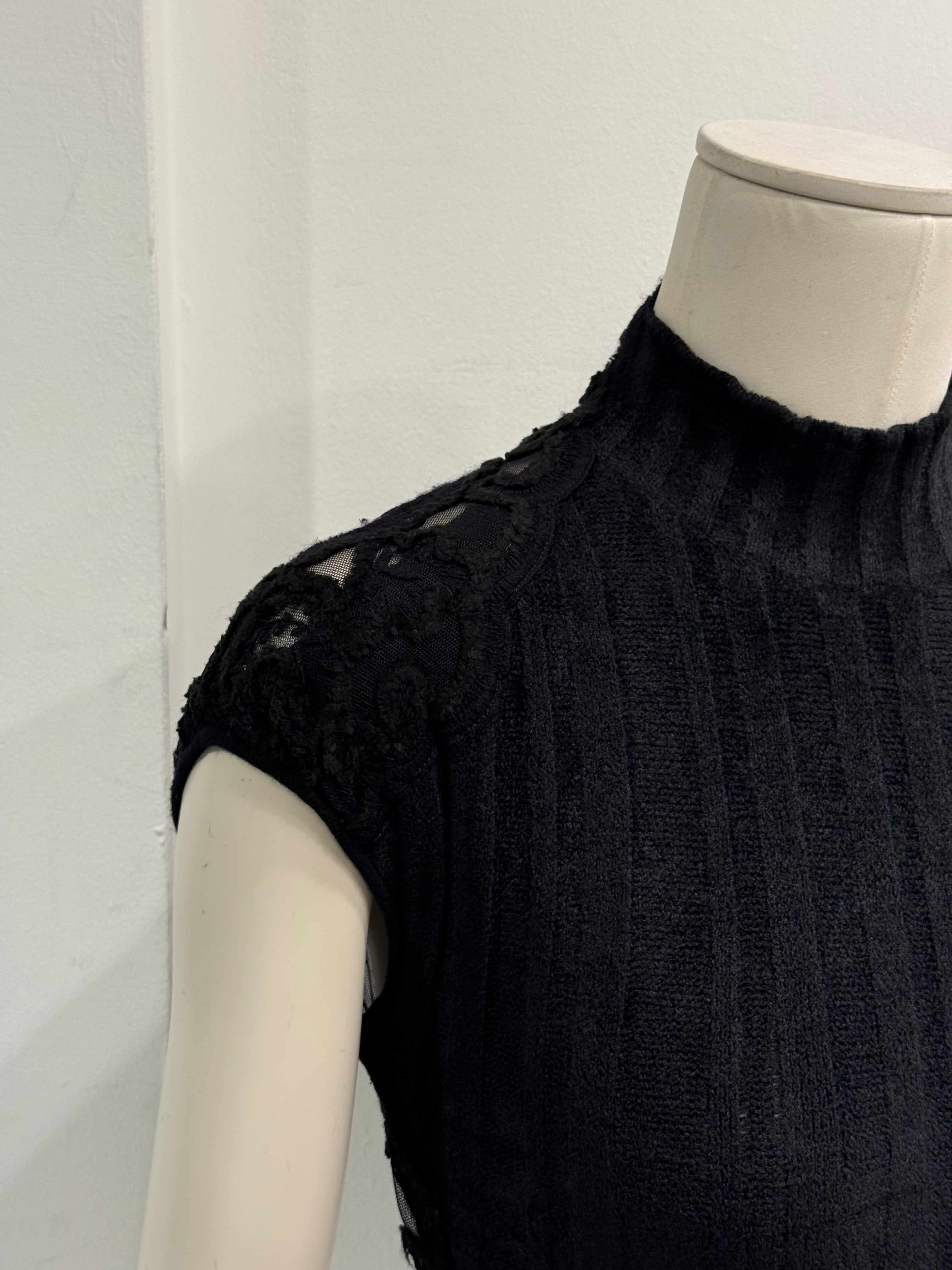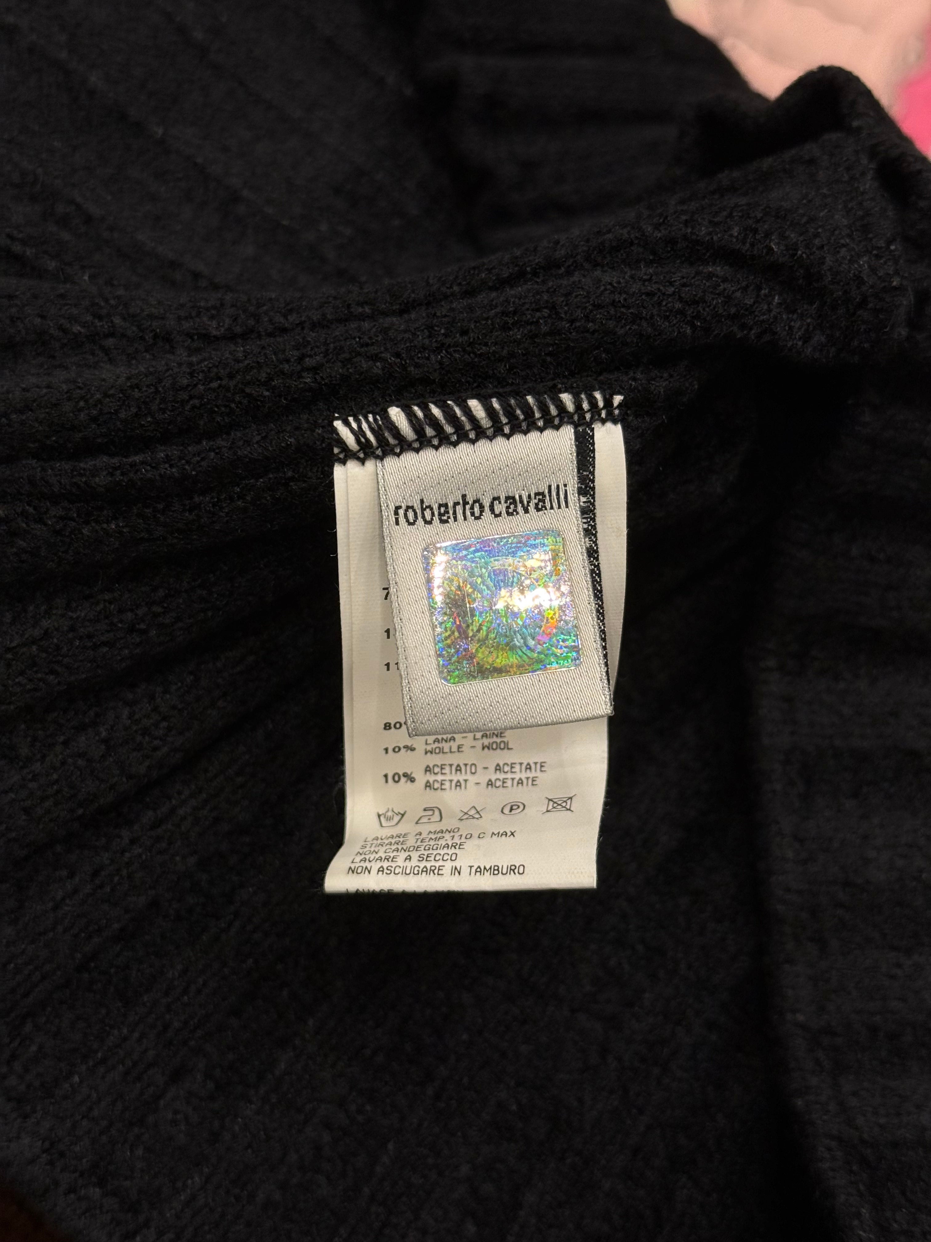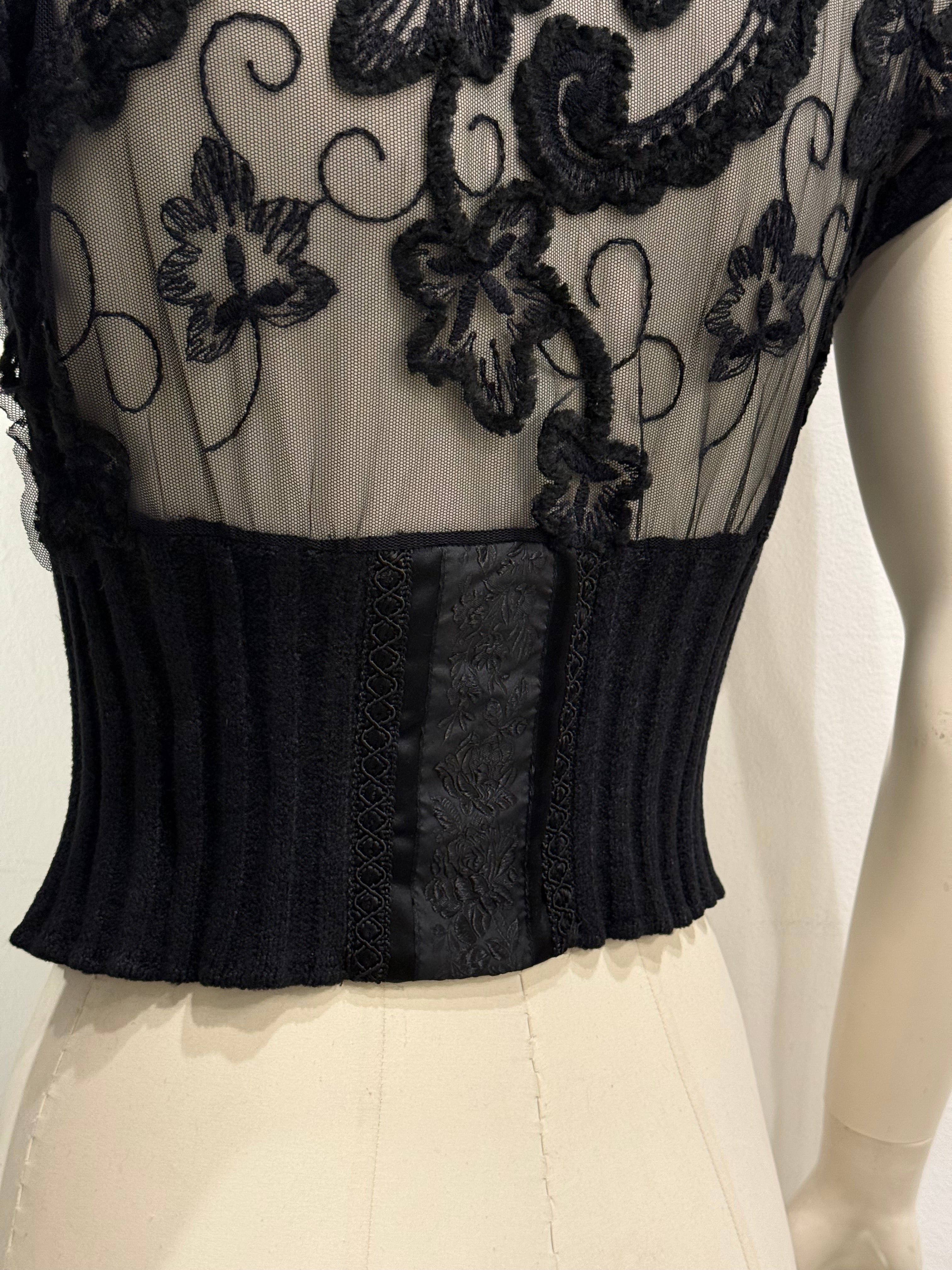 Delicate 2000s Roberto Cavalli cropped top crafted in black lace and viscose blend. Features a high neckline, sheer floral pattern, and fitted waist panel — a sensual and feminine design reflecting Cavalli’s signature blend of elegance and boldness from the early 2000s.