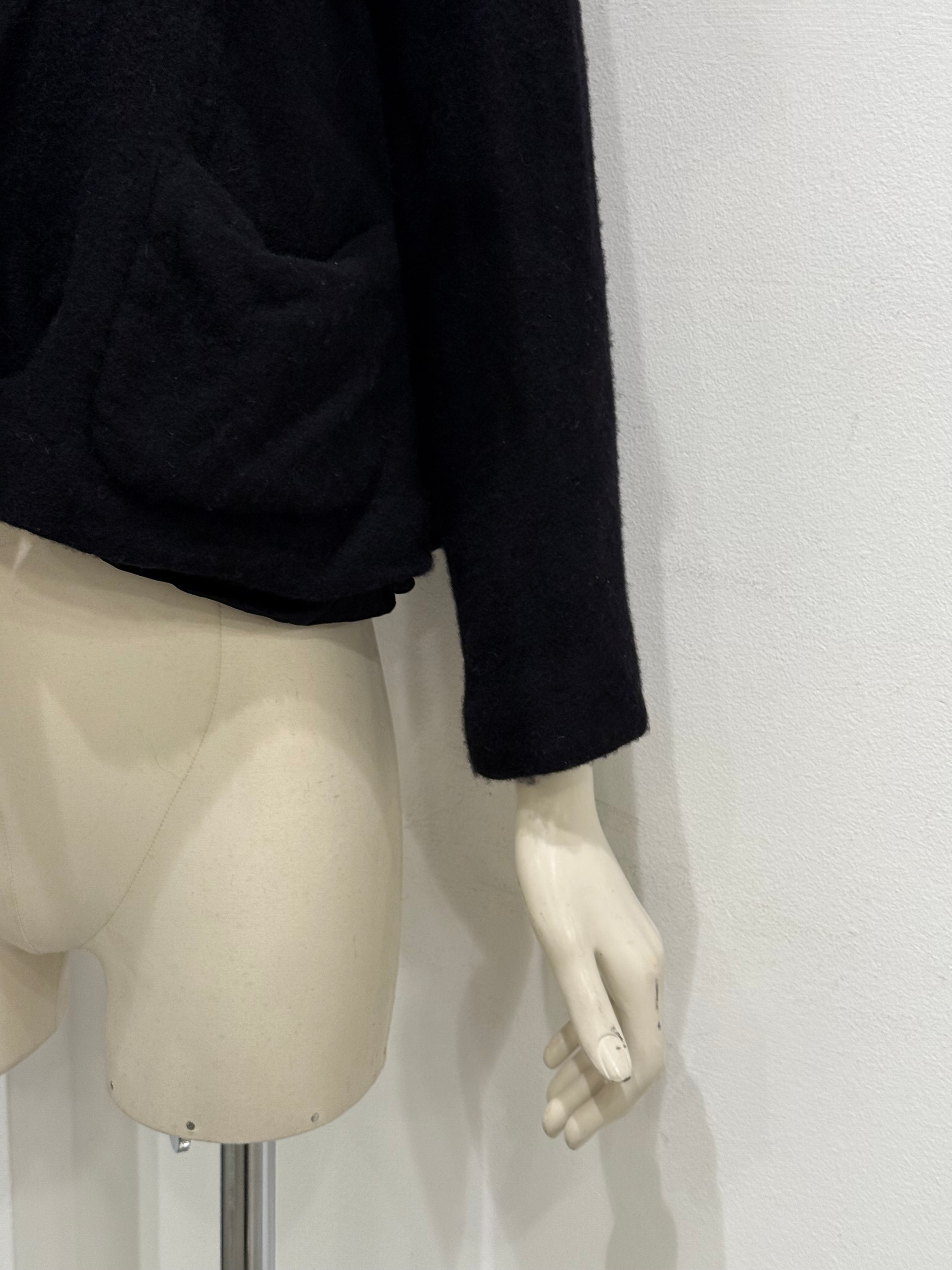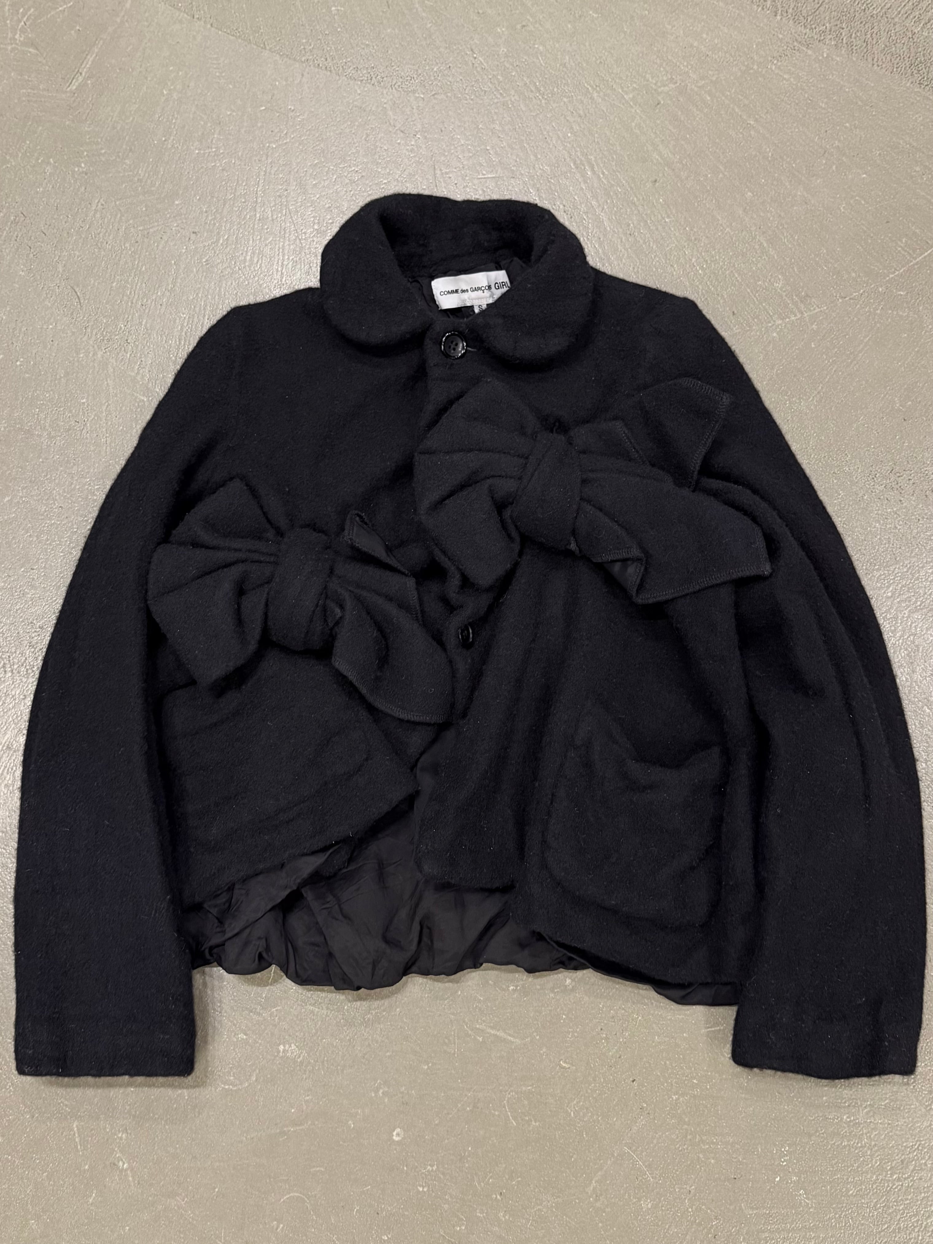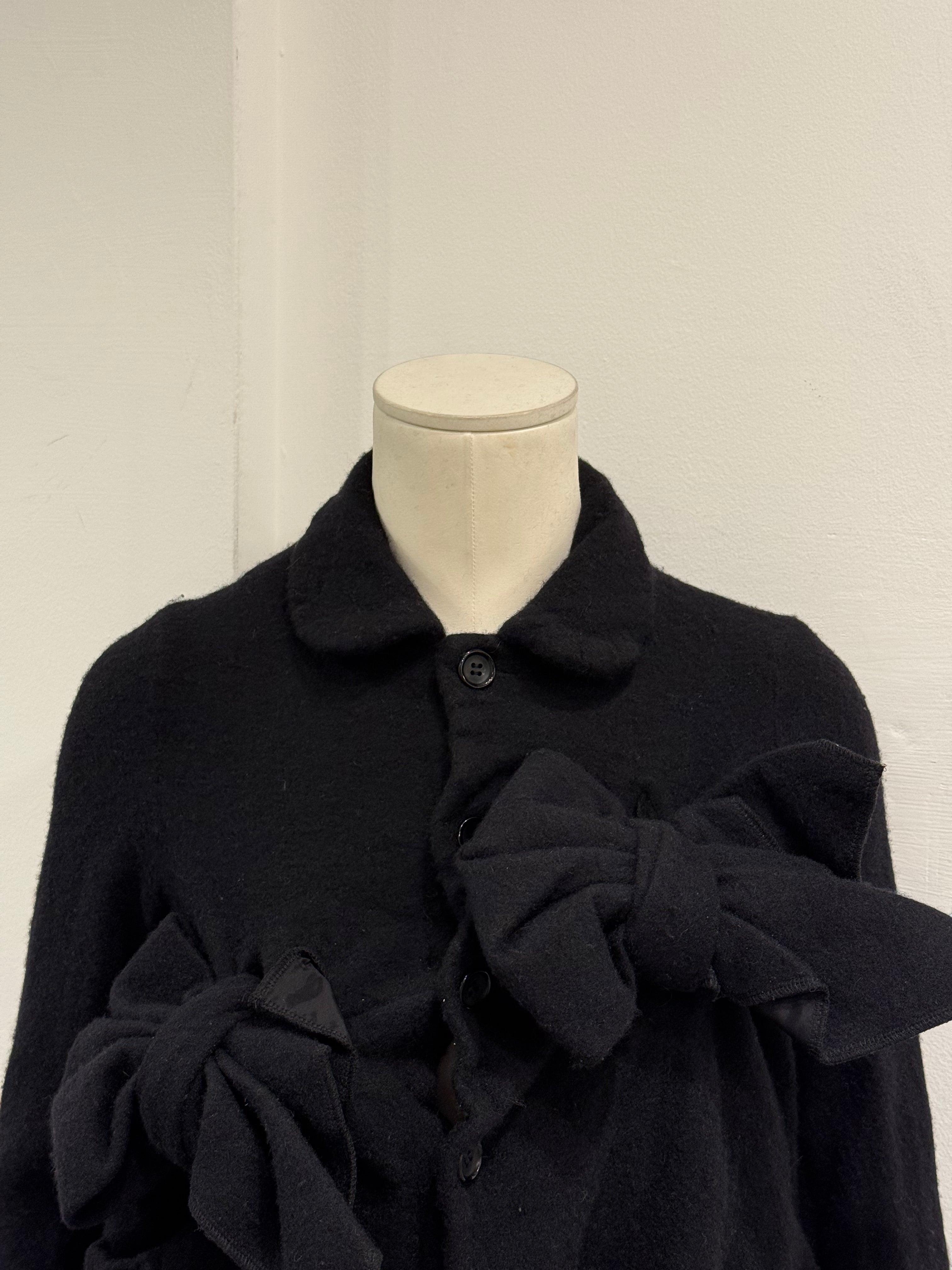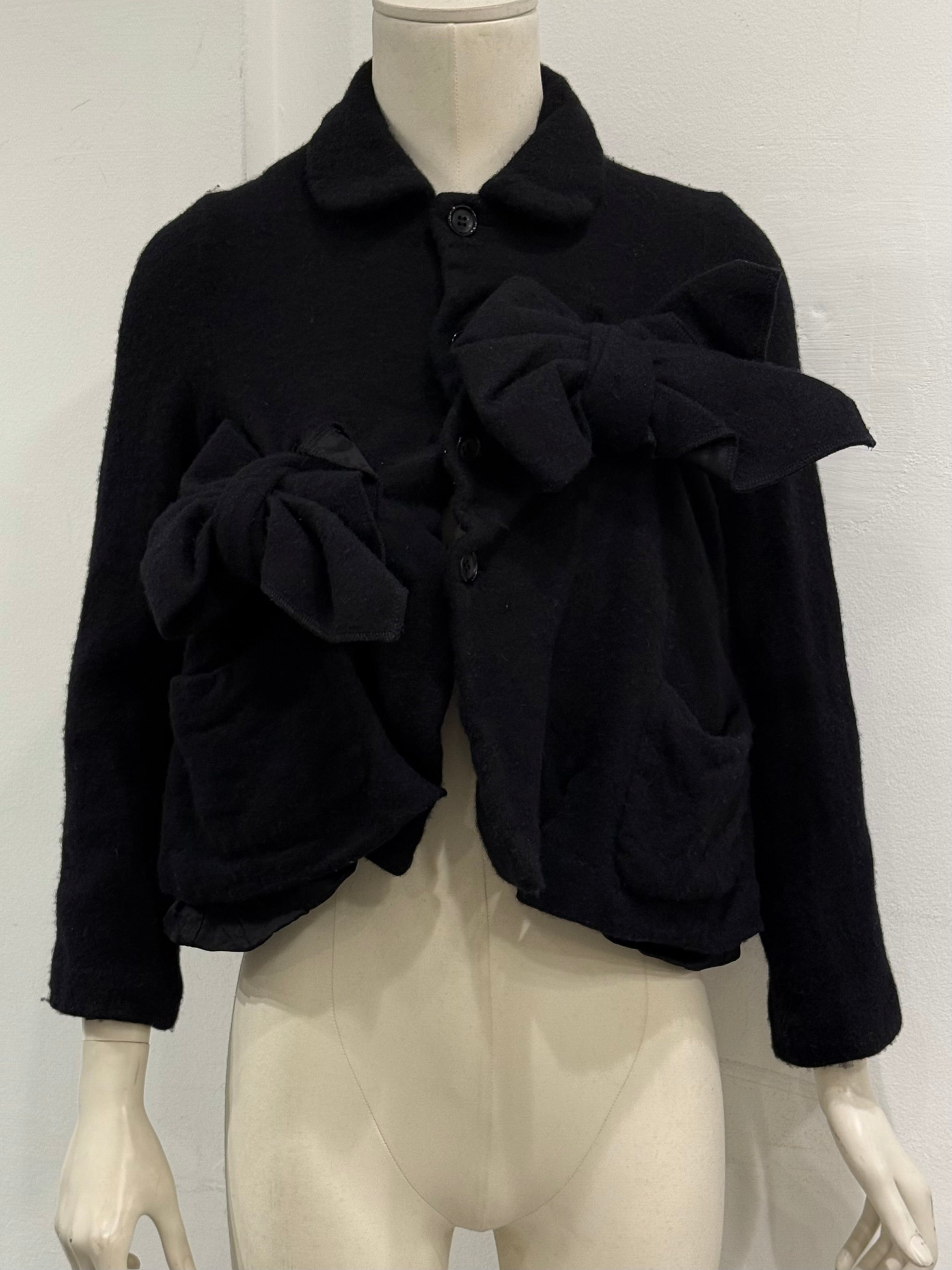 This 2020s Comme des Garçons jacket features the label’s iconic deconstructed vocabulary, with knotted fabric sculptures integrated into the front panel. The asymmetric structure, unexpected volume, and wool construction embody Rei Kawakubo’s avant-garde experimentation.