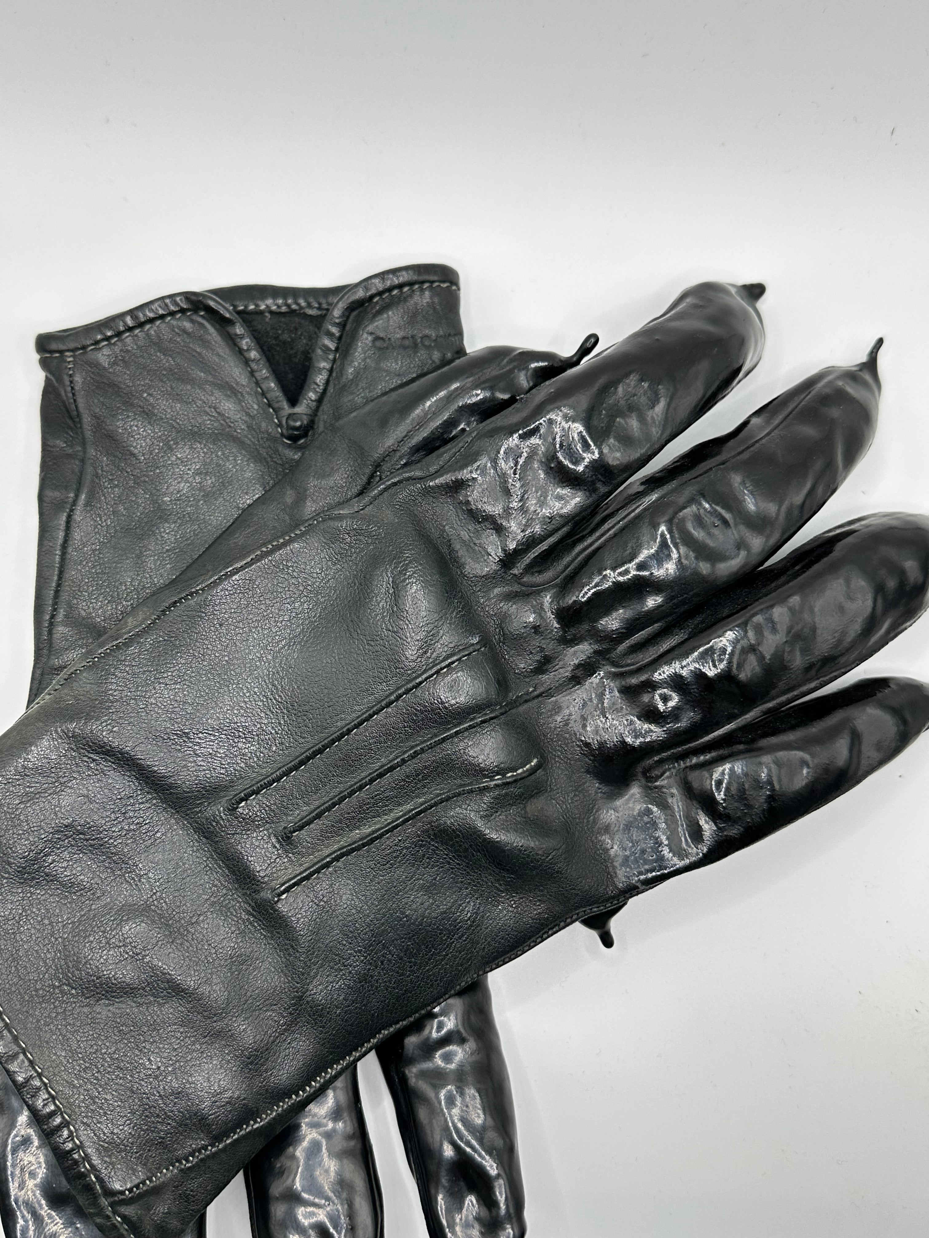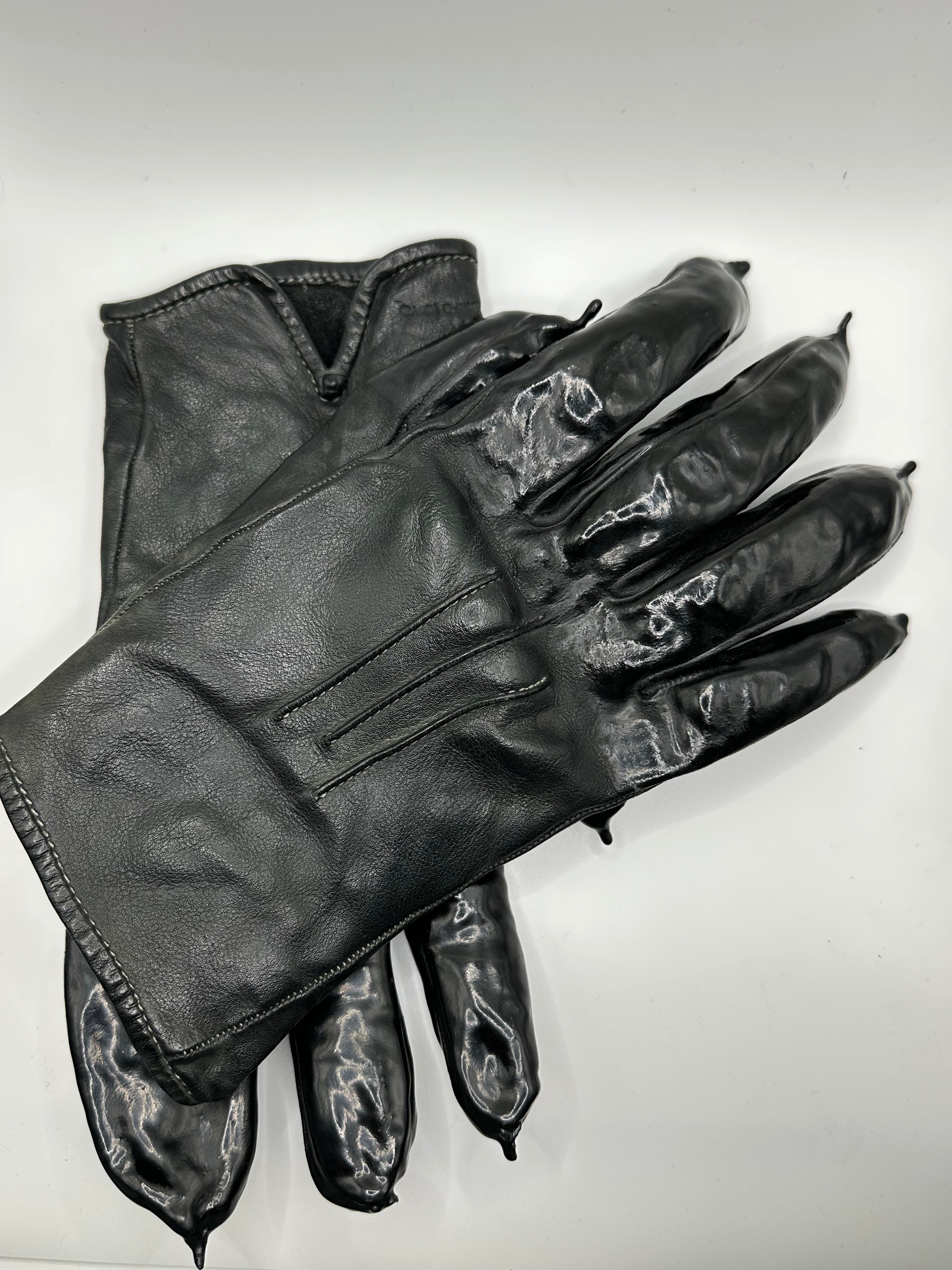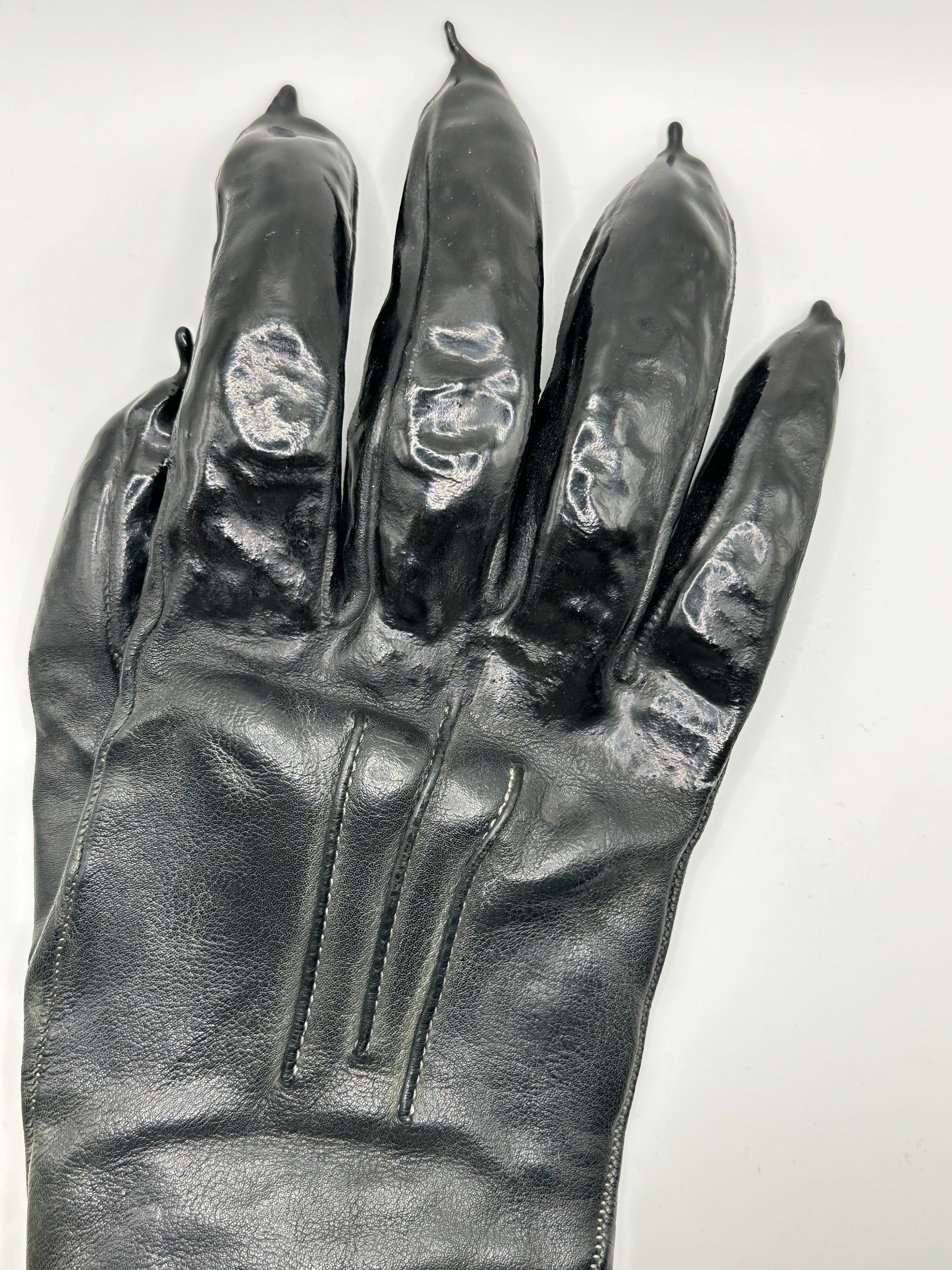 These Carol Christian Poell gloves are crafted from leather with an experimental “drip” treatment, creating an organic, almost liquid-like texture. A highly distinctive piece that reflects the designer’s avant-garde craftsmanship and material exploration.