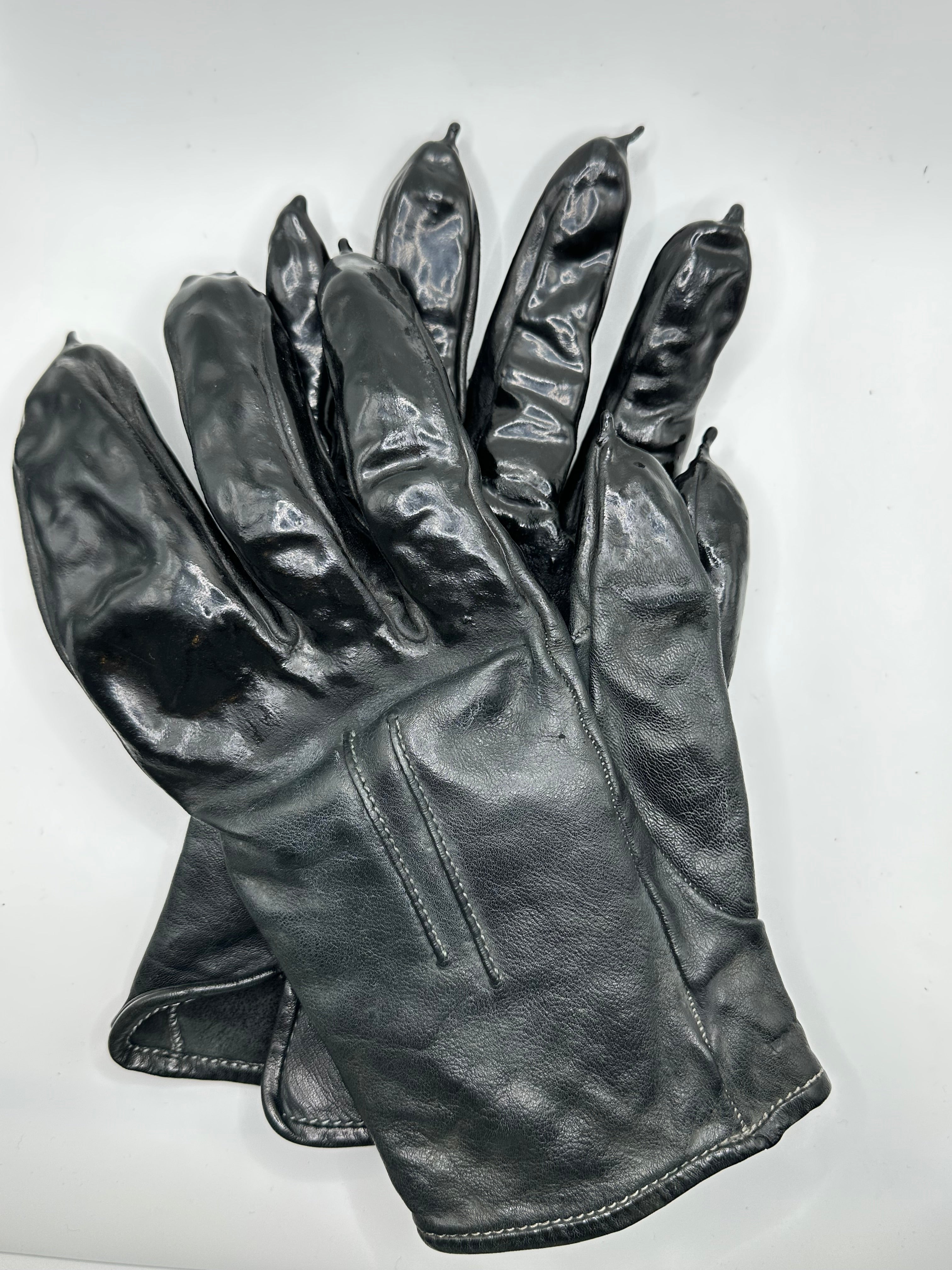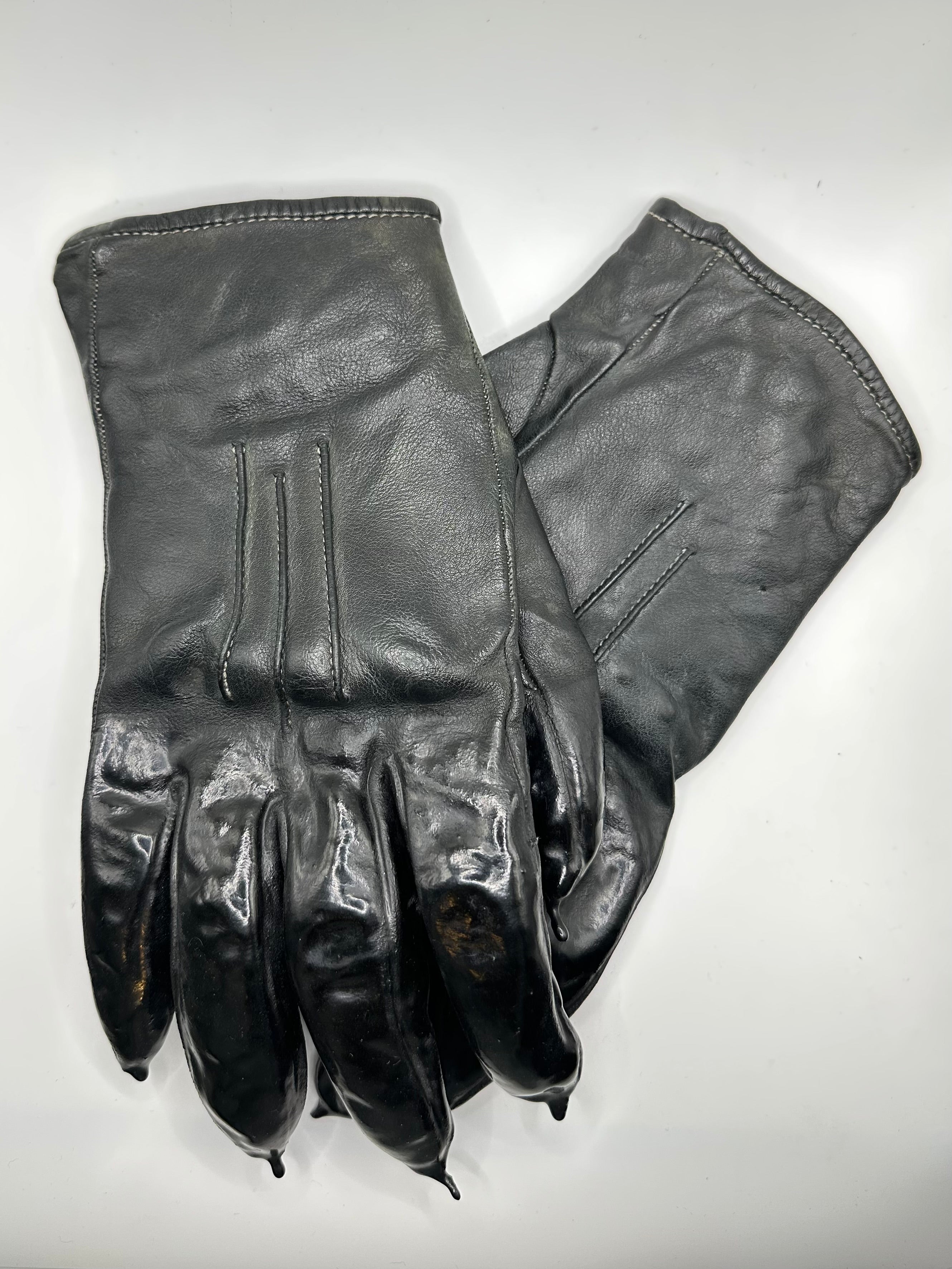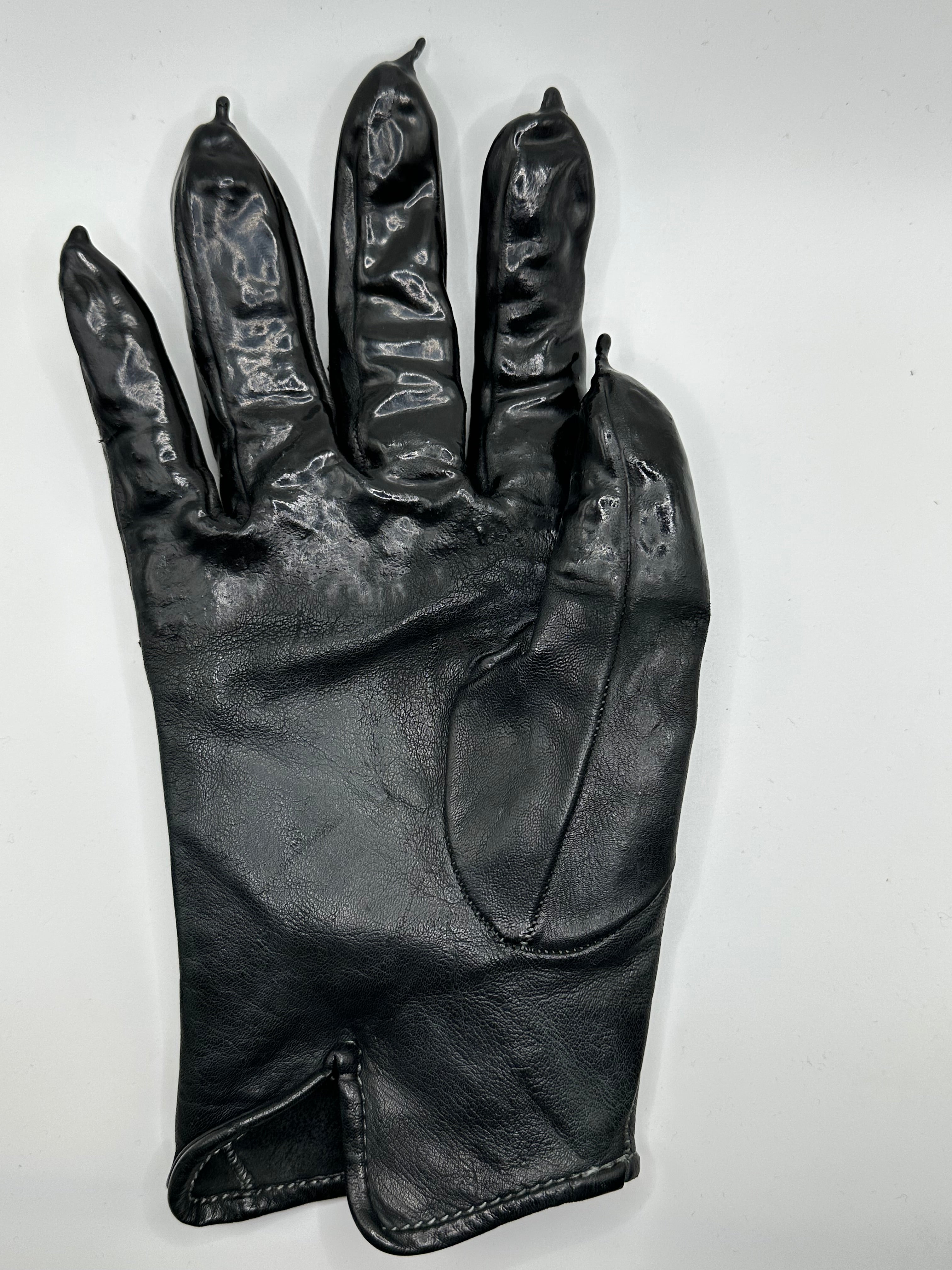 These Carol Christian Poell gloves are crafted from leather with an experimental “drip” treatment, creating an organic, almost liquid-like texture. A highly distinctive piece that reflects the designer’s avant-garde craftsmanship and material exploration.