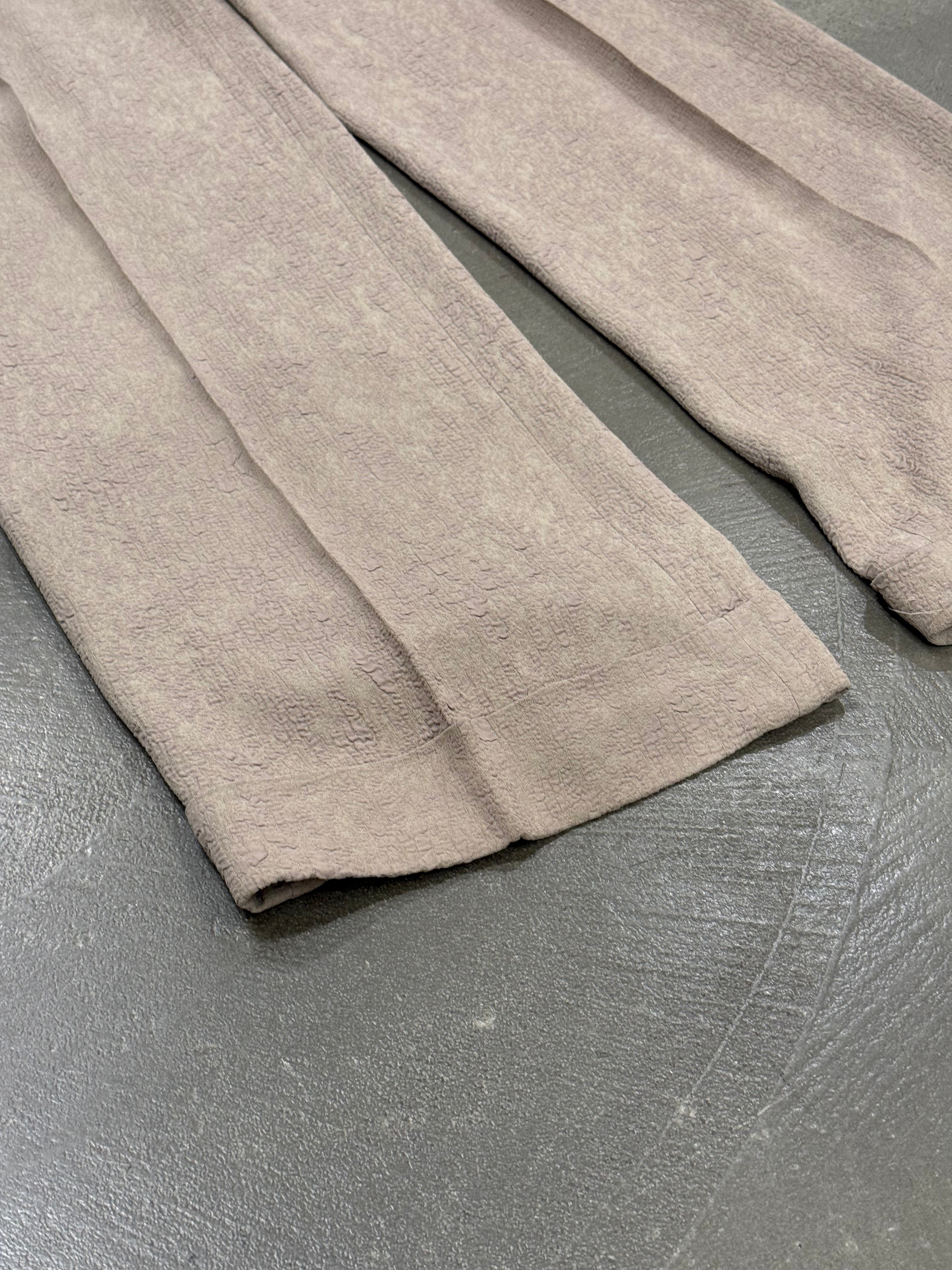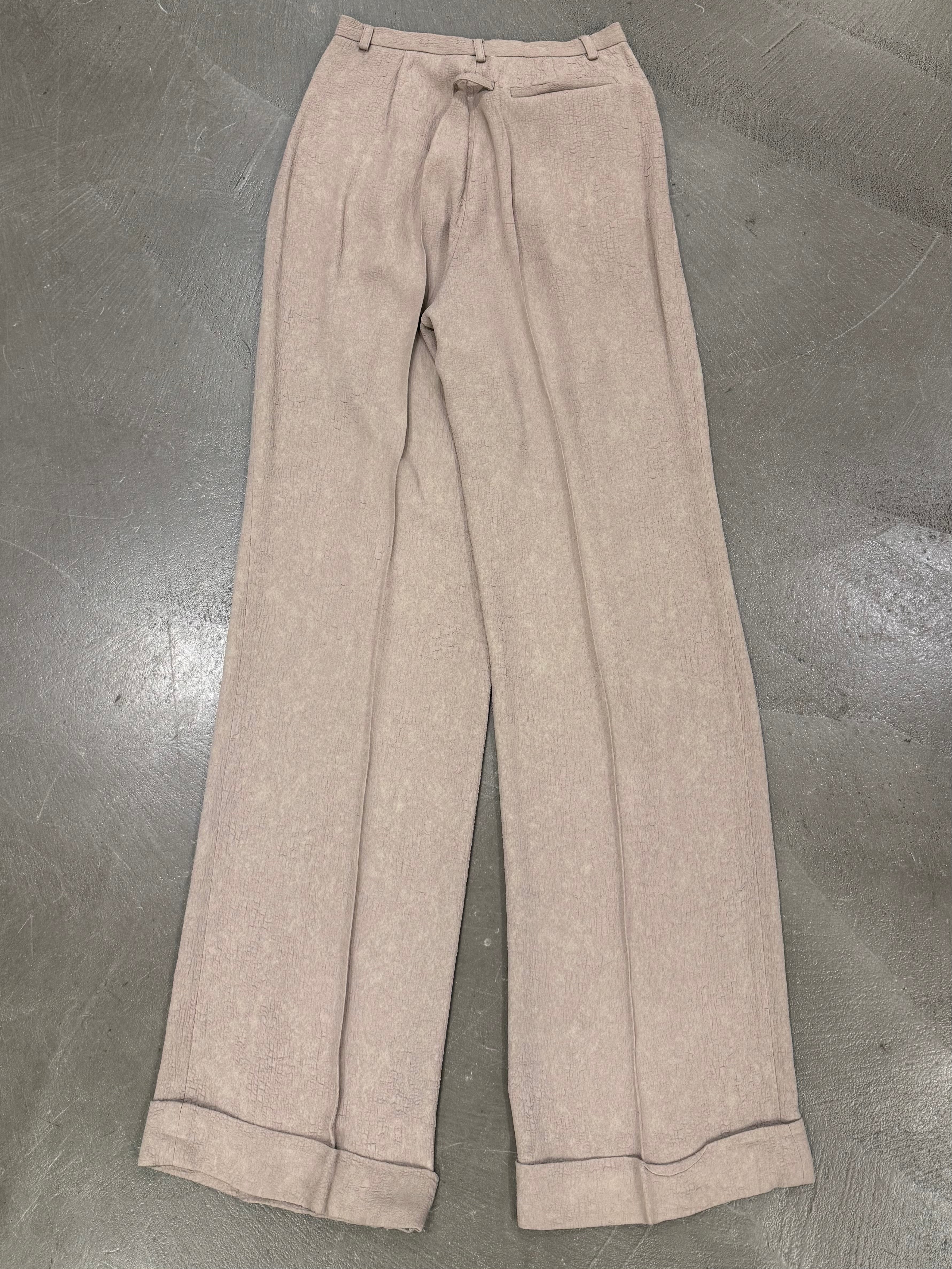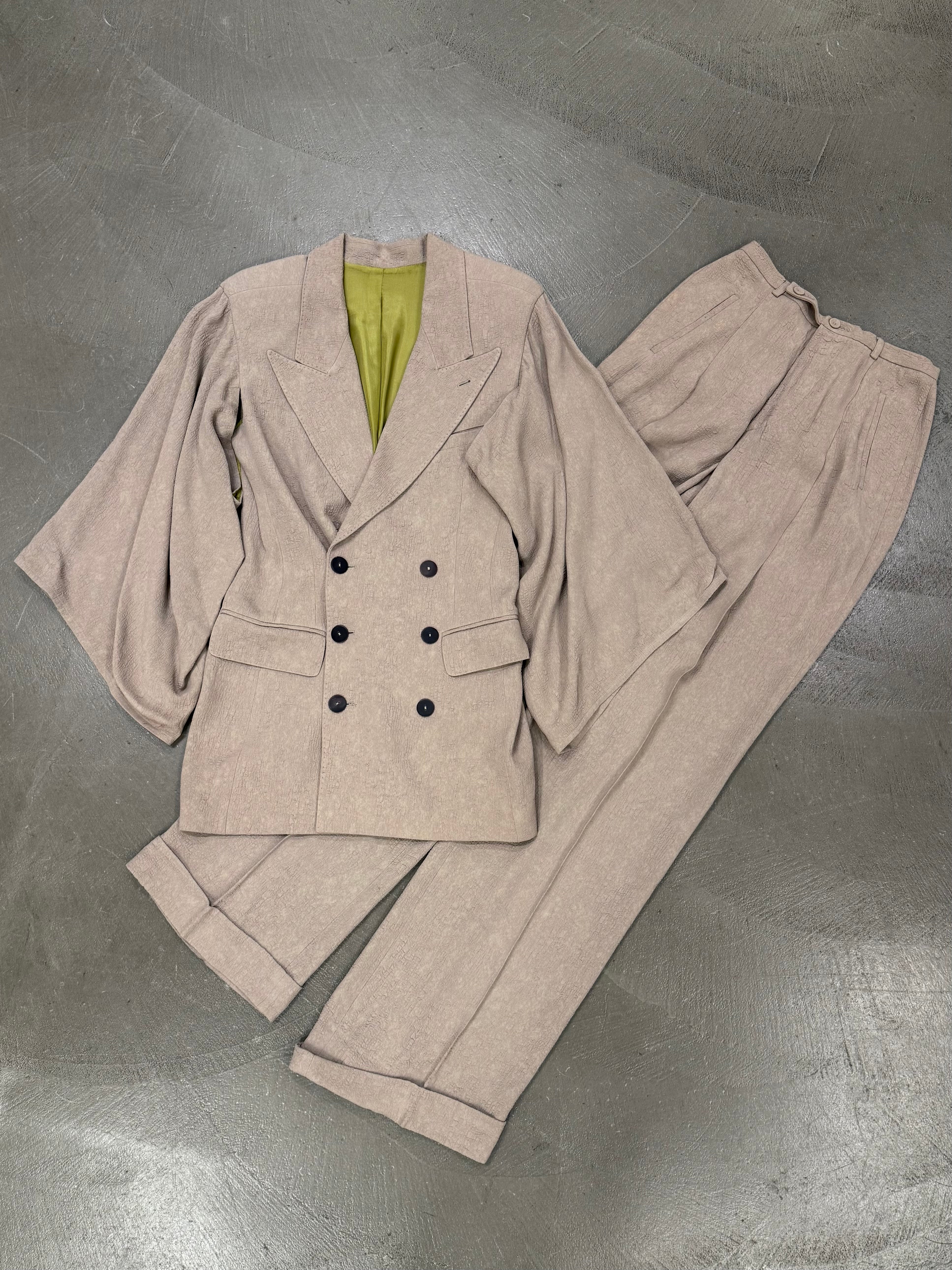This early-2000s Jean Paul Gaultier set showcases the designer’s experimental approach to texture and proportion. Crafted in rayon with a distinctive “wrinkle skin” finish, the jacket features wide, sculptural sleeves and a sharply tailored waist, creating a dramatic yet structured silhouette. The matching pants balance the look with a clean line and subtle flare, resulting in a cohesive archival ensemble that captures Gaultier’s avant-garde elegance.