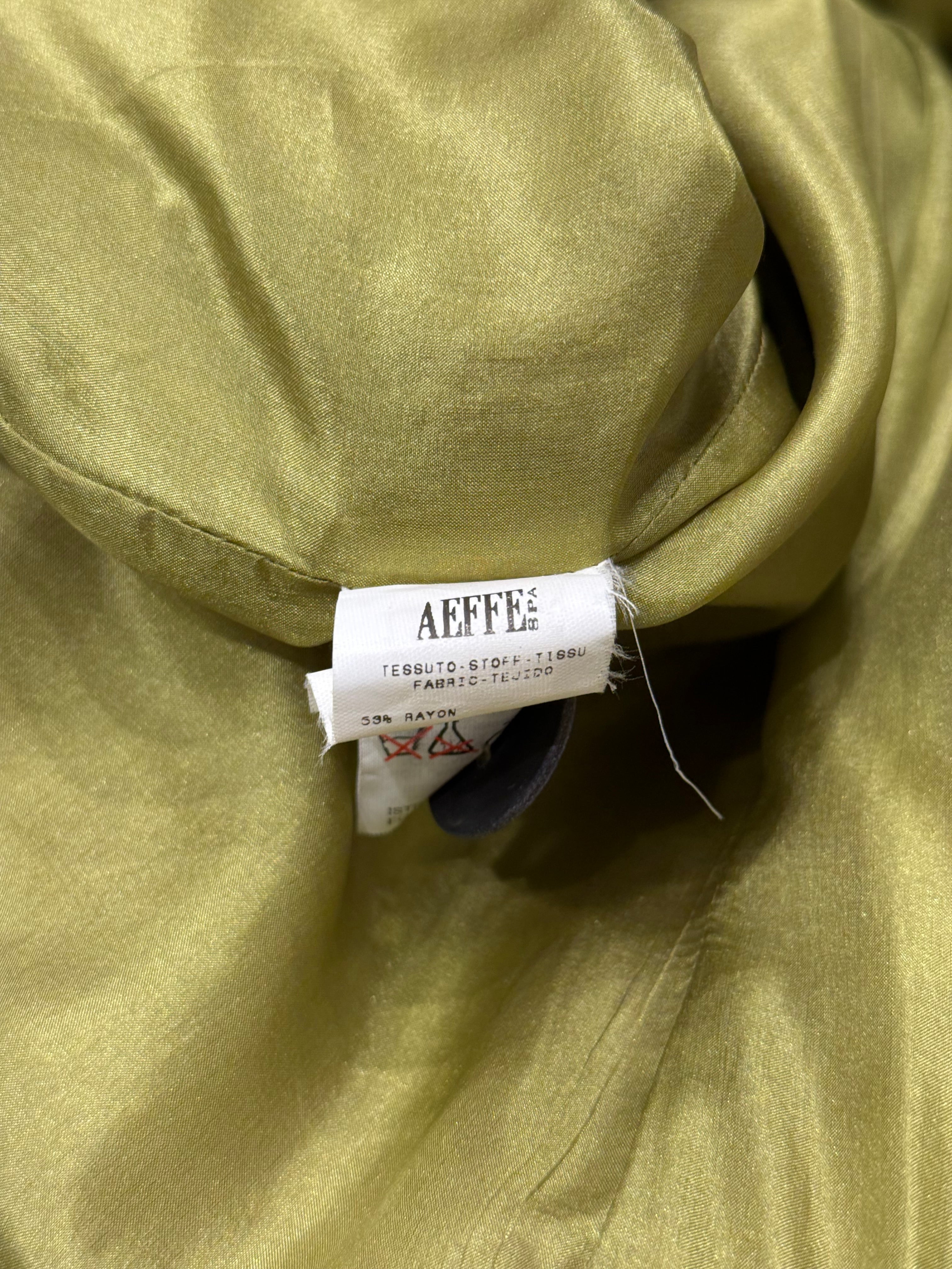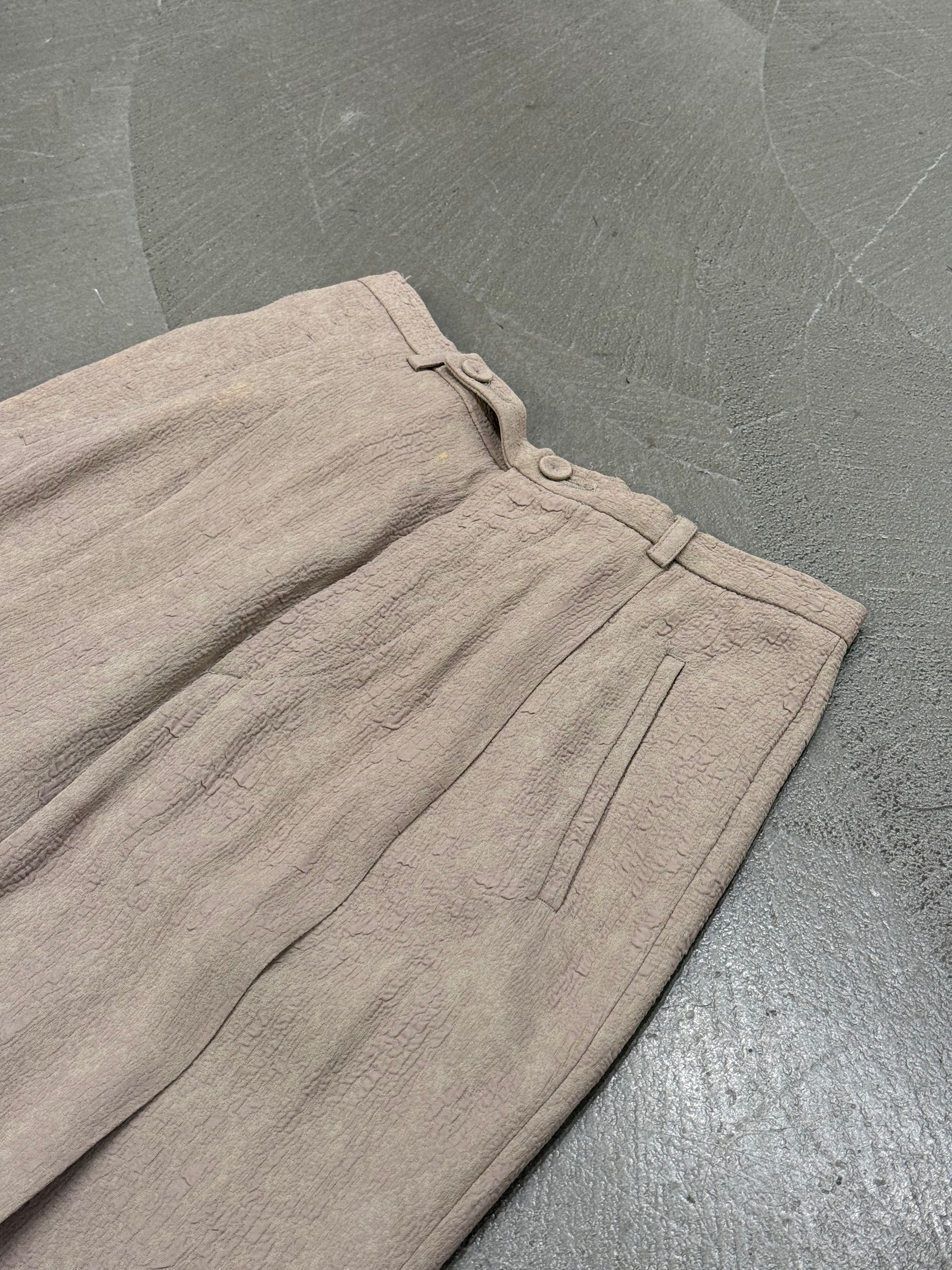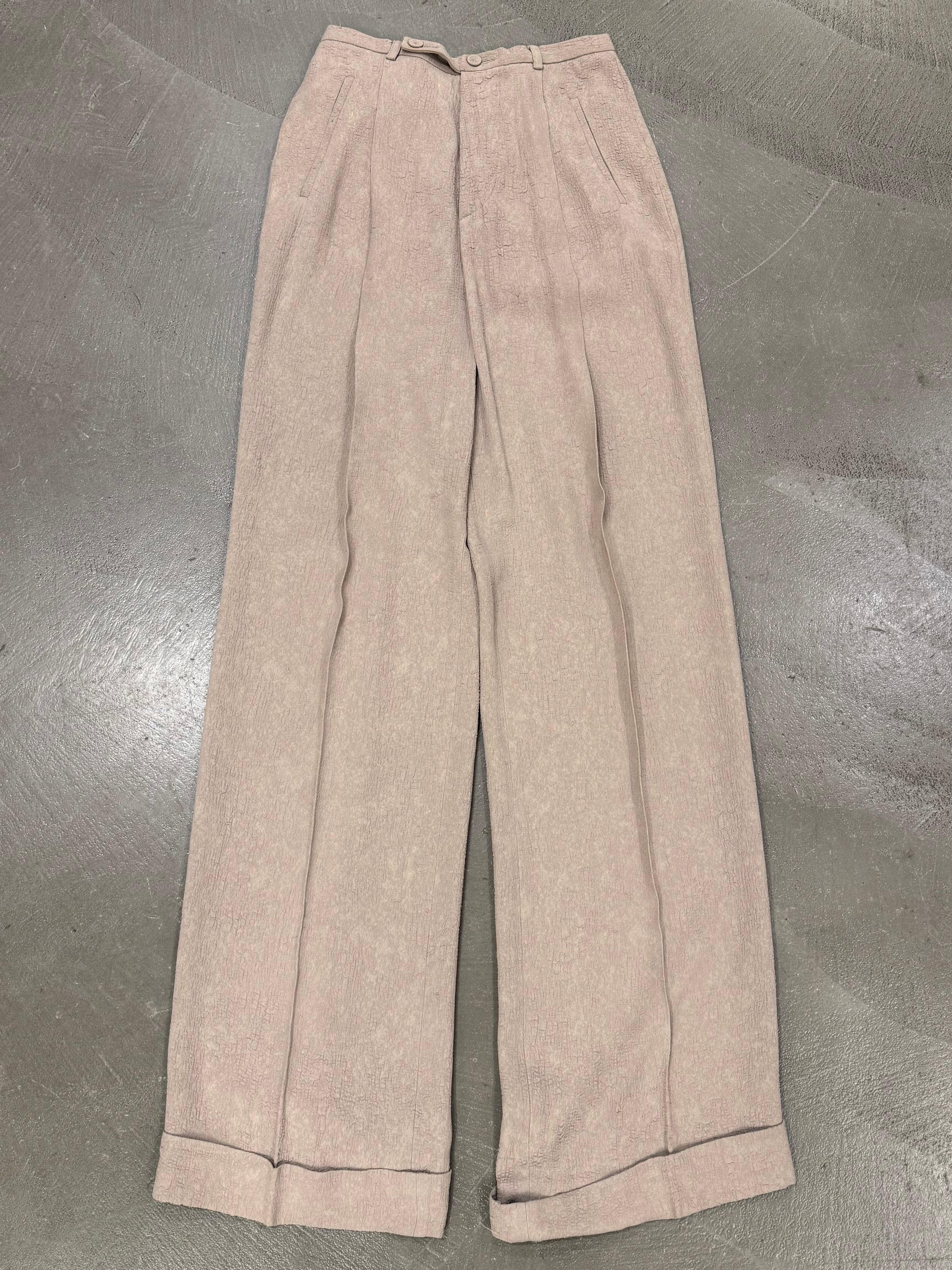 This early-2000s Jean Paul Gaultier set showcases the designer’s experimental approach to texture and proportion. Crafted in rayon with a distinctive “wrinkle skin” finish, the jacket features wide, sculptural sleeves and a sharply tailored waist, creating a dramatic yet structured silhouette. The matching pants balance the look with a clean line and subtle flare, resulting in a cohesive archival ensemble that captures Gaultier’s avant-garde elegance.