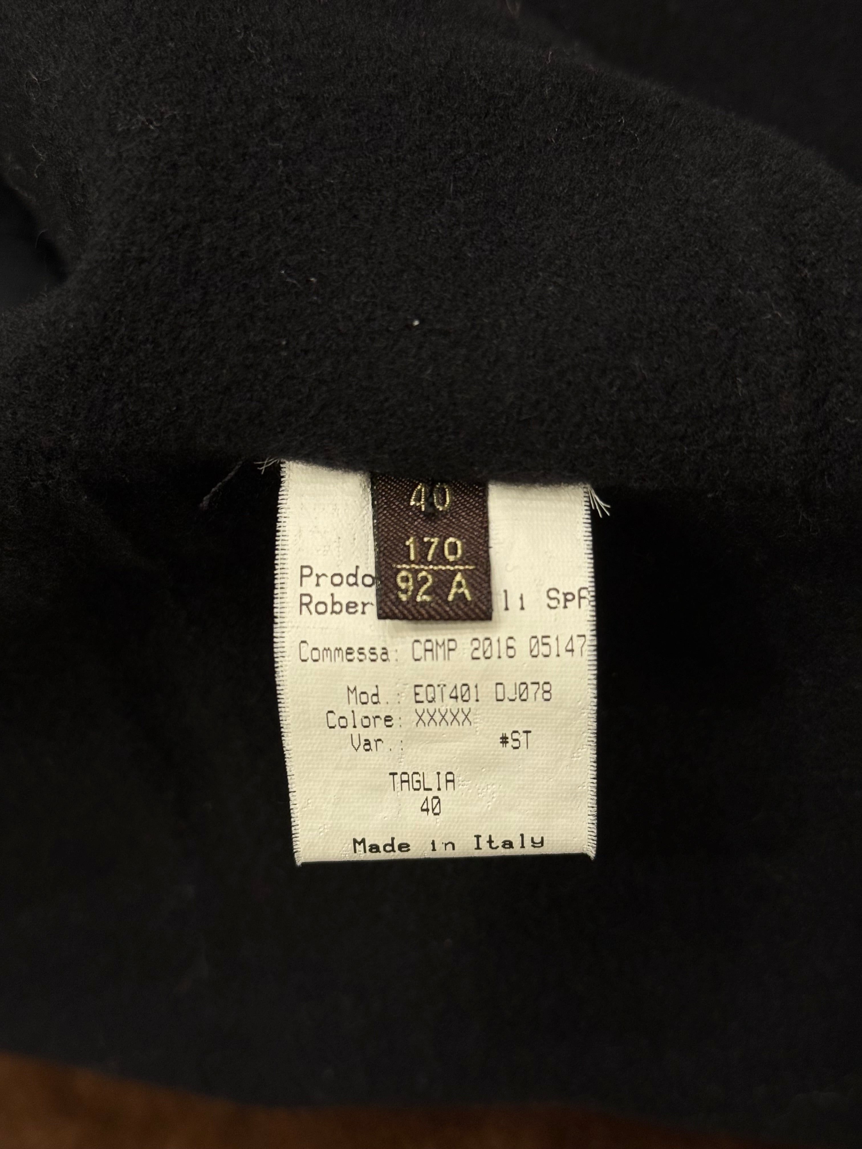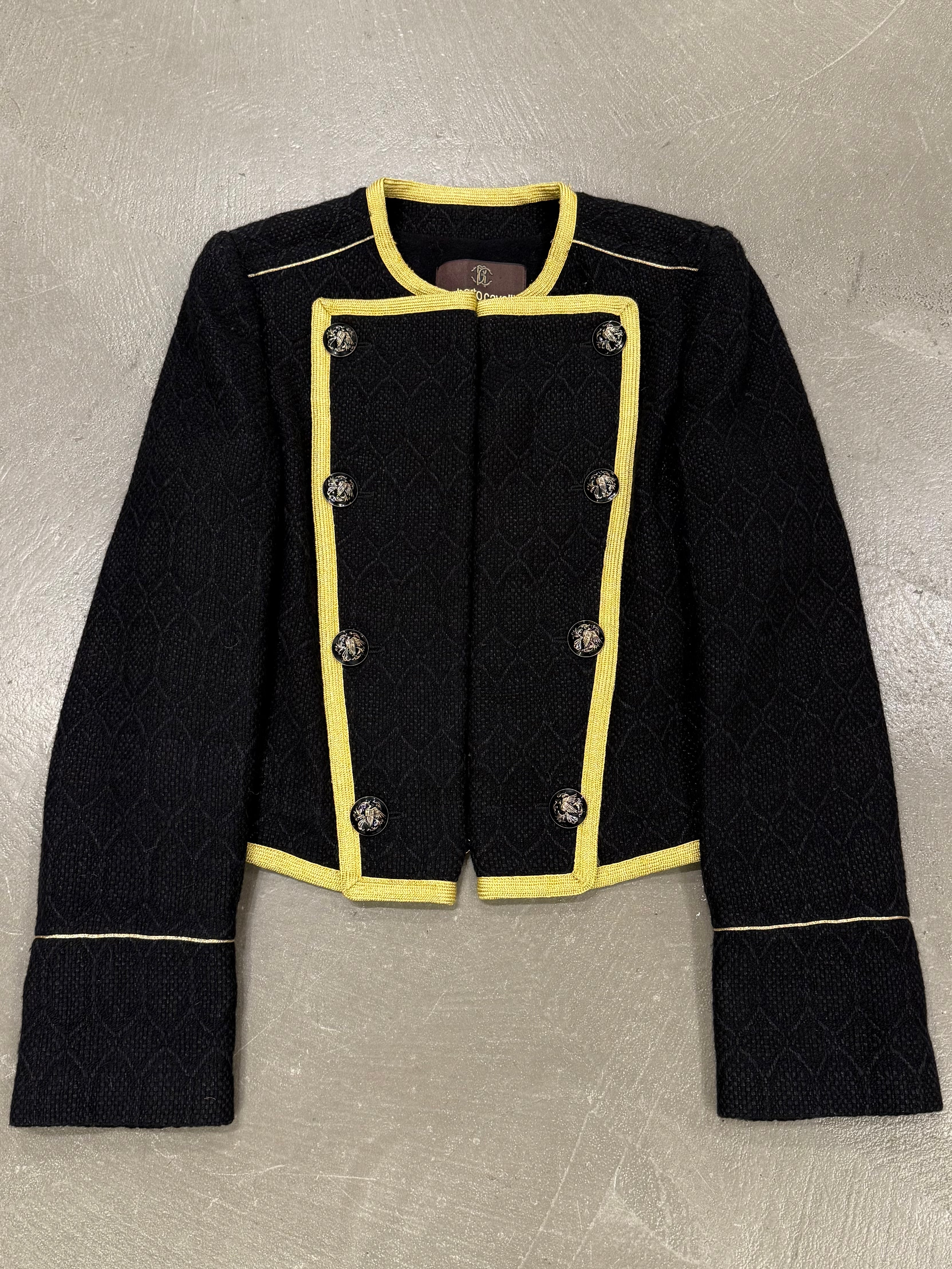 This 2016 Roberto Cavalli “Napoleon” jacket channels a bold, military-inspired aesthetic. Crafted in a cotton and wool blend, it features structured shoulders, contrast trim and decorative button detailing that evoke historical tailoring references. The cropped cut and defined waist enhance its dramatic silhouette, making it a striking statement piece with unmistakable Cavalli flair.