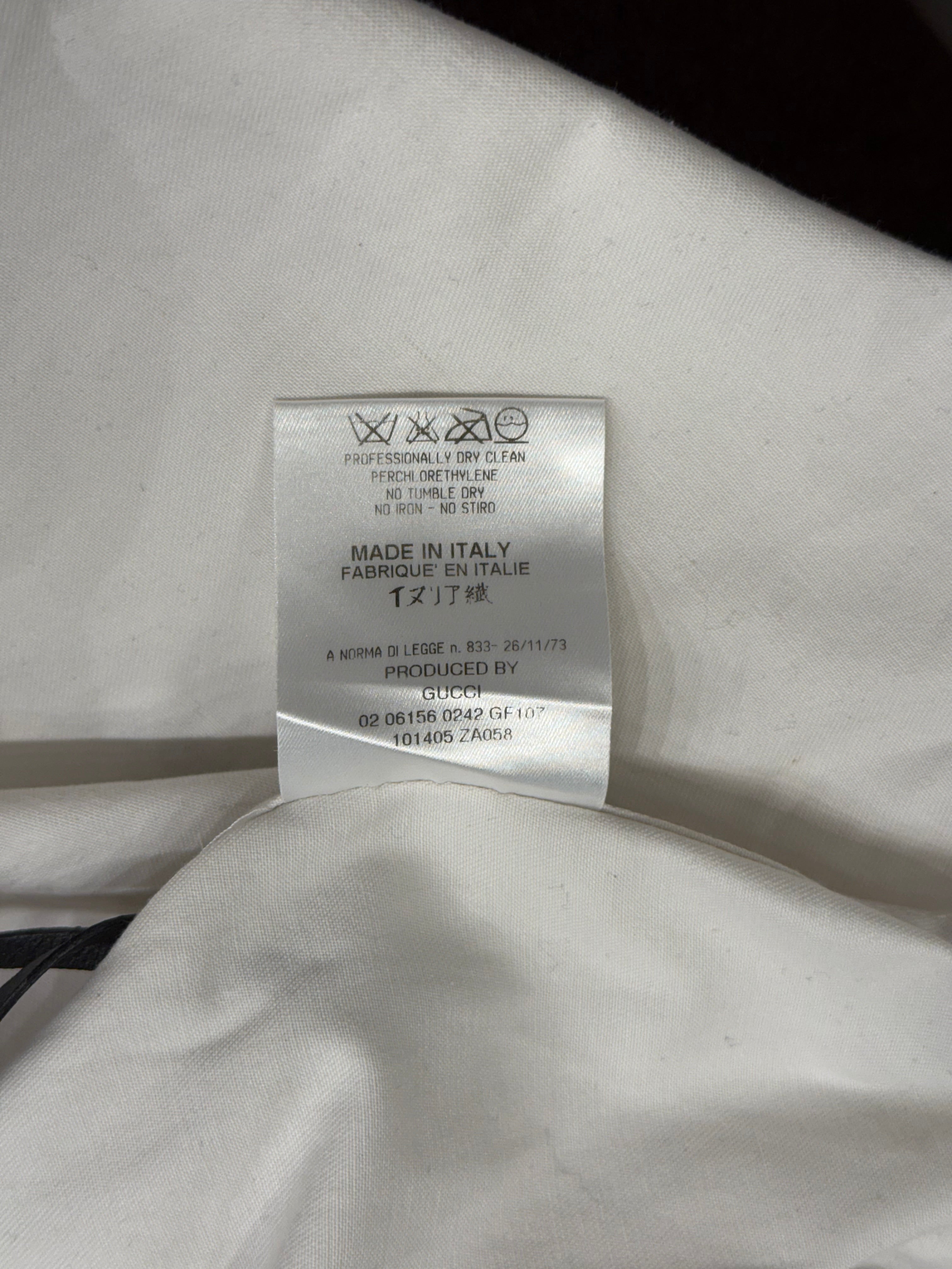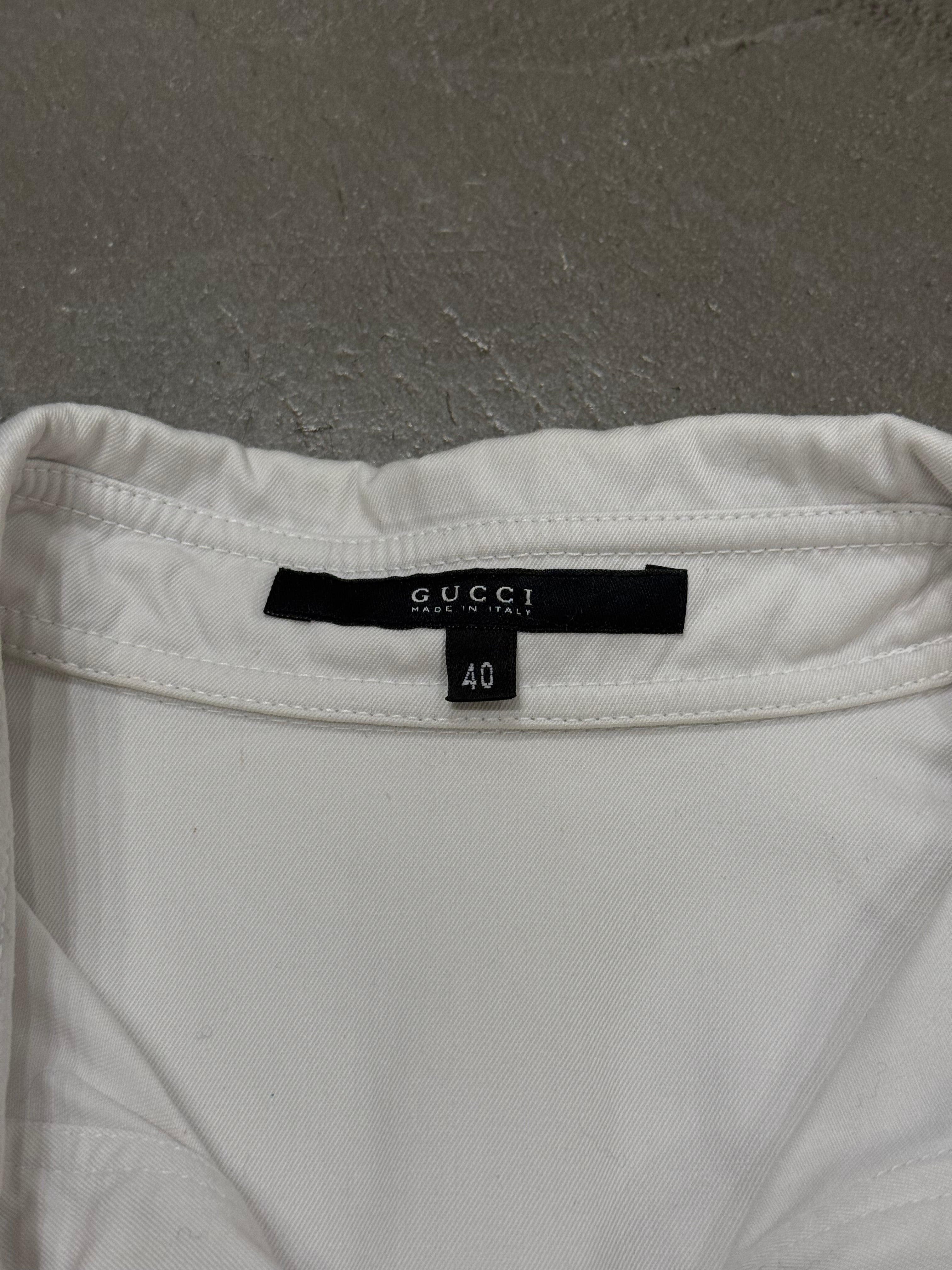 This Gucci shirt from the Tom Ford era in the 2000s is crafted from crisp white cotton with a sleek, tailored silhouette. The design is elevated by a contrasting black leather cord detail that cinches the waist, adding structure and sensuality to the minimal cut. A subtle yet striking example of Ford’s ability to transform classic staples into statement pieces.