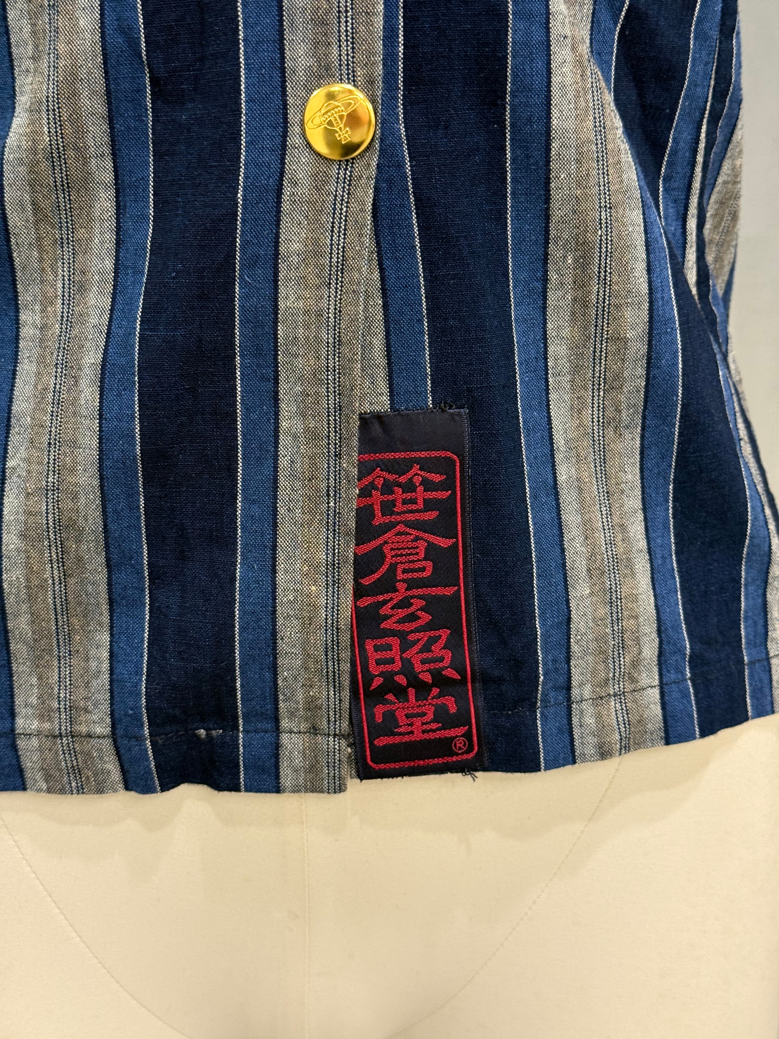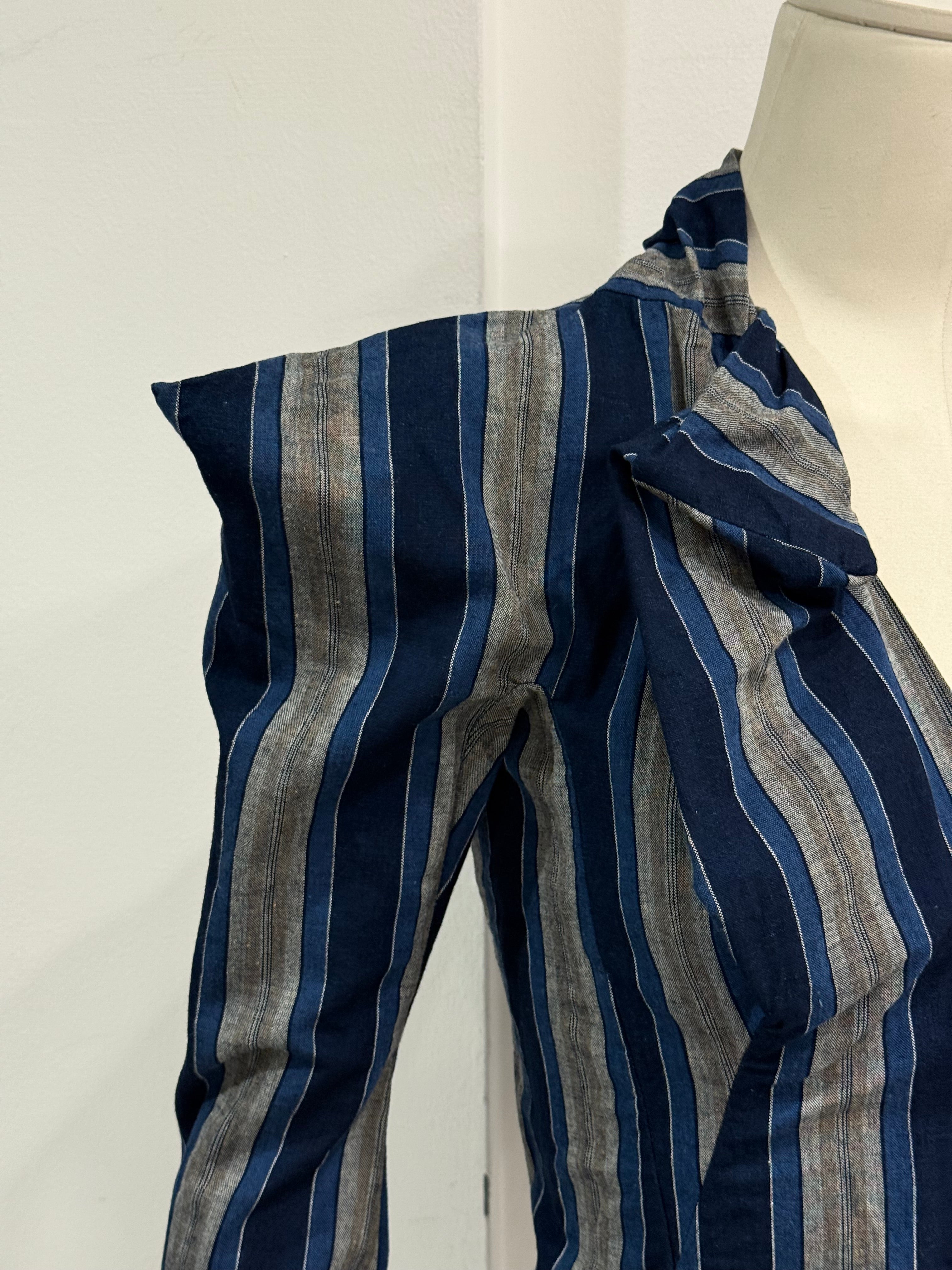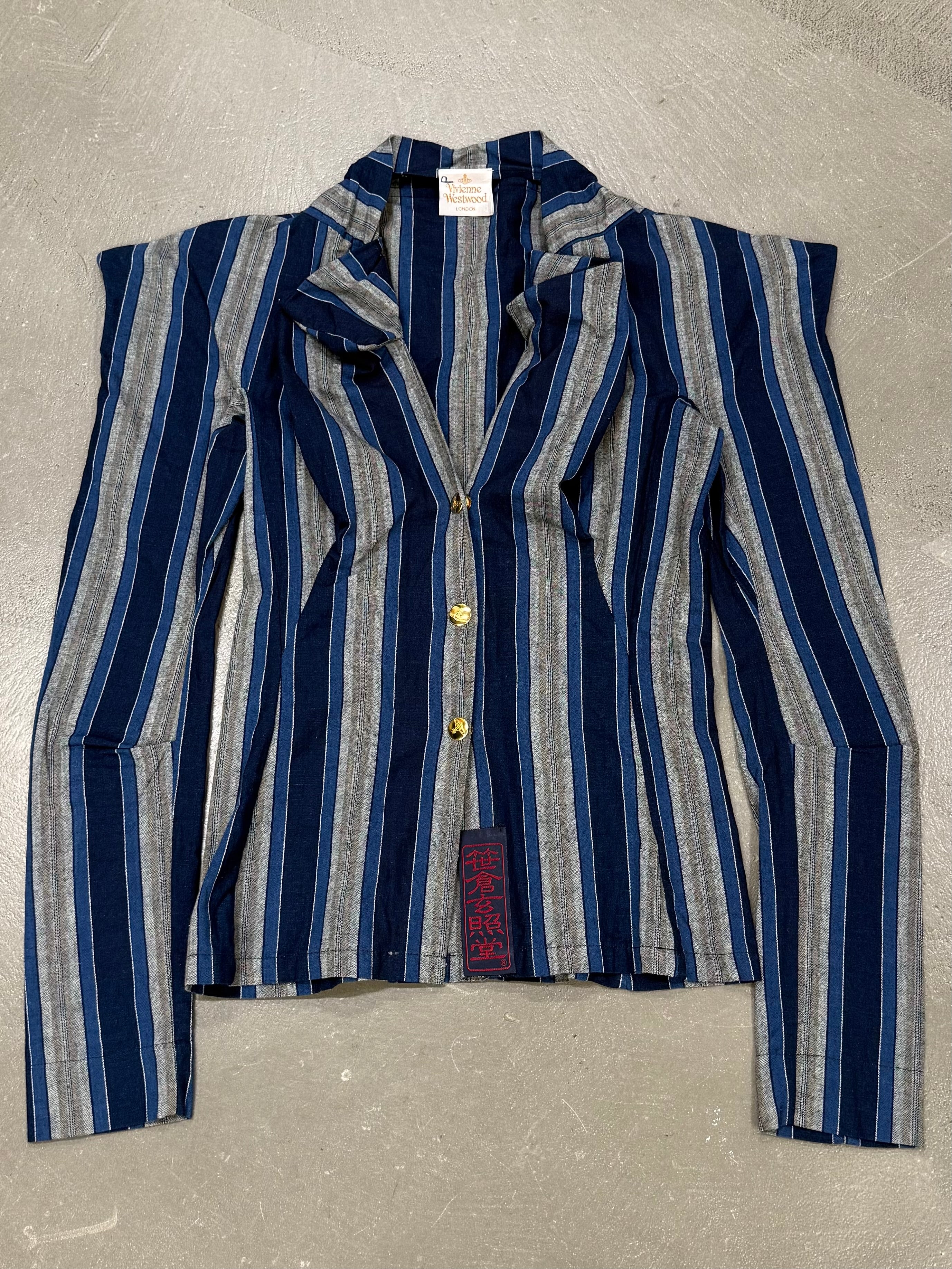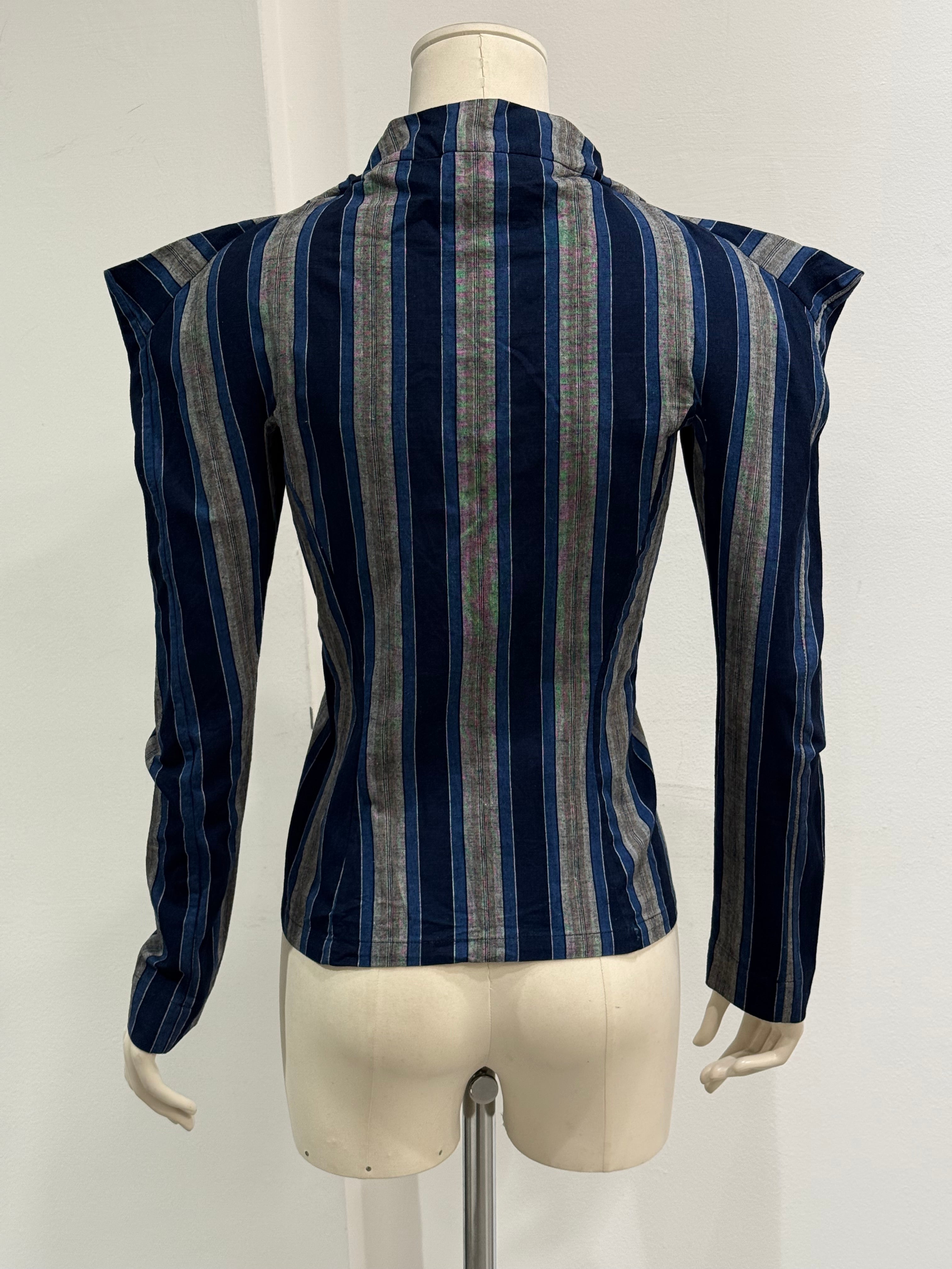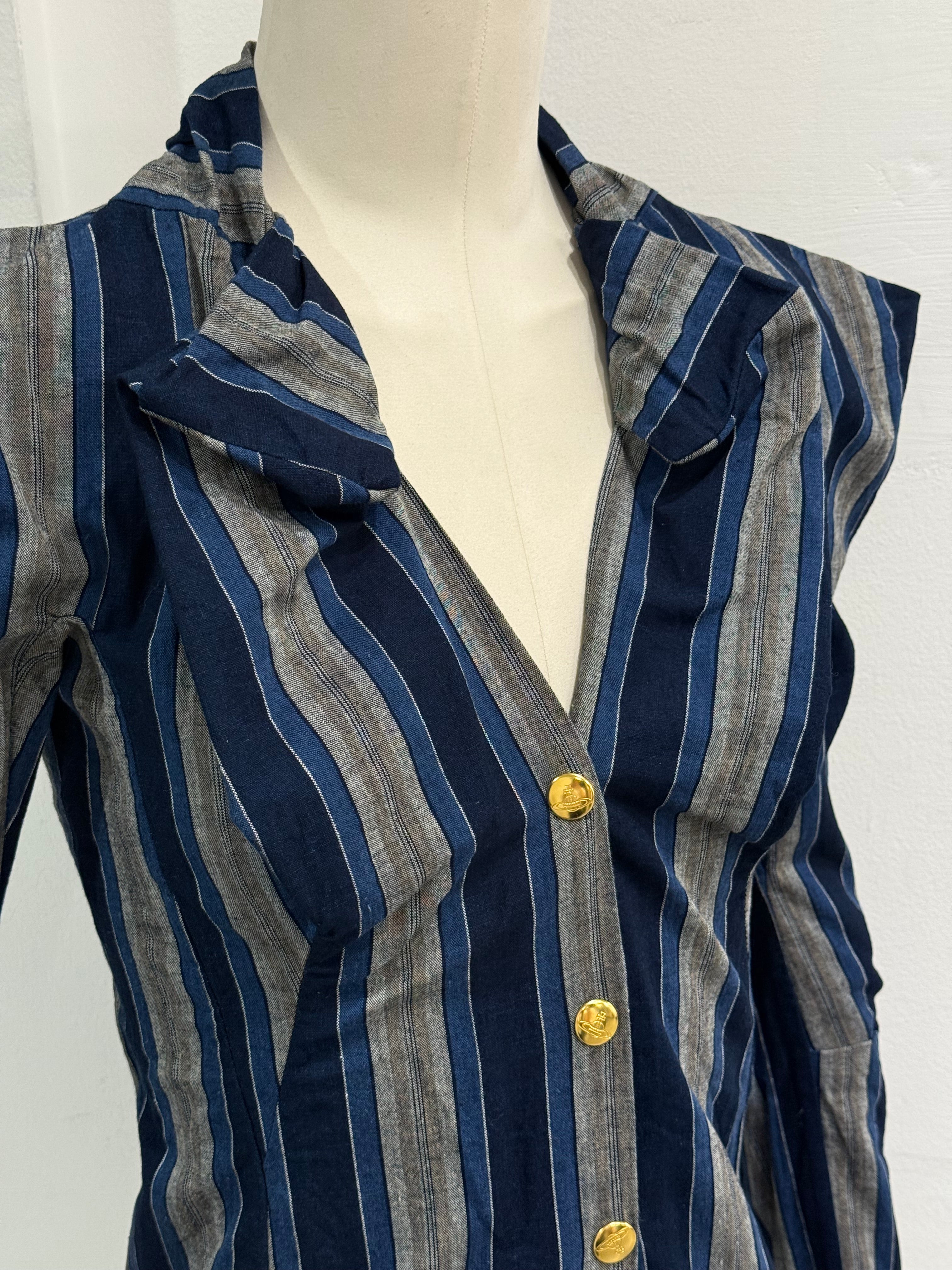 This Vivienne Westwood shirt from the 1990s embodies the designer’s rebellious tailoring. Crafted in a striped blue and grey fabric, it features sharply exaggerated shoulders, a deep neckline, and gold-tone buttons down the front. The fitted cut emphasizes the waist, while the dramatic silhouette reflects Westwood’s iconic play with historical references and punk energy.
