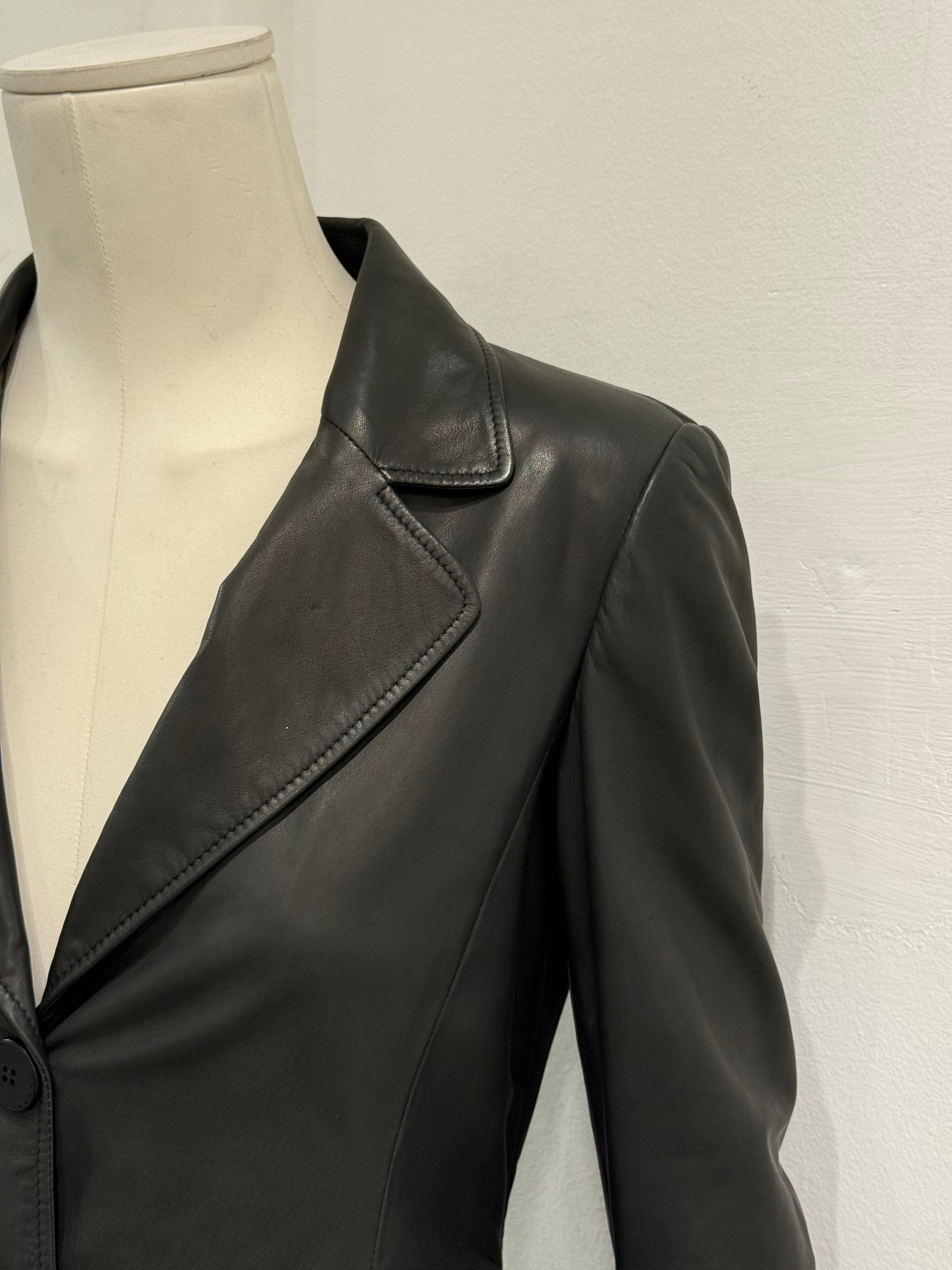 This 2000s Armani leather coat is crafted from supple black leather with a minimalist tailored silhouette. It features clean lines, concealed buttons, and structured shoulders — a sophisticated piece that reflects Armani’s timeless approach to design and luxury.