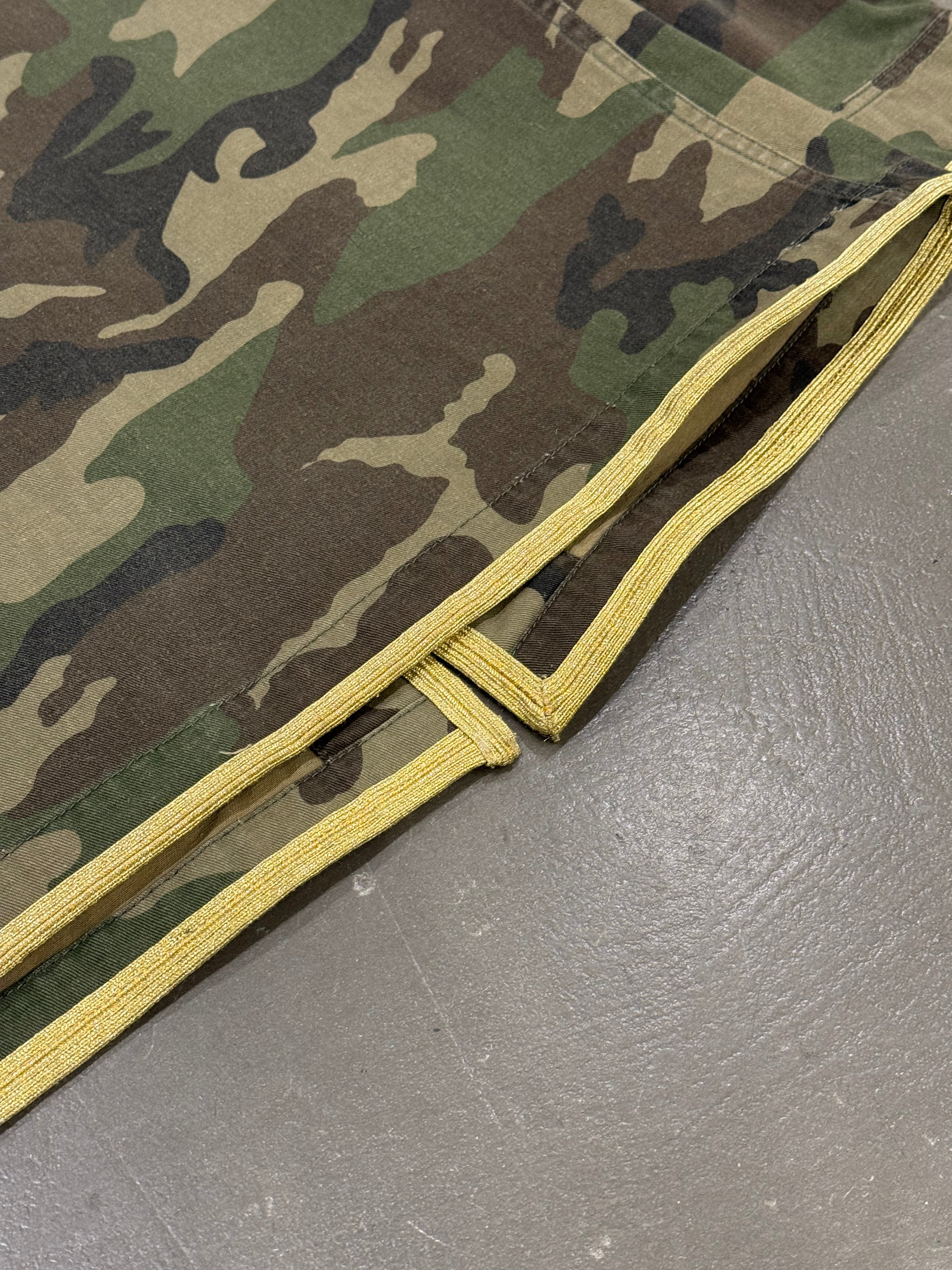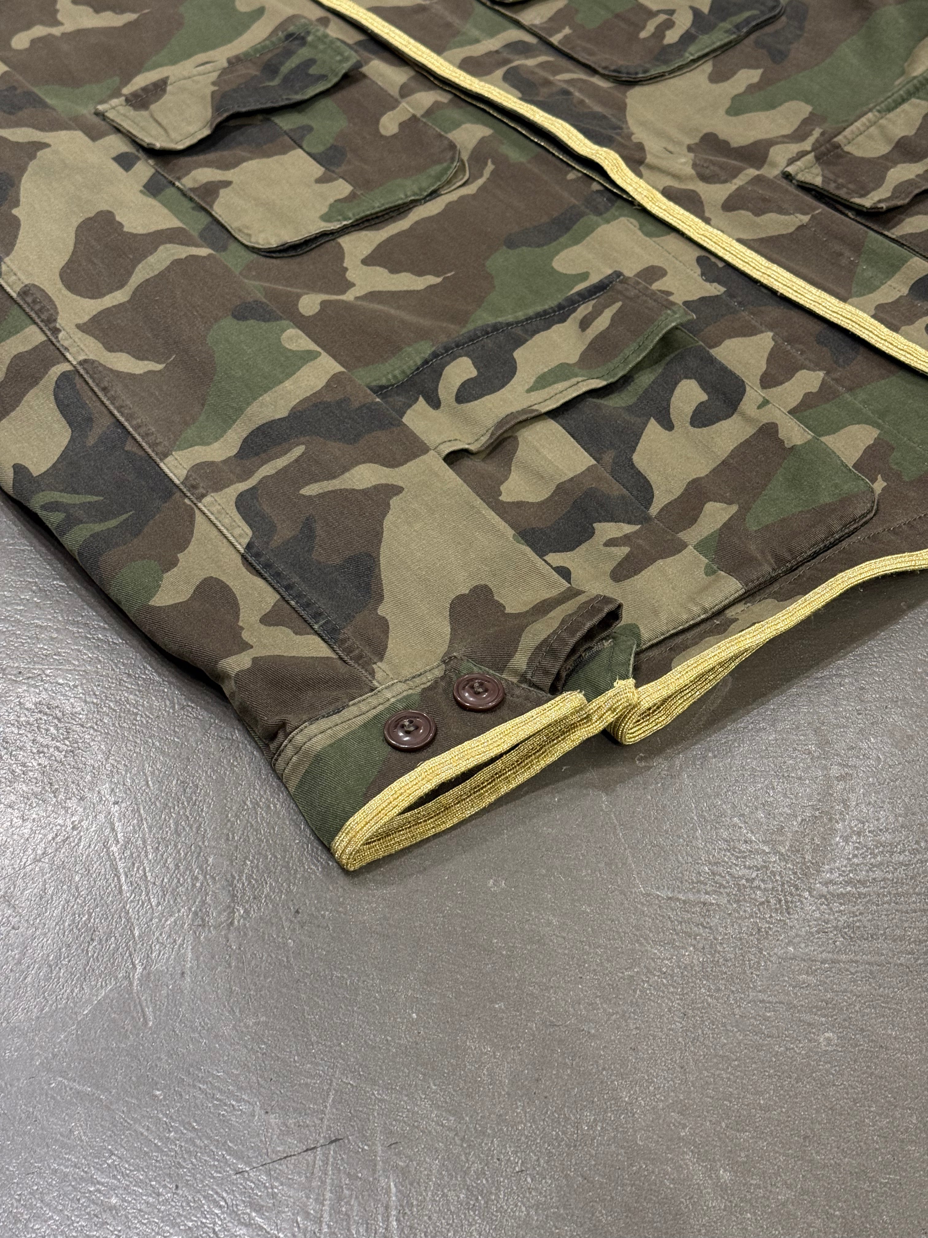 This Saint Laurent M65 jacket from the Spring/Summer 2015 collection exemplifies Hedi Slimane’s reinterpretation of military classics through a refined rock aesthetic. Crafted from durable camouflage cotton, it features gold piping along the seams and collar, giving a subtle yet luxurious contrast. With structured shoulders, buttoned epaulettes, and utility pockets, it perfectly balances rebellion and sophistication — a signature of Slimane’s Saint Laurent era.