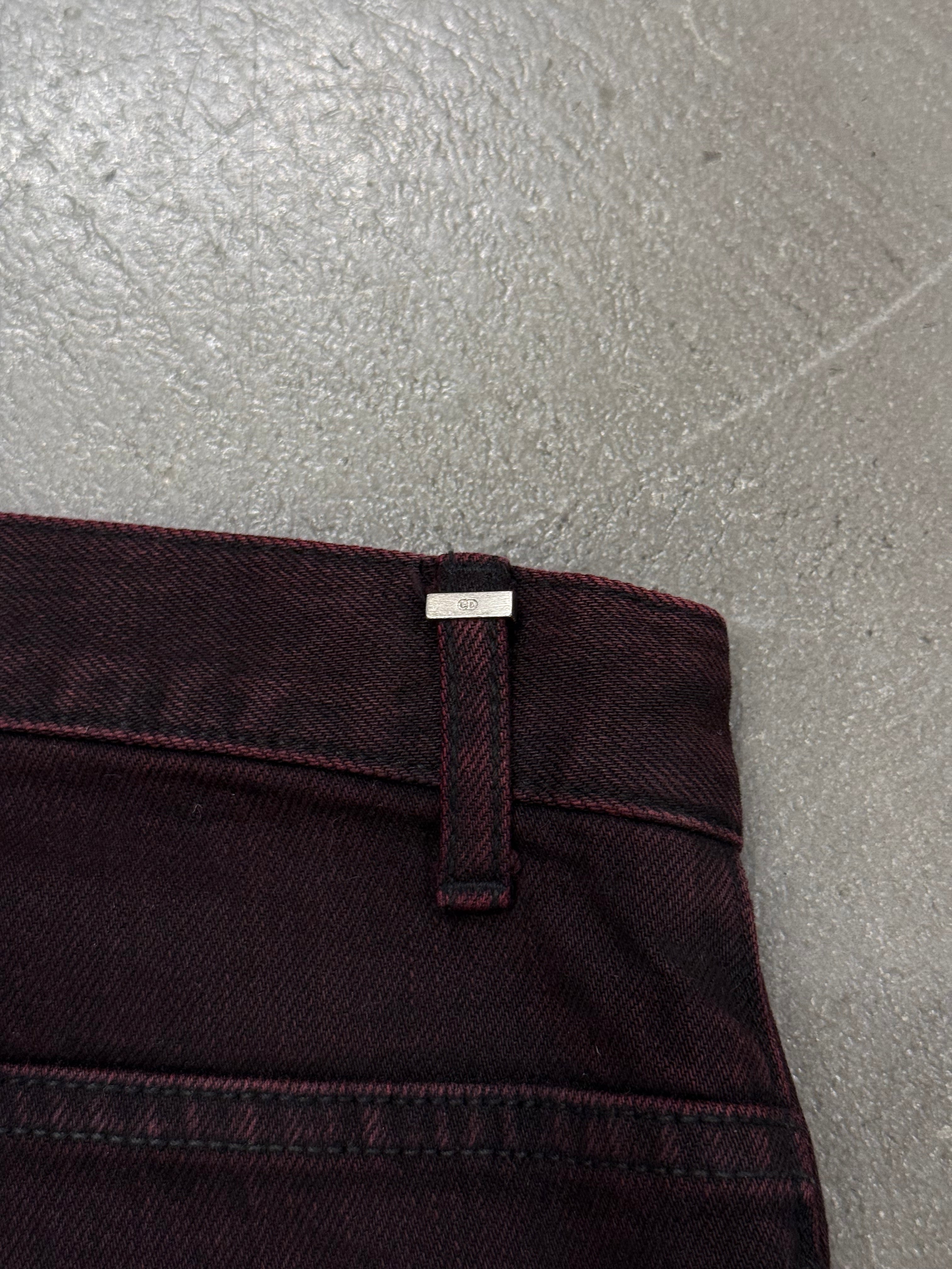 These early-2000s Dior jeans feature a distinctive faded red wash that captures the raw, rock-inflected attitude of the era. Crafted in cotton, they offer a slim straight silhouette with subtle wear that enhances their vintage character. A strong archival denim piece with bold yet wearable appeal.
