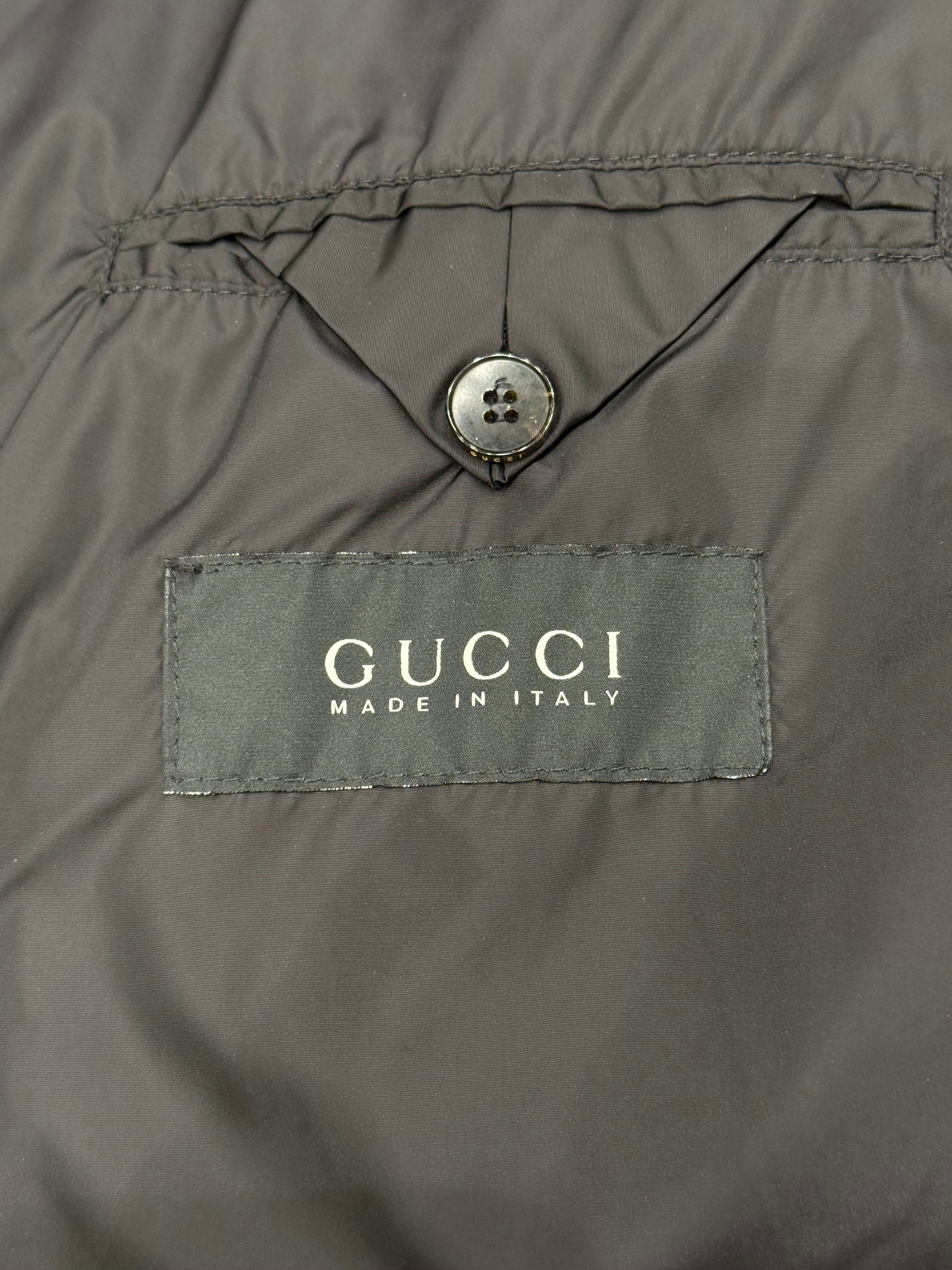This 2000s Gucci puffer jacket blends technical outerwear with refined detailing. Constructed from durable nylon, the piece features quilted padding for warmth and distinctive leather panels that add texture and structure to the design. The fitted silhouette and articulated sleeves give the jacket a sharp, modern profile typical of Gucci’s early 2000s aesthetic.