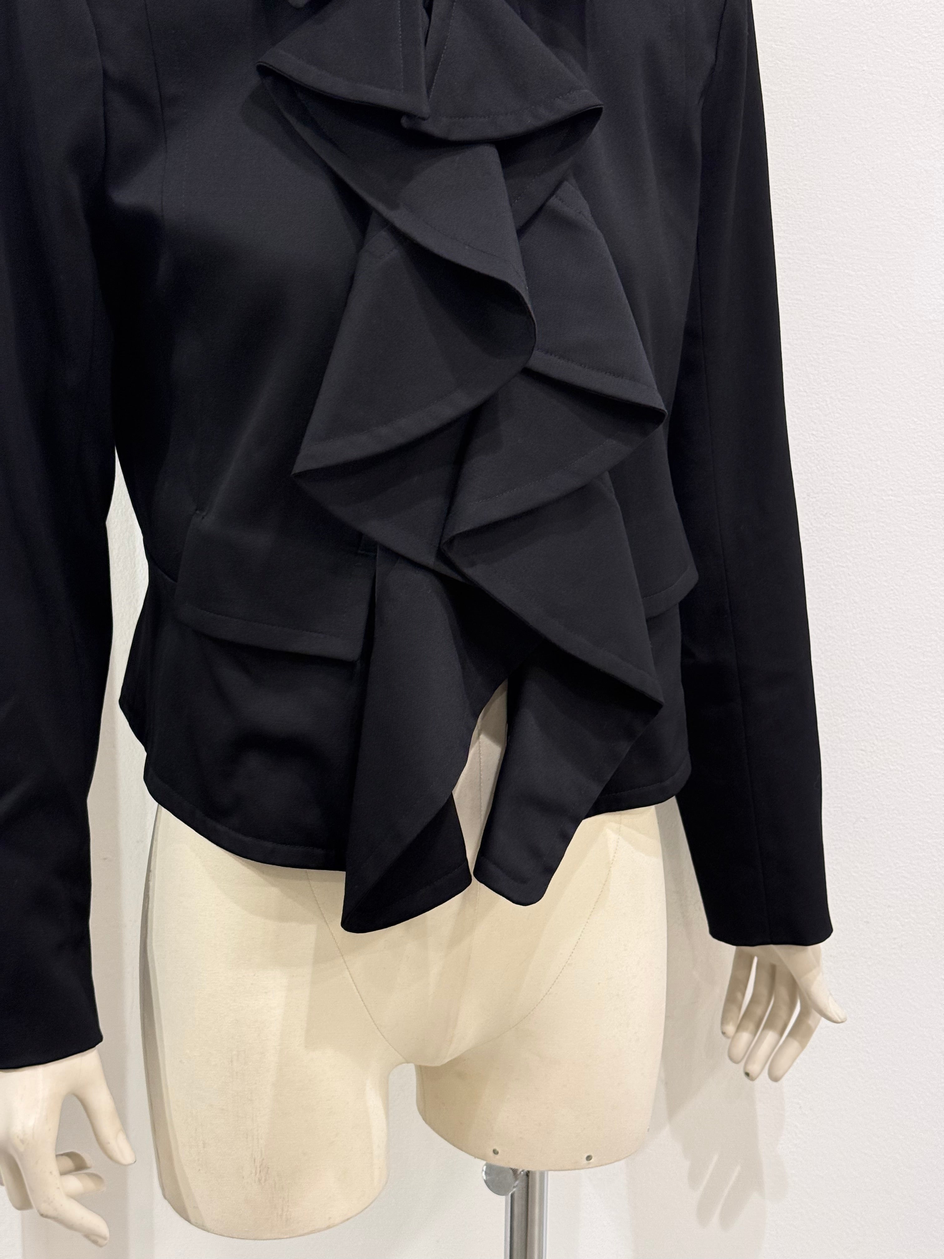 This 2003 YSL by Tom Ford jacket features an exaggerated cascading ruffle front, a dramatic signature of Ford’s final years at the house. Crafted in fine wool with a sharply tailored silhouette, it combines sensuality and sculptural precision—an iconic runway piece from one of Ford’s most celebrated eras.