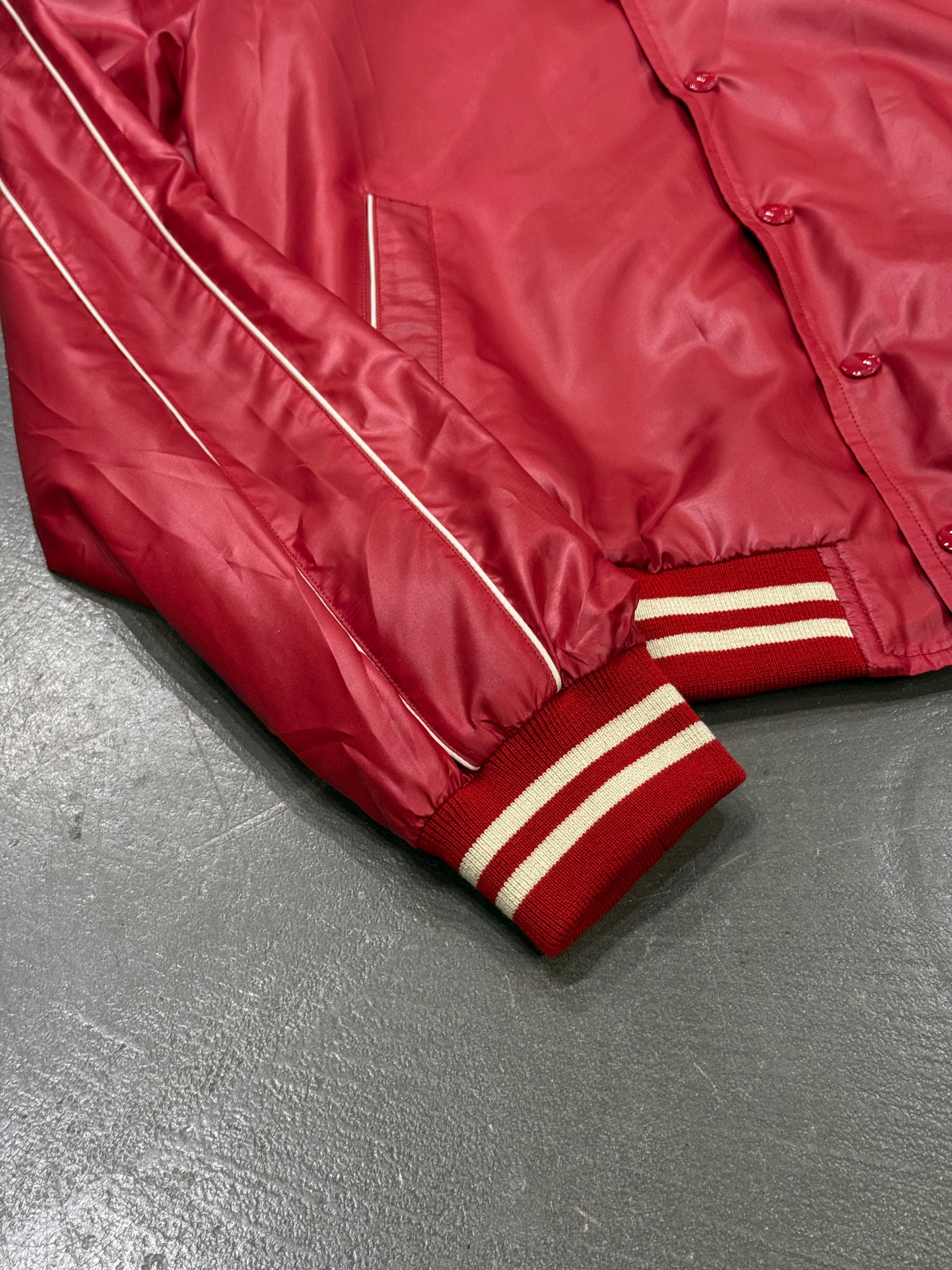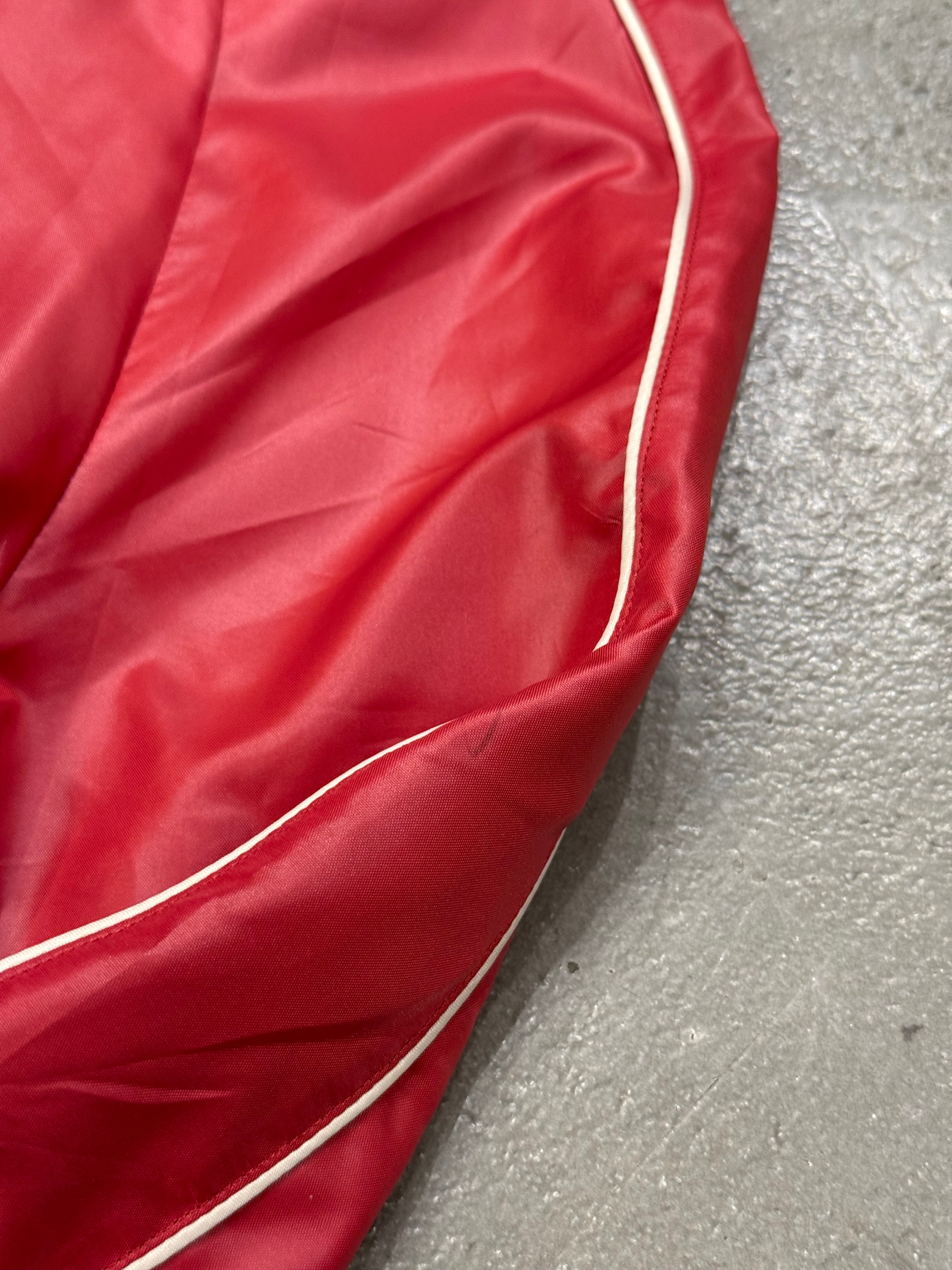 This S/S 2020 Celine teddy jacket designed under Hedi Slimane reflects his signature rock-infused aesthetic. Crafted in polyester with a glossy nylon finish, it features a classic varsity silhouette with ribbed collar, cuffs and hem. The bold red tone and sharp proportions echo Slimane’s contemporary reinterpretation of youth culture.
