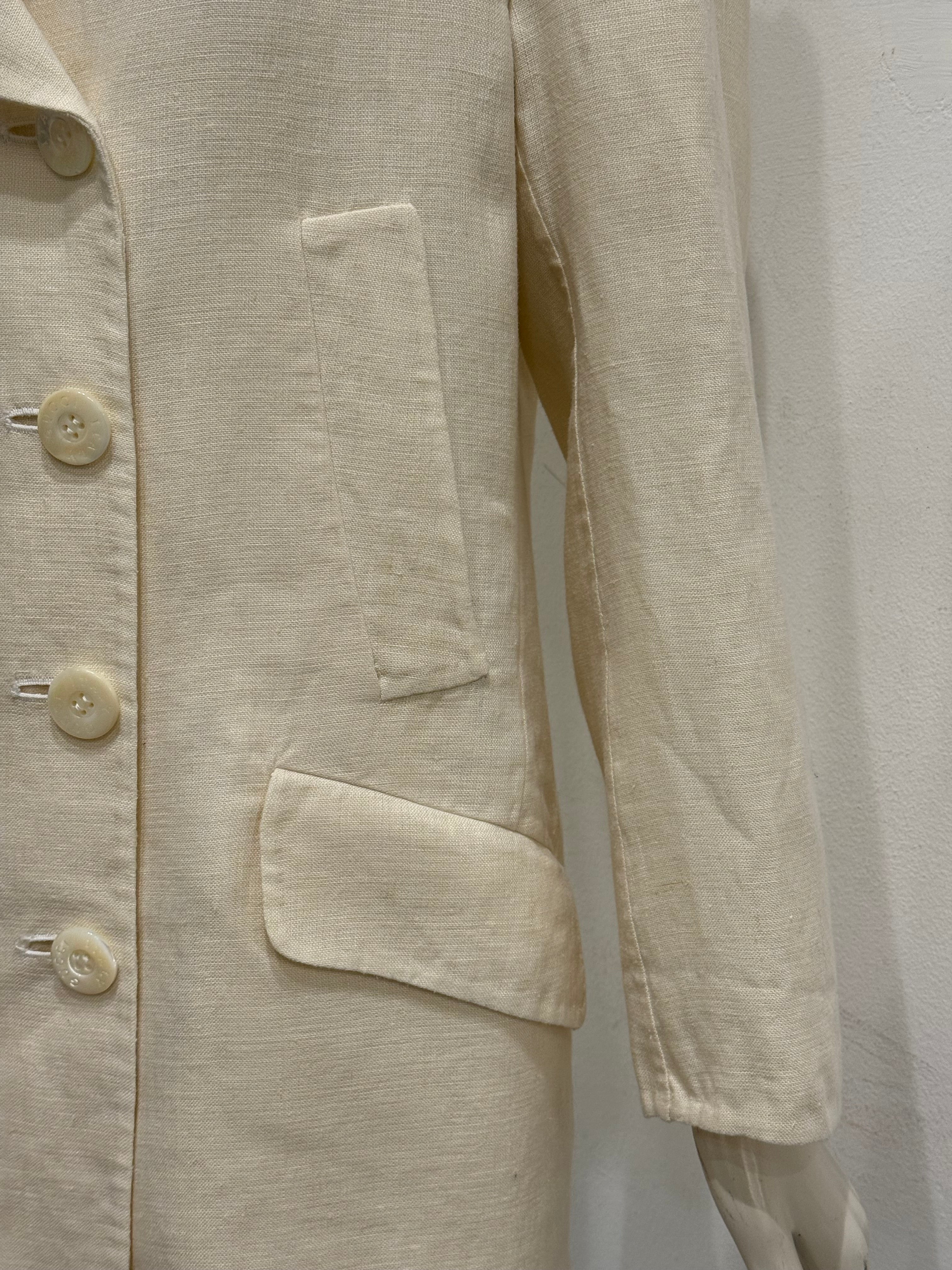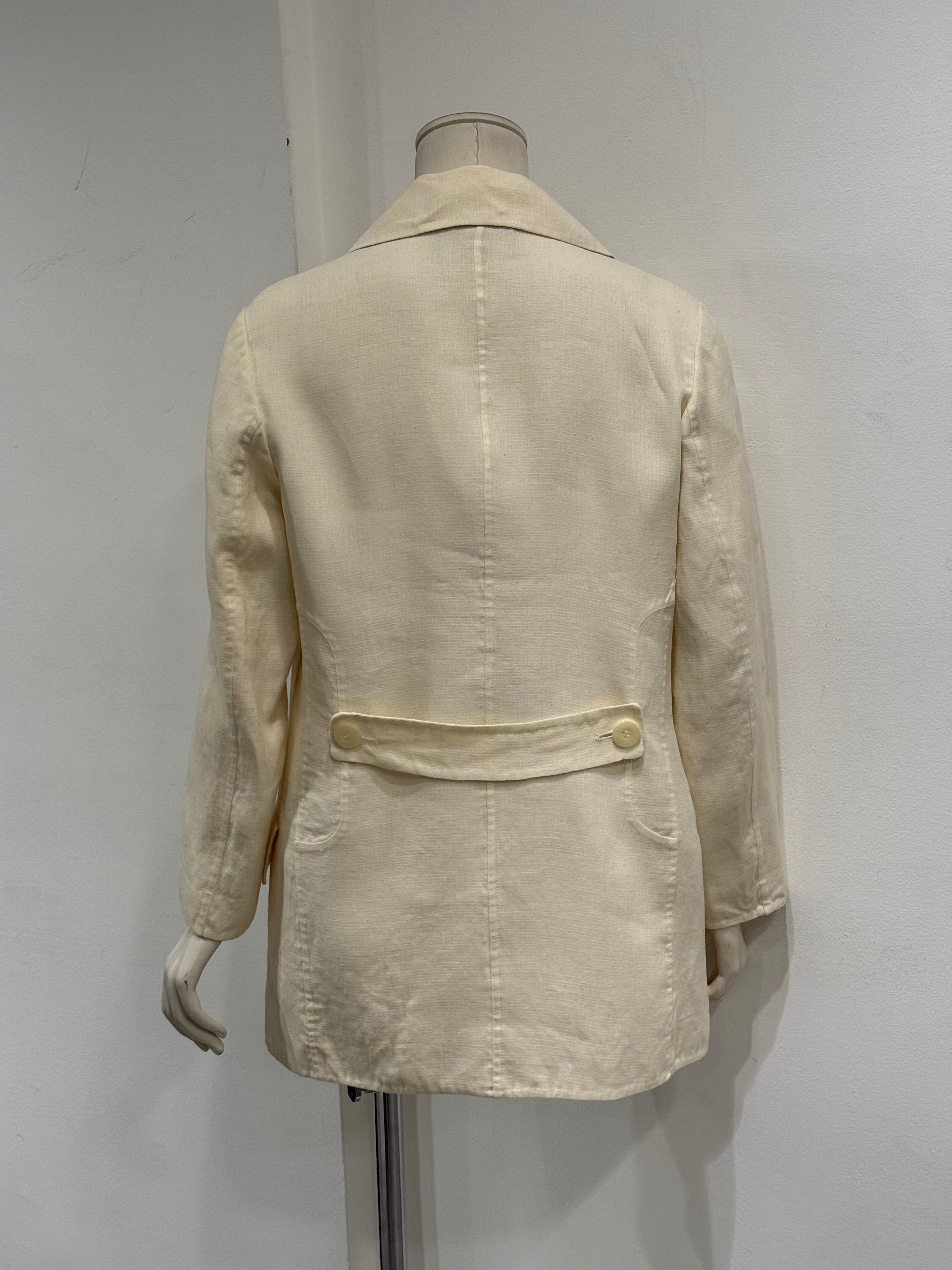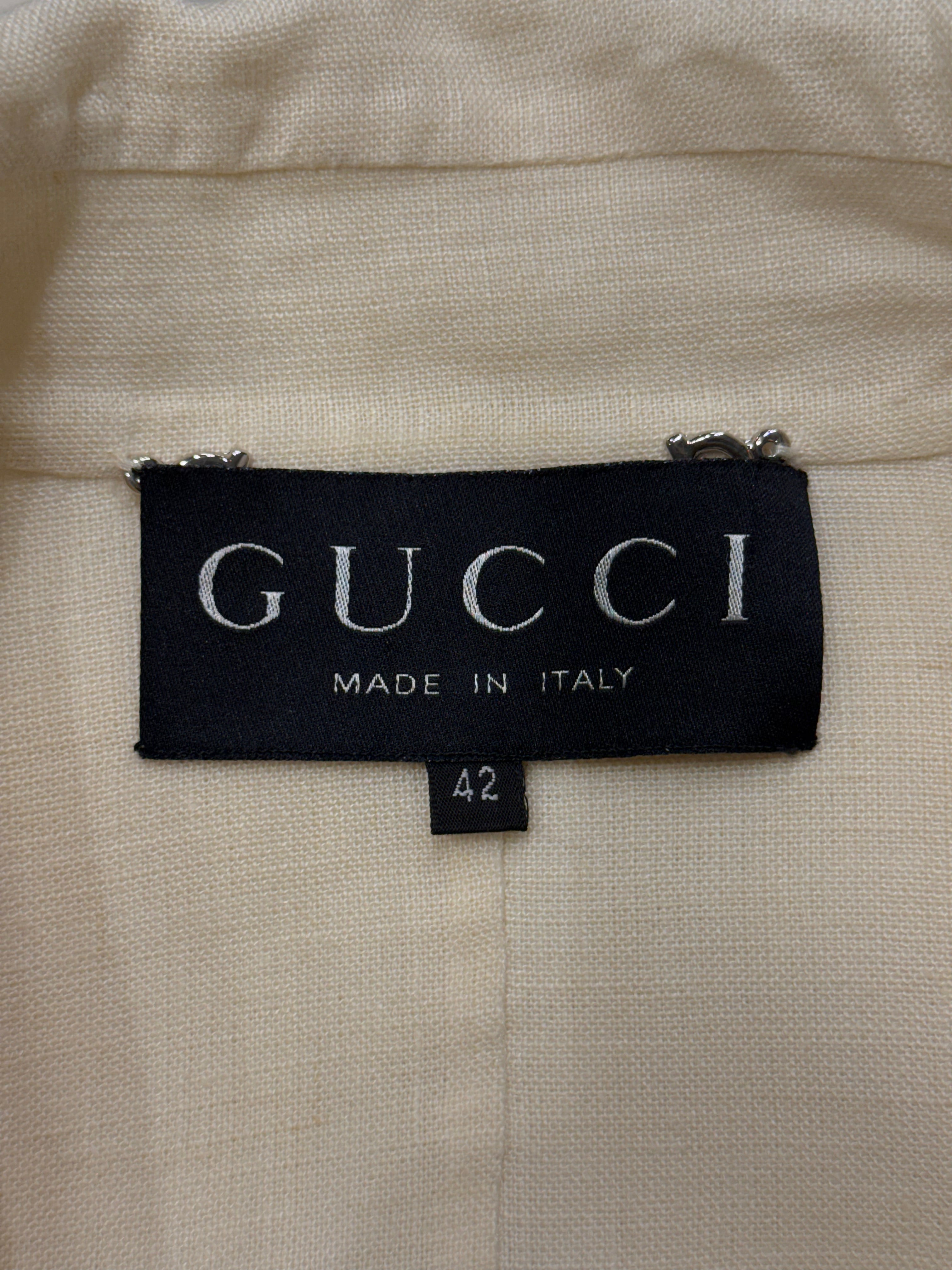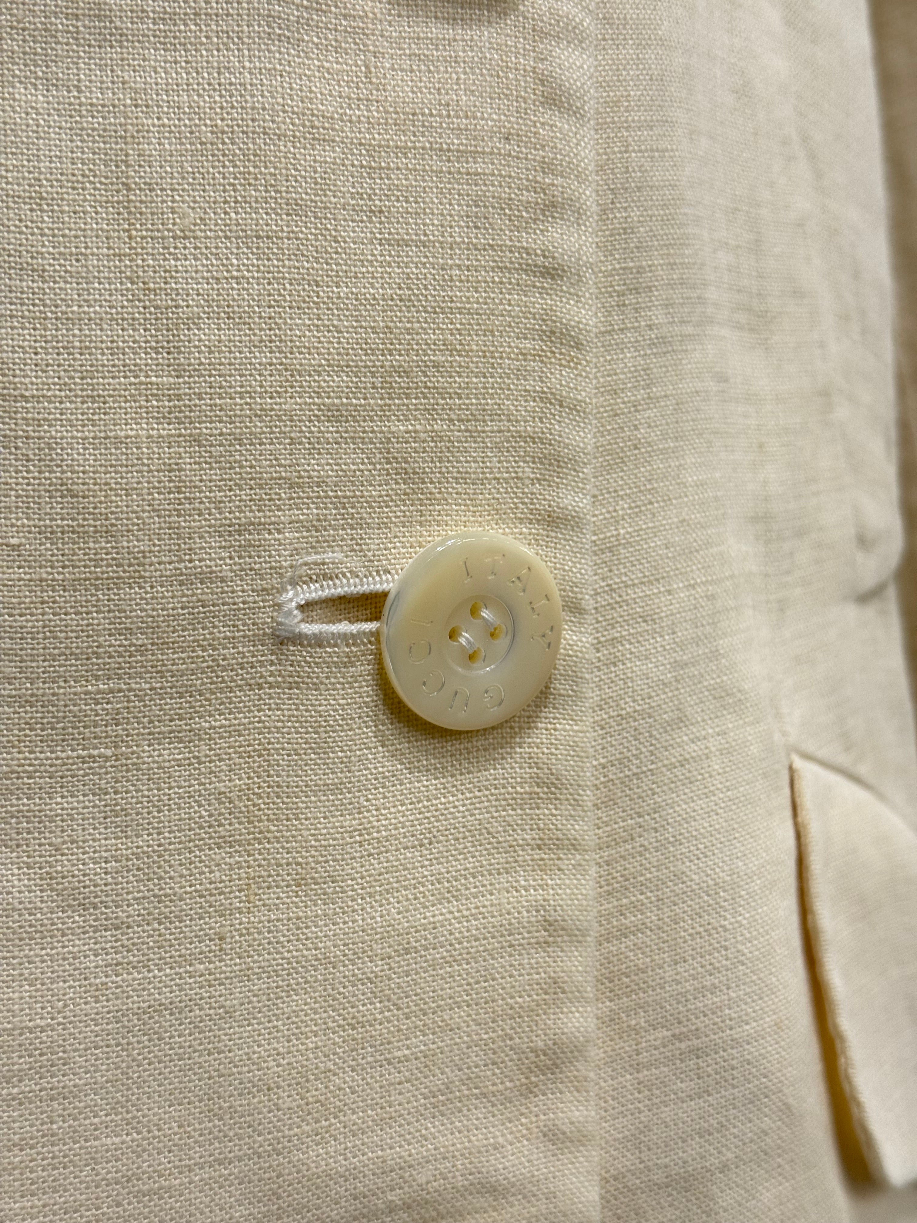 This 1996 Gucci caban coat designed under Tom Ford showcases the early foundations of his refined yet sensual vision for the house. Crafted in linen, it features a classic double-breasted construction, sharp lapels and a softly structured silhouette. The natural texture enhances its effortless Mediterranean elegance.