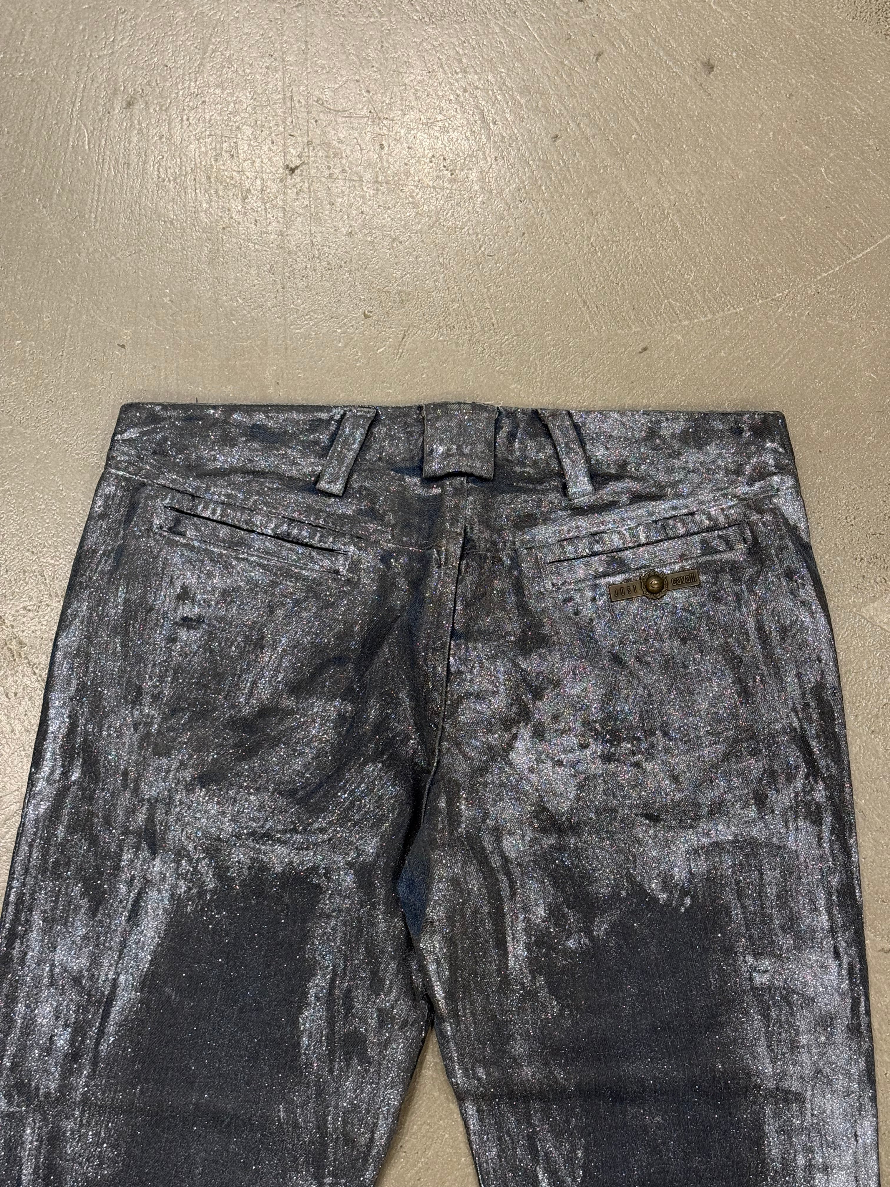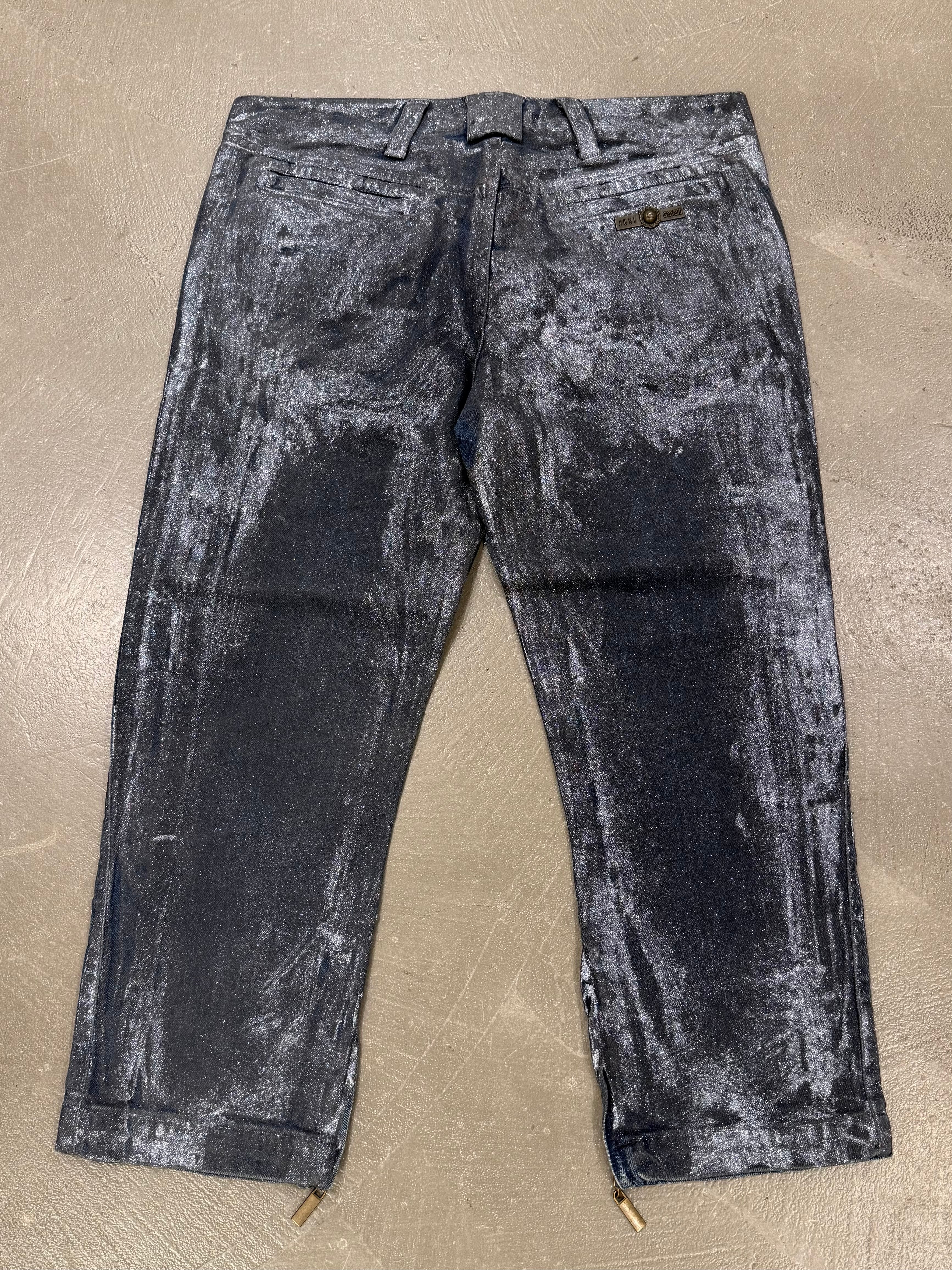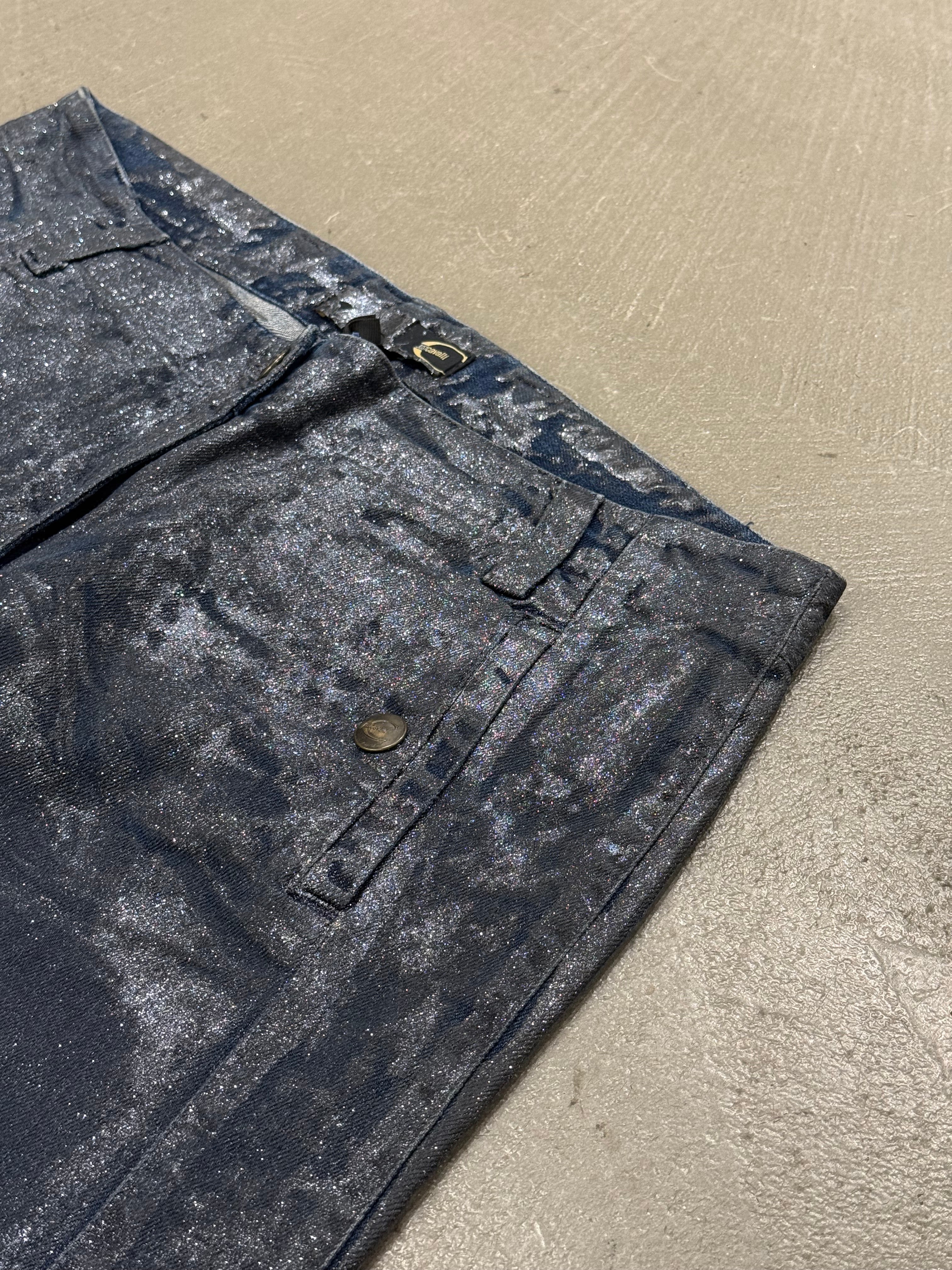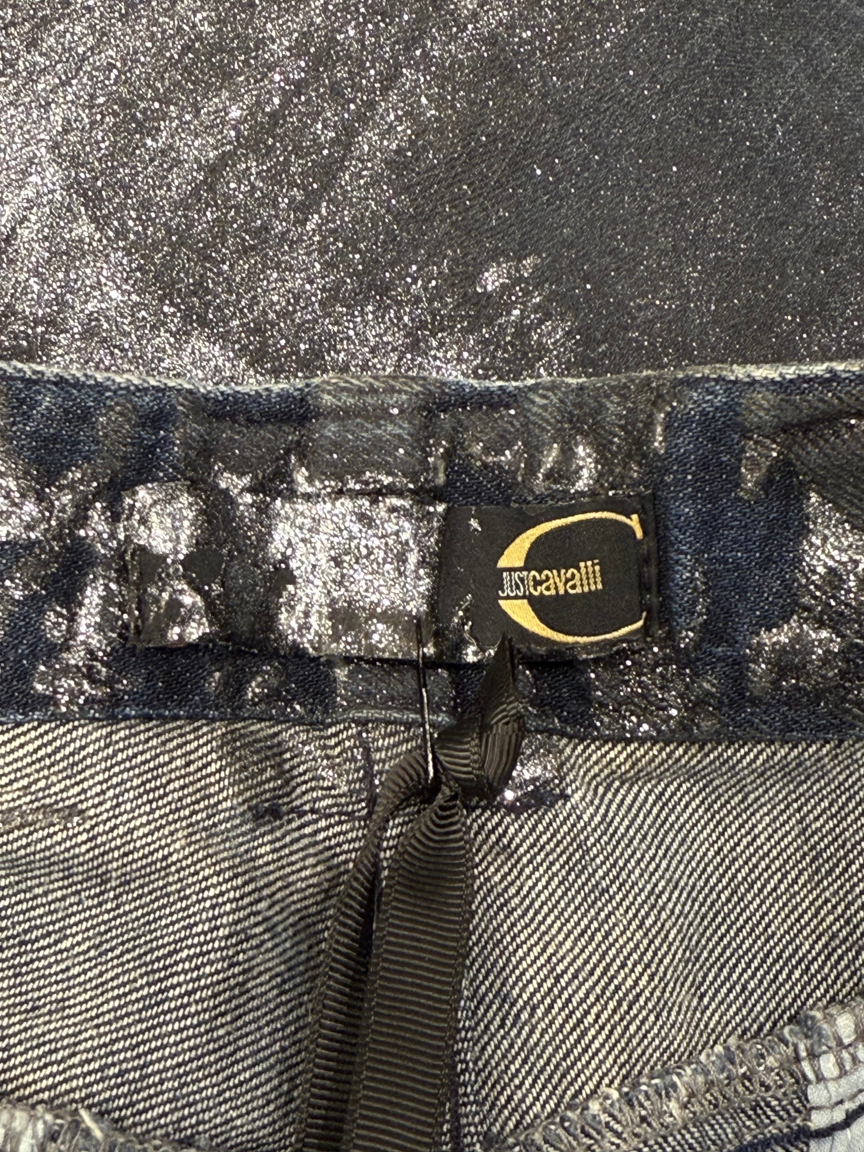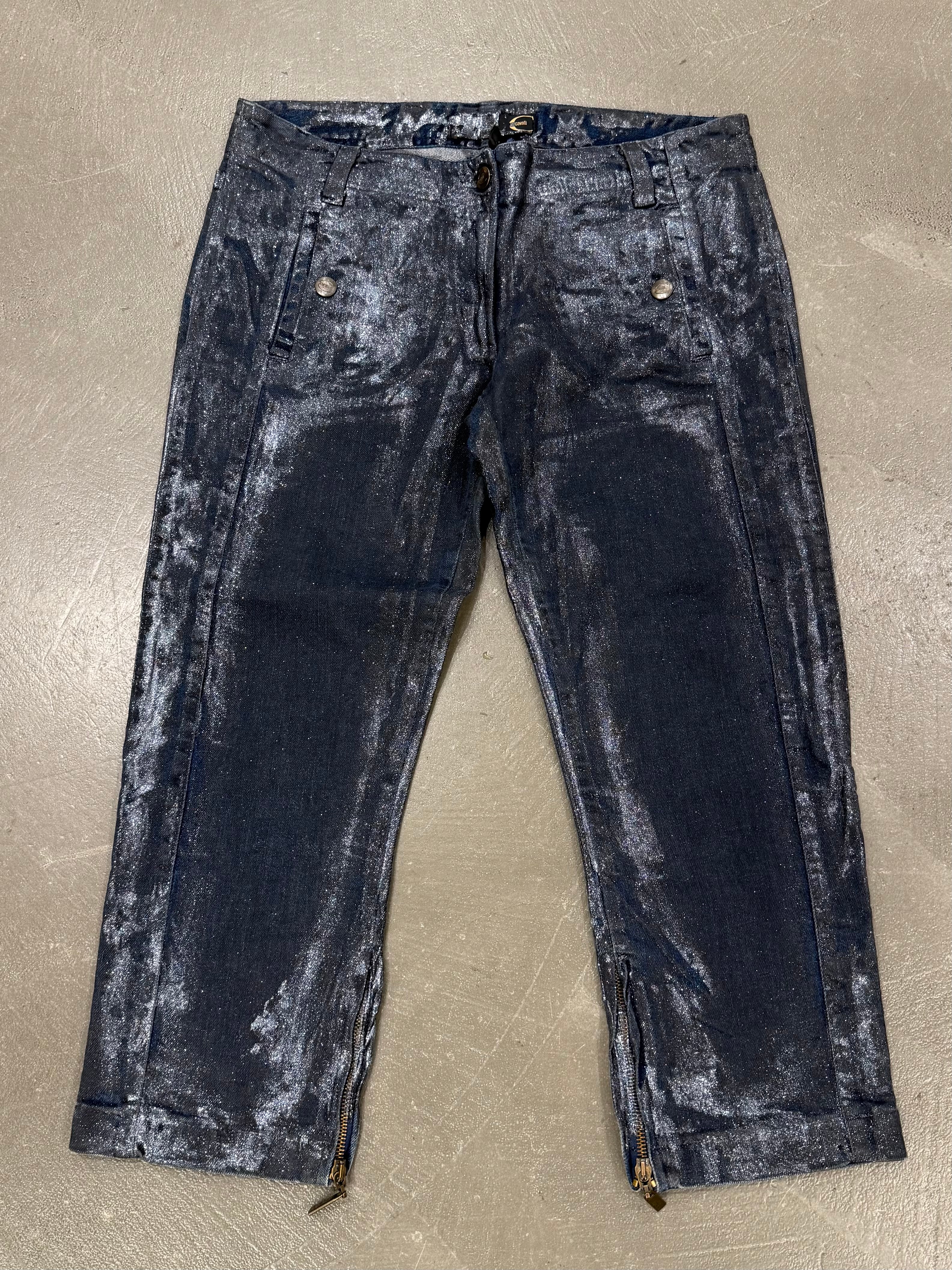 These 2000s Cavalli waxed shorts embody the brand’s sensual and rebellious denim aesthetic. Crafted in cotton with a waxed finish, they feature a low-rise cut and a slightly flared silhouette that enhances their early-2000s attitude. The coated texture adds depth and a subtle sheen, making them a bold summer statement piece.