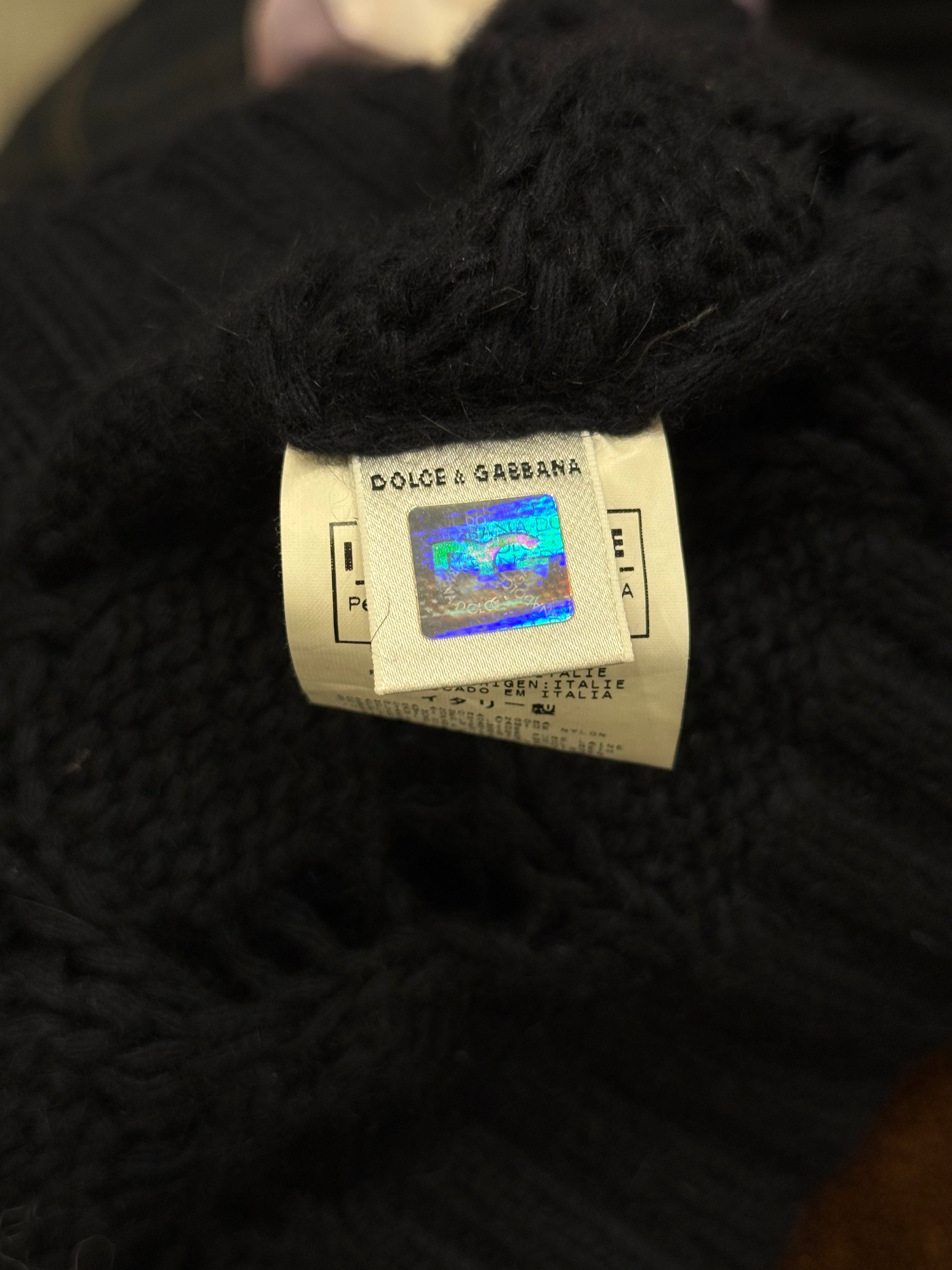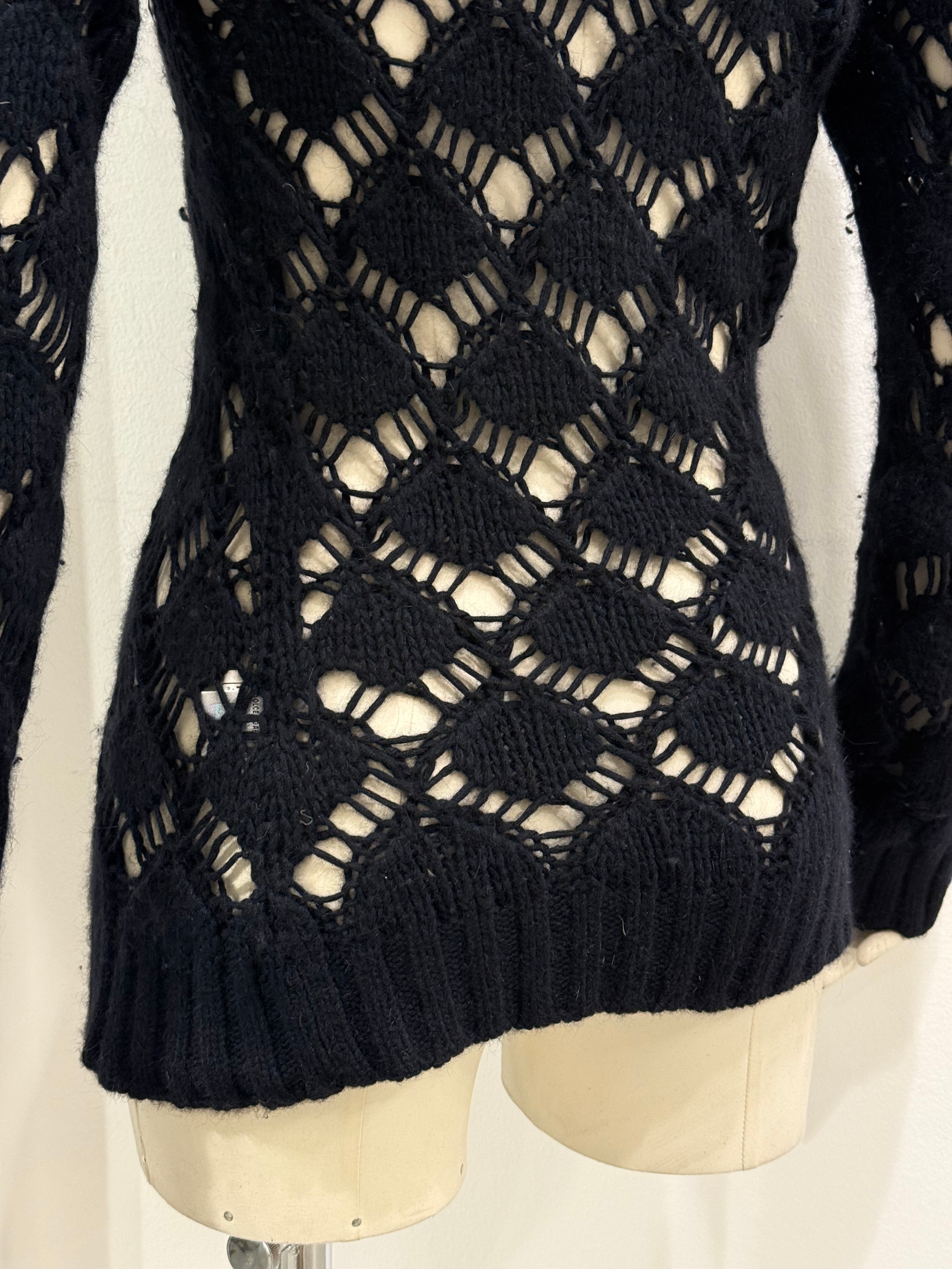 This 2000s Dolce & Gabbana knit features an open-weave mesh construction, creating a seductive yet refined look. Crafted from black stretch yarn, it has a fitted silhouette, deep neckline, and long sleeves — embodying the sensual minimalism of the brand’s early-2000s collections.