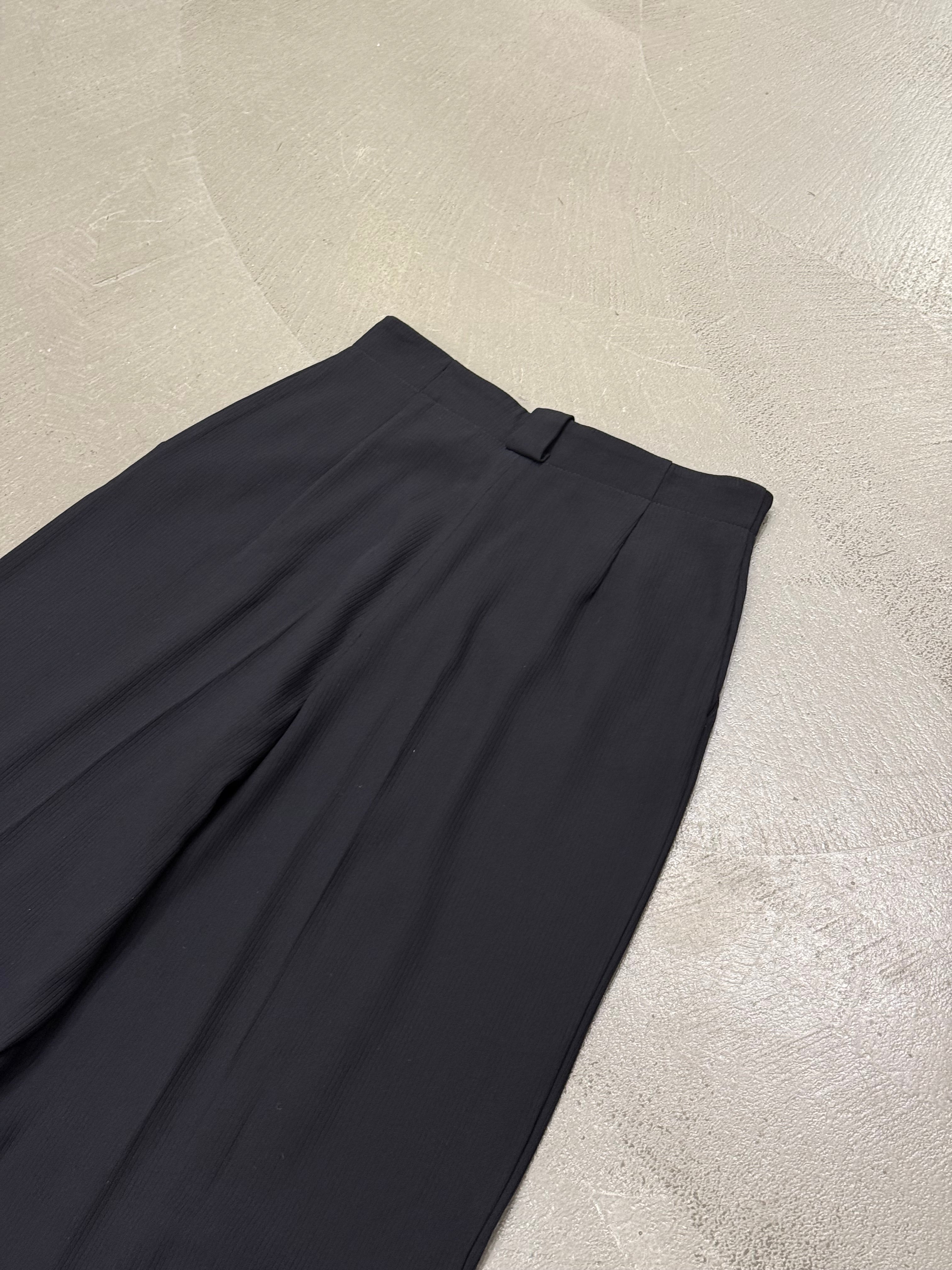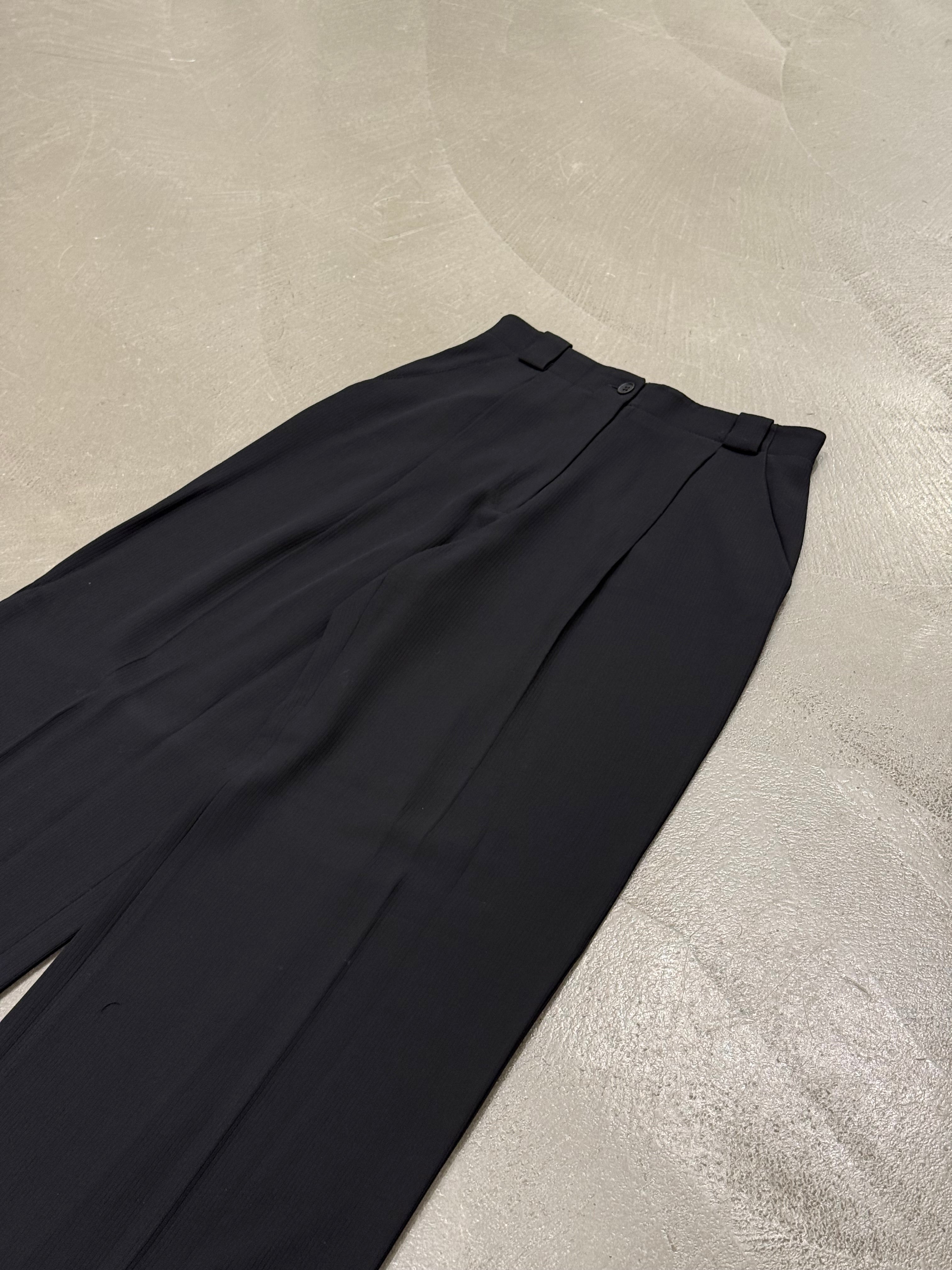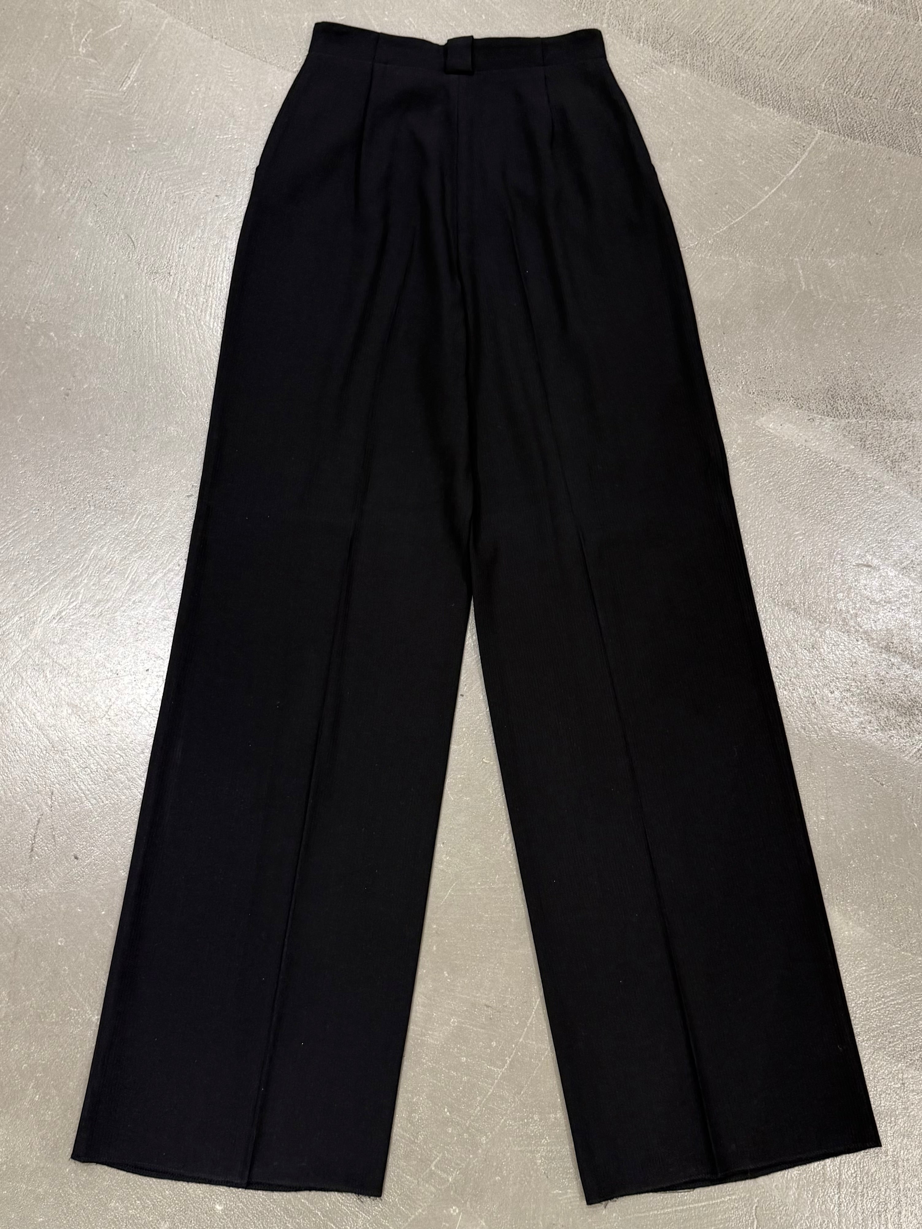 These 1990s Armani trousers showcase the brand’s elegant minimalism and mastery of drape. Tailored in black lightweight wool, they feature a high waist, wide-leg cut, and precise pleating. The relaxed yet refined silhouette makes them a quintessential example of classic Armani tailoring.