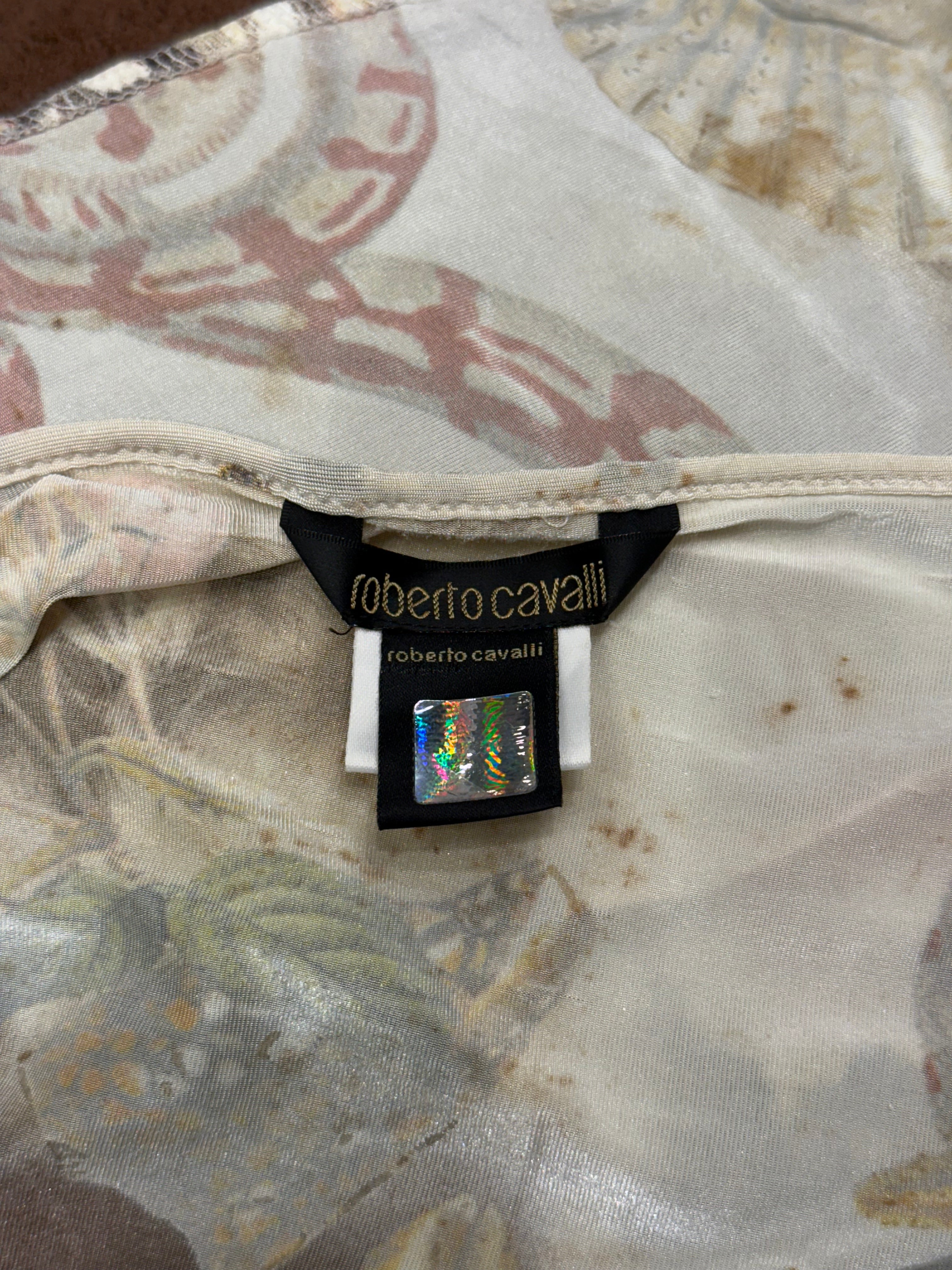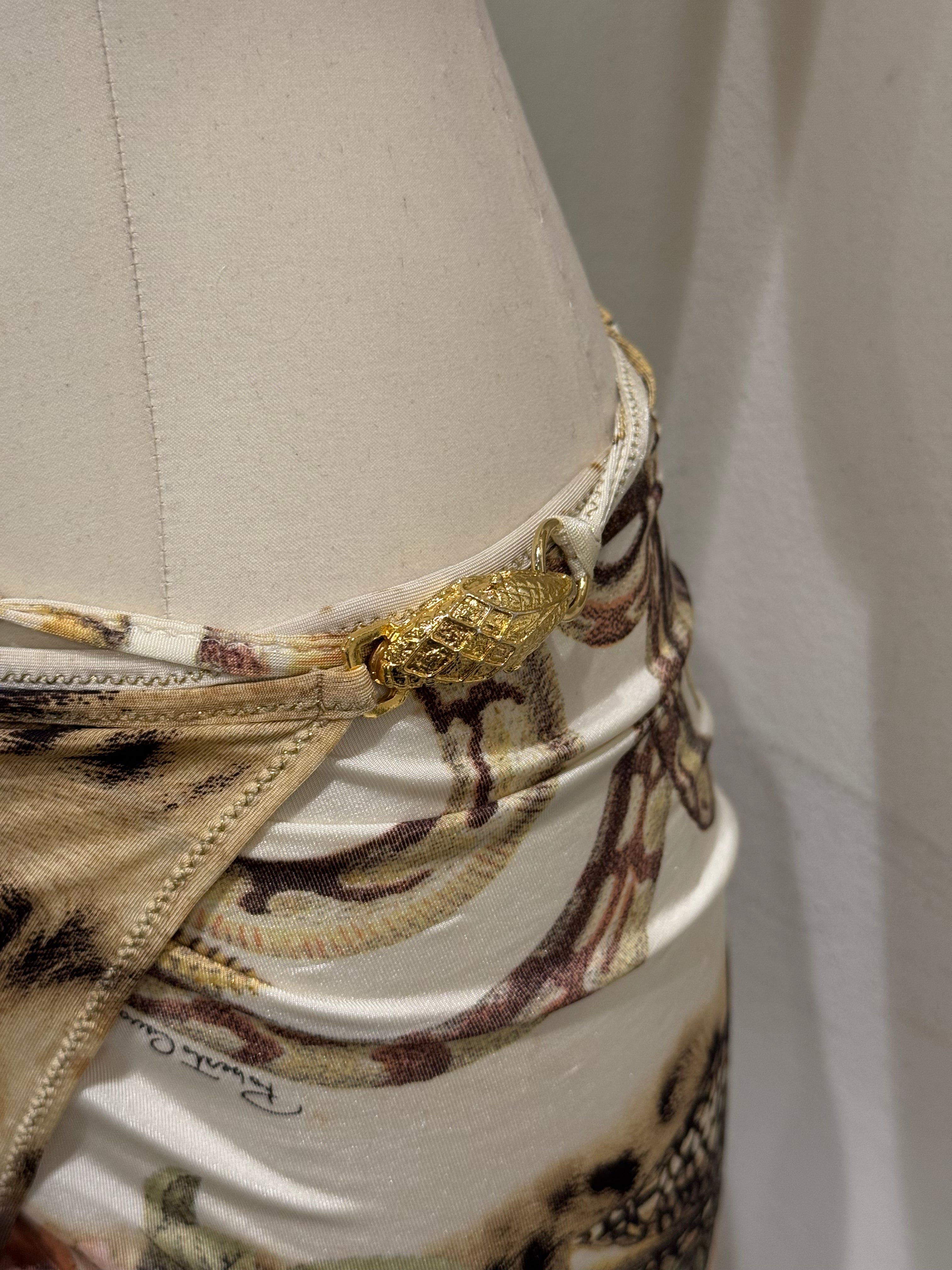 This Roberto Cavalli mini skirt from the Spring/Summer 2005 collection showcases the brand’s iconic use of vibrant prints and sensual silhouettes. Crafted from lightweight polyamide, the design features a wrap construction that drapes elegantly around the waist while highlighting the legs. The mix of animal and ornamental prints reflects Cavalli’s signature maximalist aesthetic of the mid-2000s.