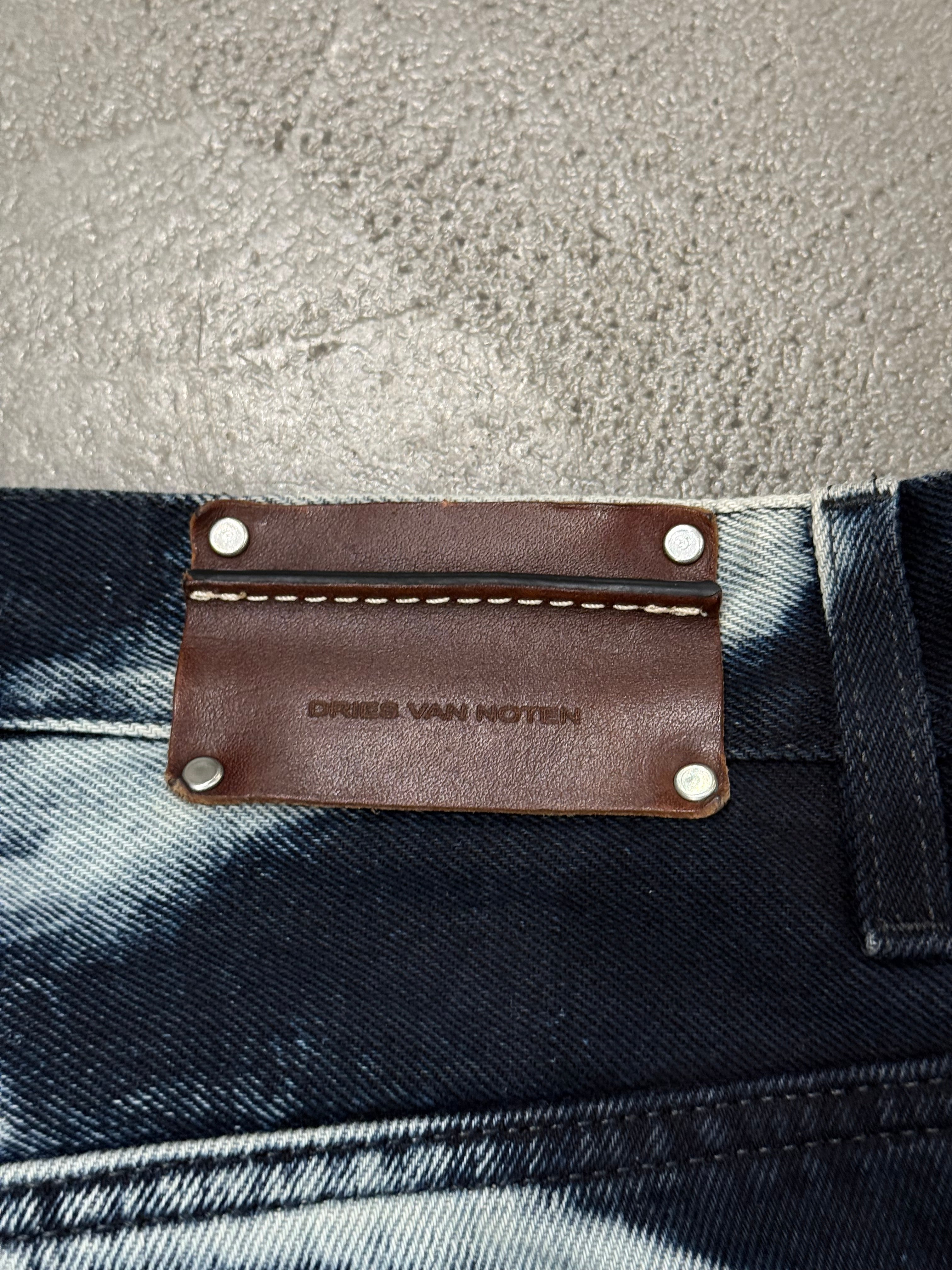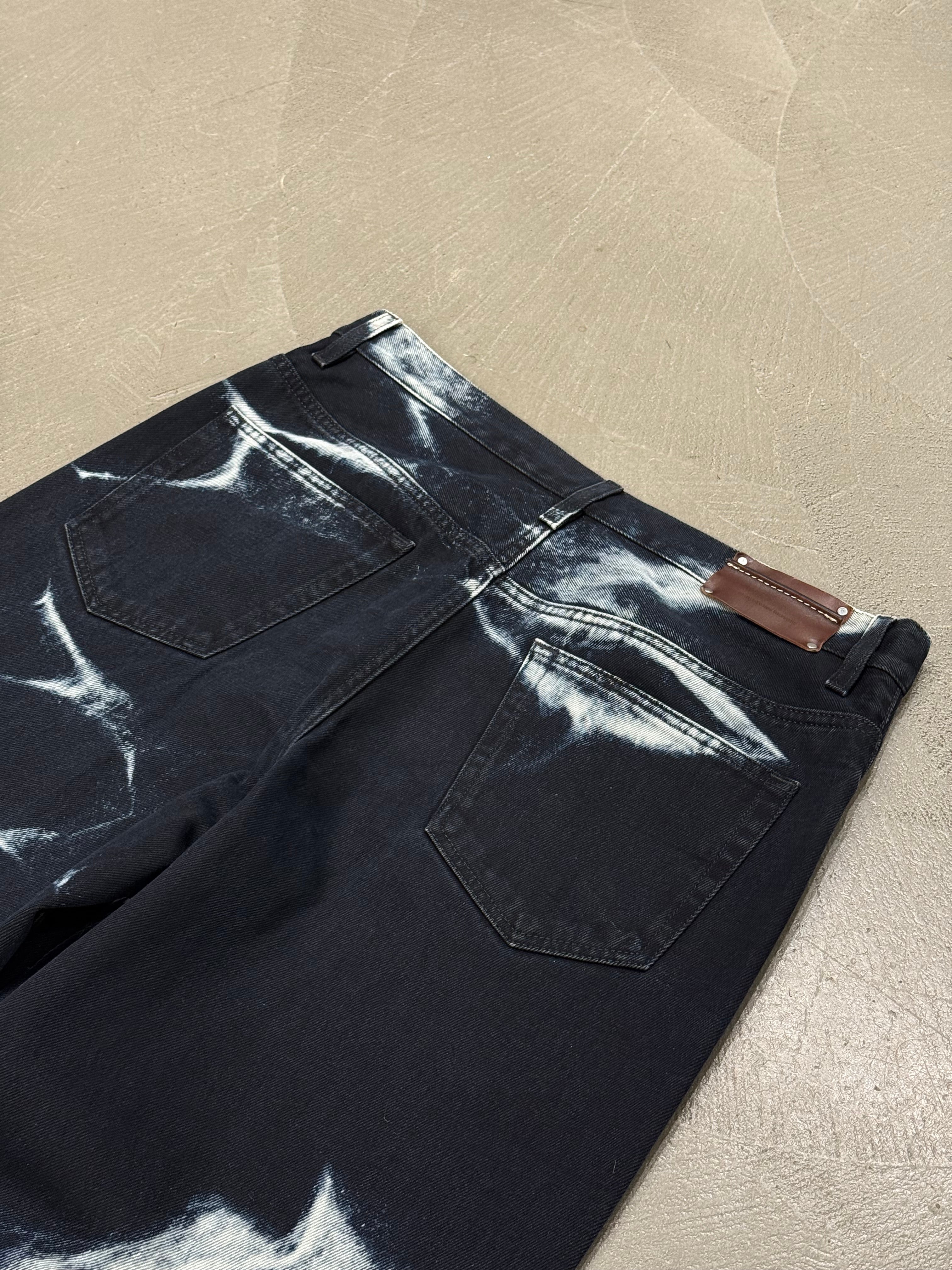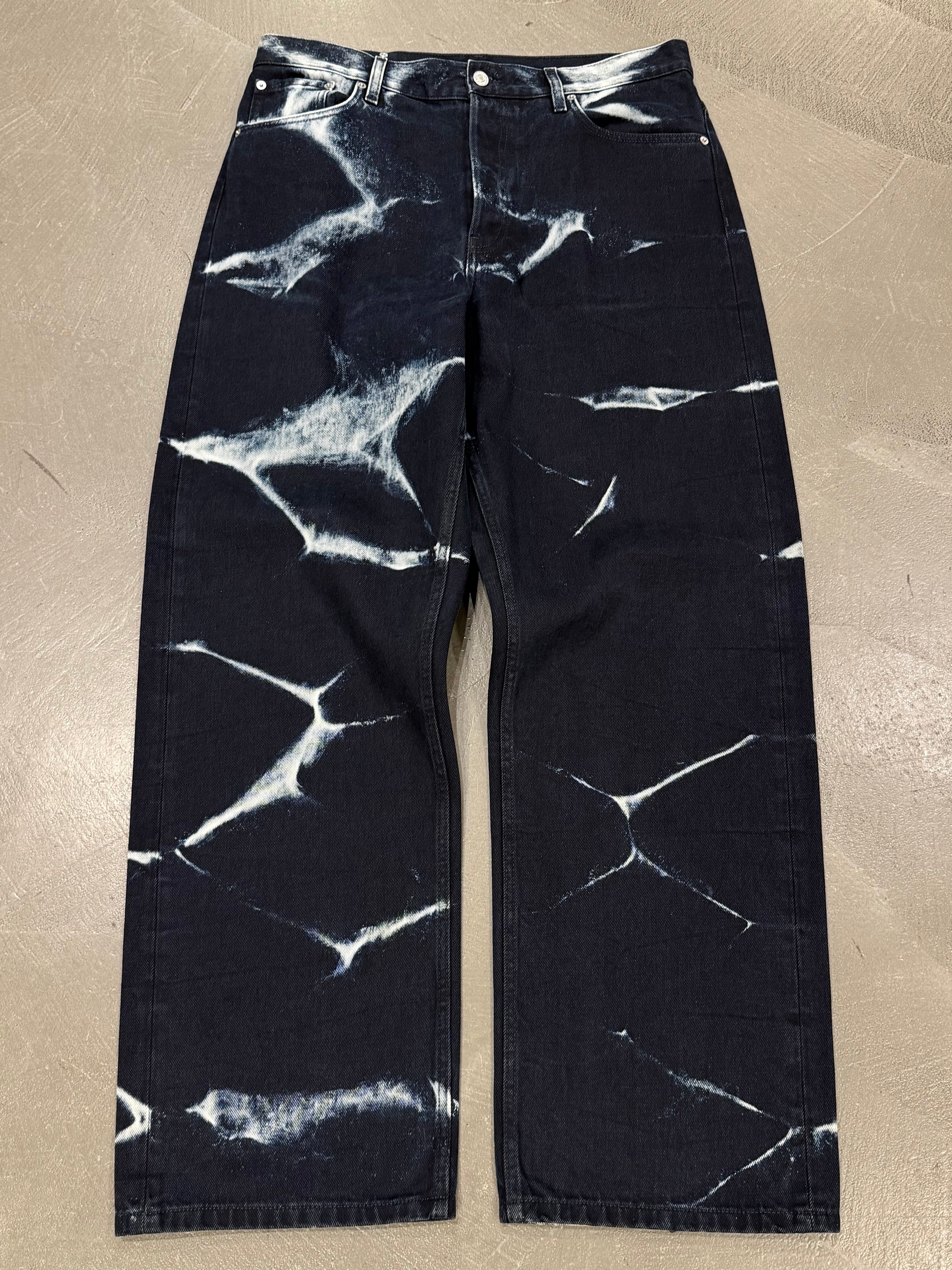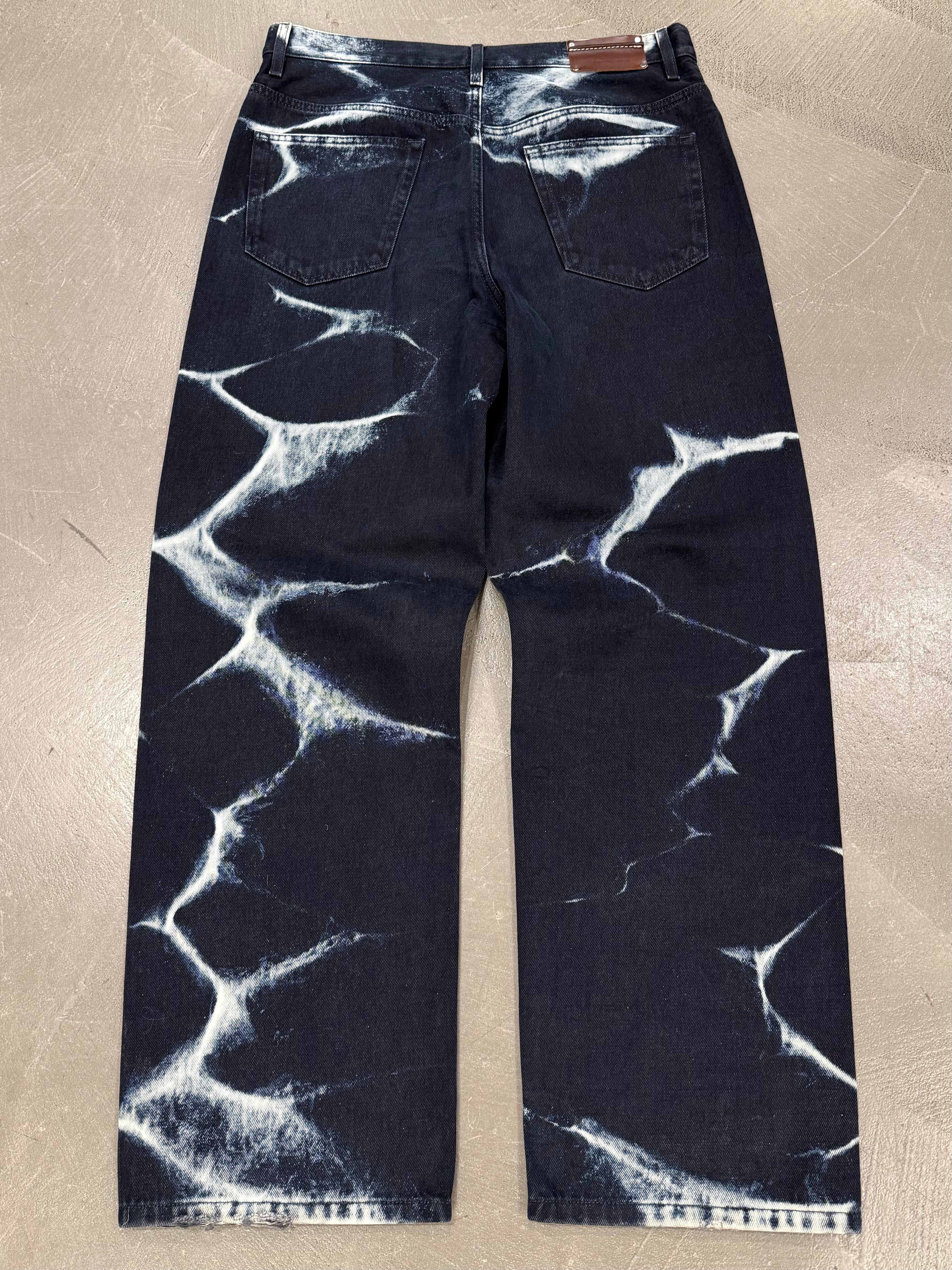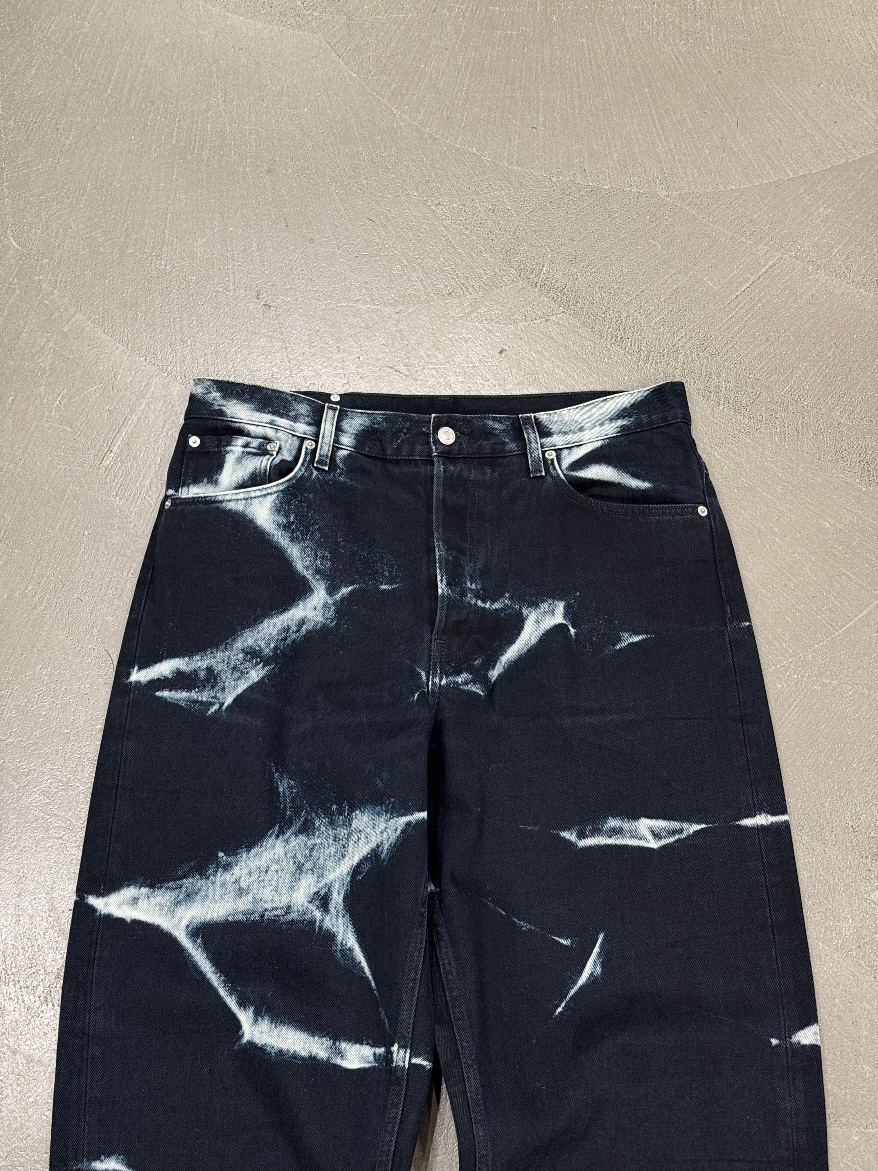 These Dries Van Noten pants from the Autumn/Winter 2022 collection feature a striking acid-wash effect that creates an electric, almost abstract pattern across the fabric. Crafted from cotton, they combine a classic straight-leg cut with a bold surface treatment, resulting in a piece that feels both wearable and visually impactful.