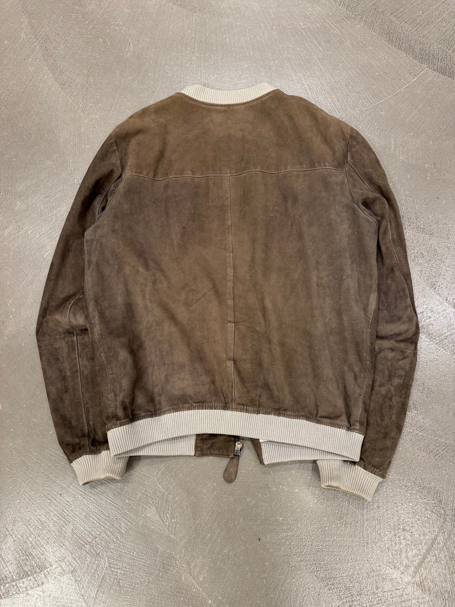 This Yves Saint Laurent suede jacket from the 1990s embodies classic elegance with a relaxed, sporty touch. Crafted from soft brown suede, it features a ribbed collar, cuffs, and hem in a contrasting cream tone, along with a full zip closure and slanted pockets. The minimalist design and refined materials make it a timeless wardrobe staple.