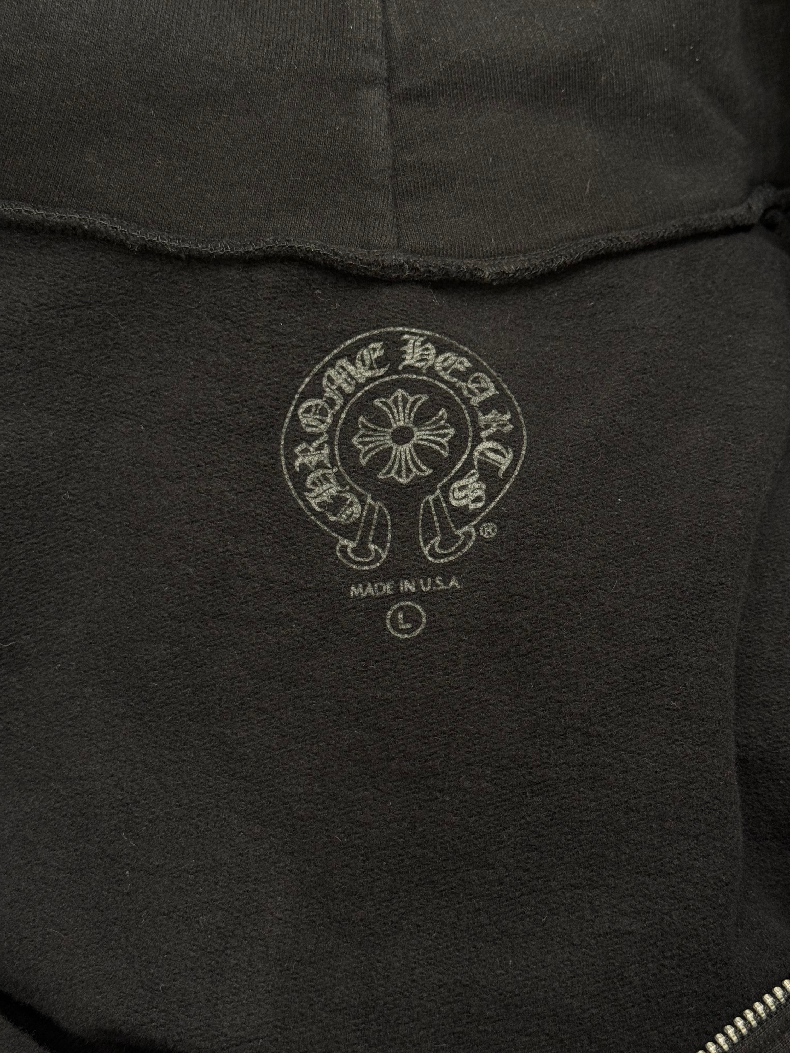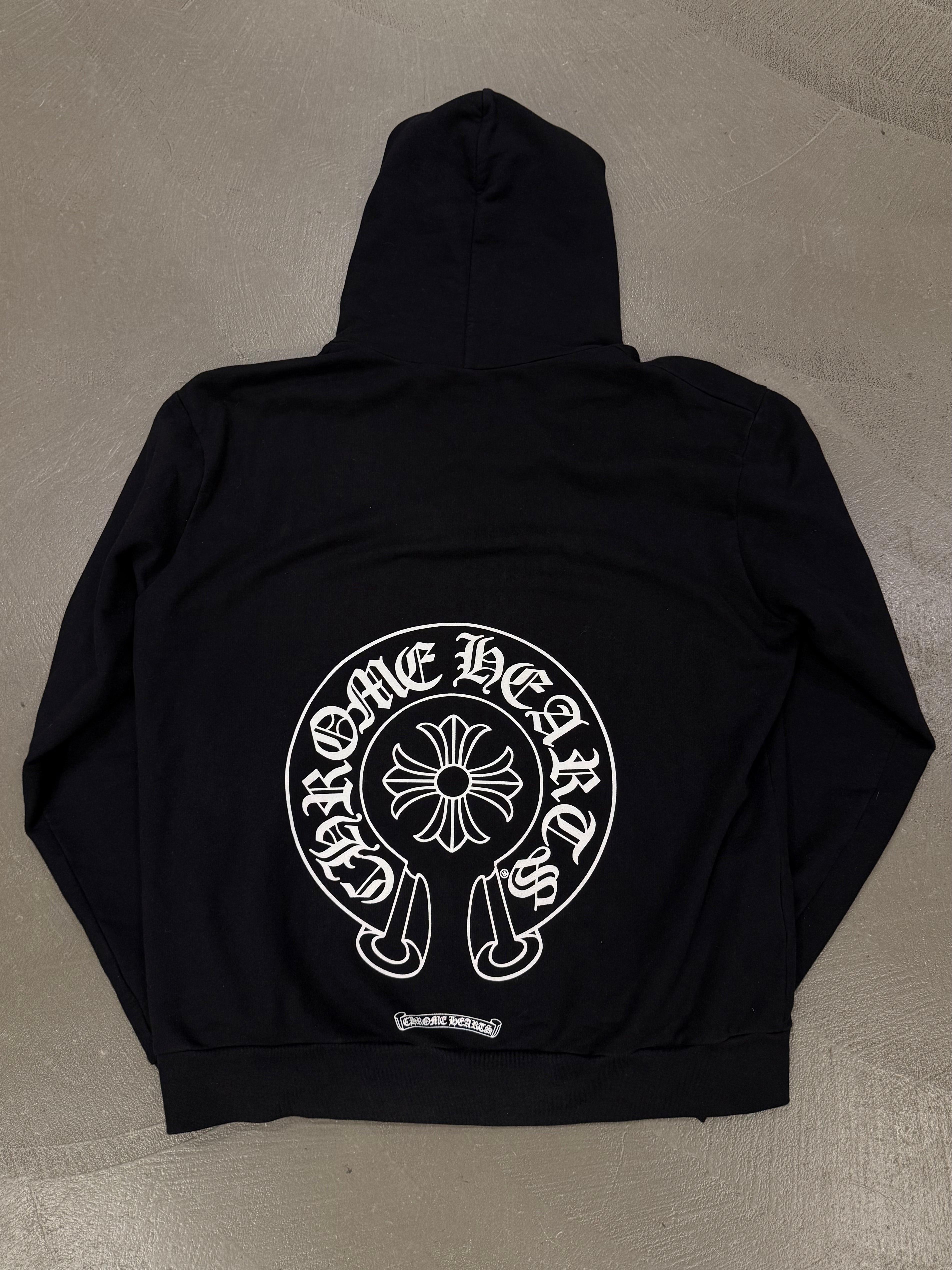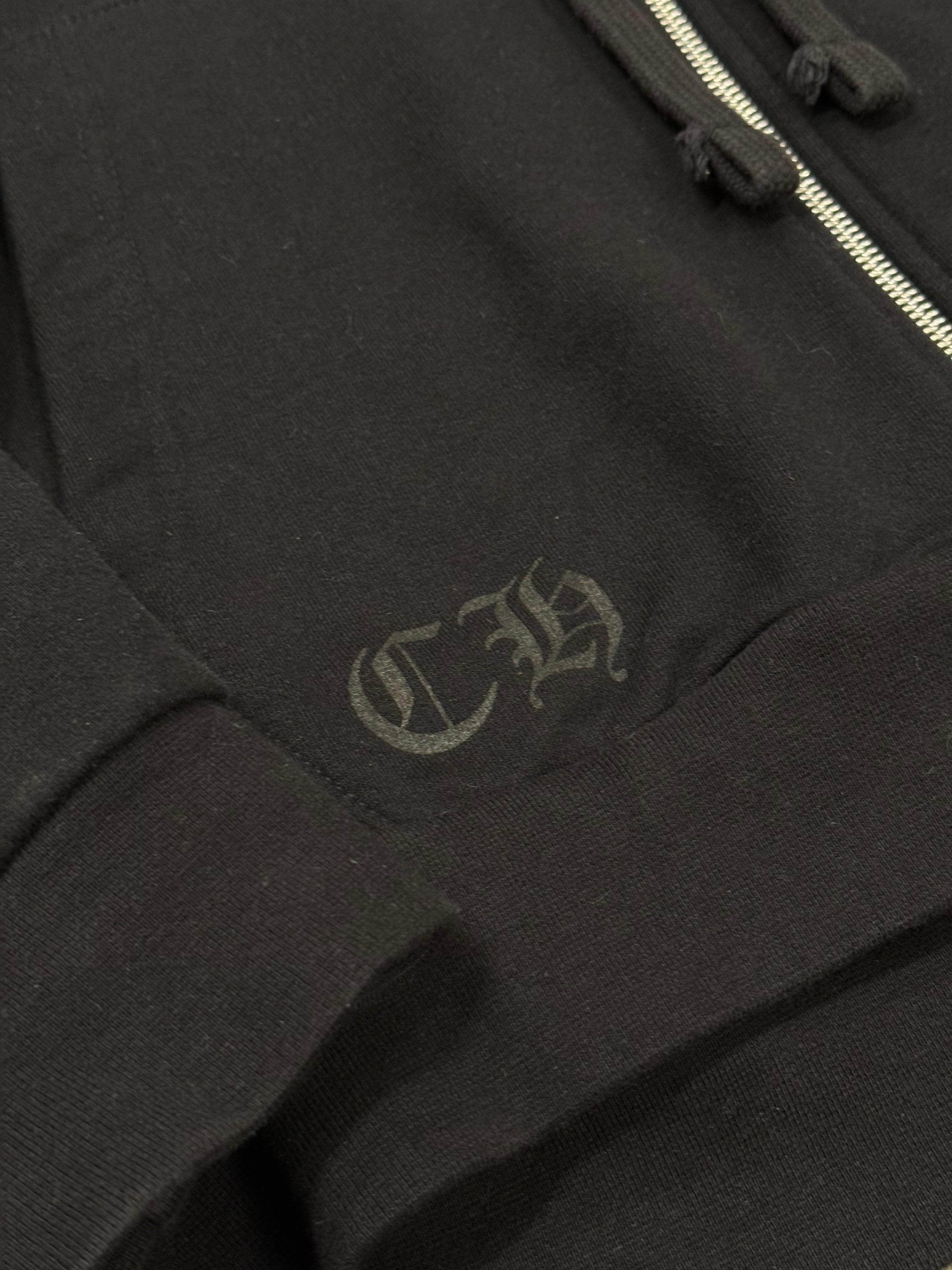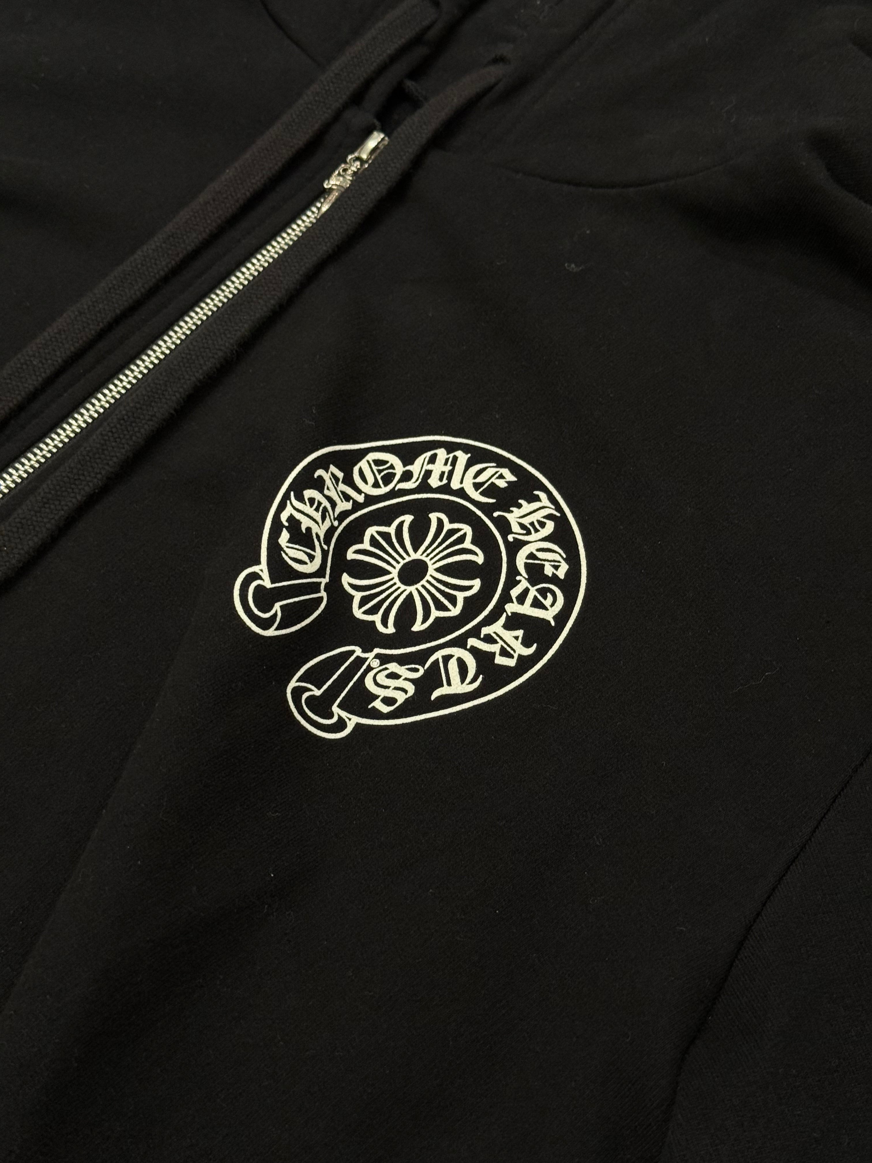 This Chrome Hearts zip-up hoodie features the brand’s iconic multicolor horseshoe logos applied along the sleeves. Crafted with a heavyweight construction, it merges streetwear attitude with the label’s unmistakable gothic-luxury identity.