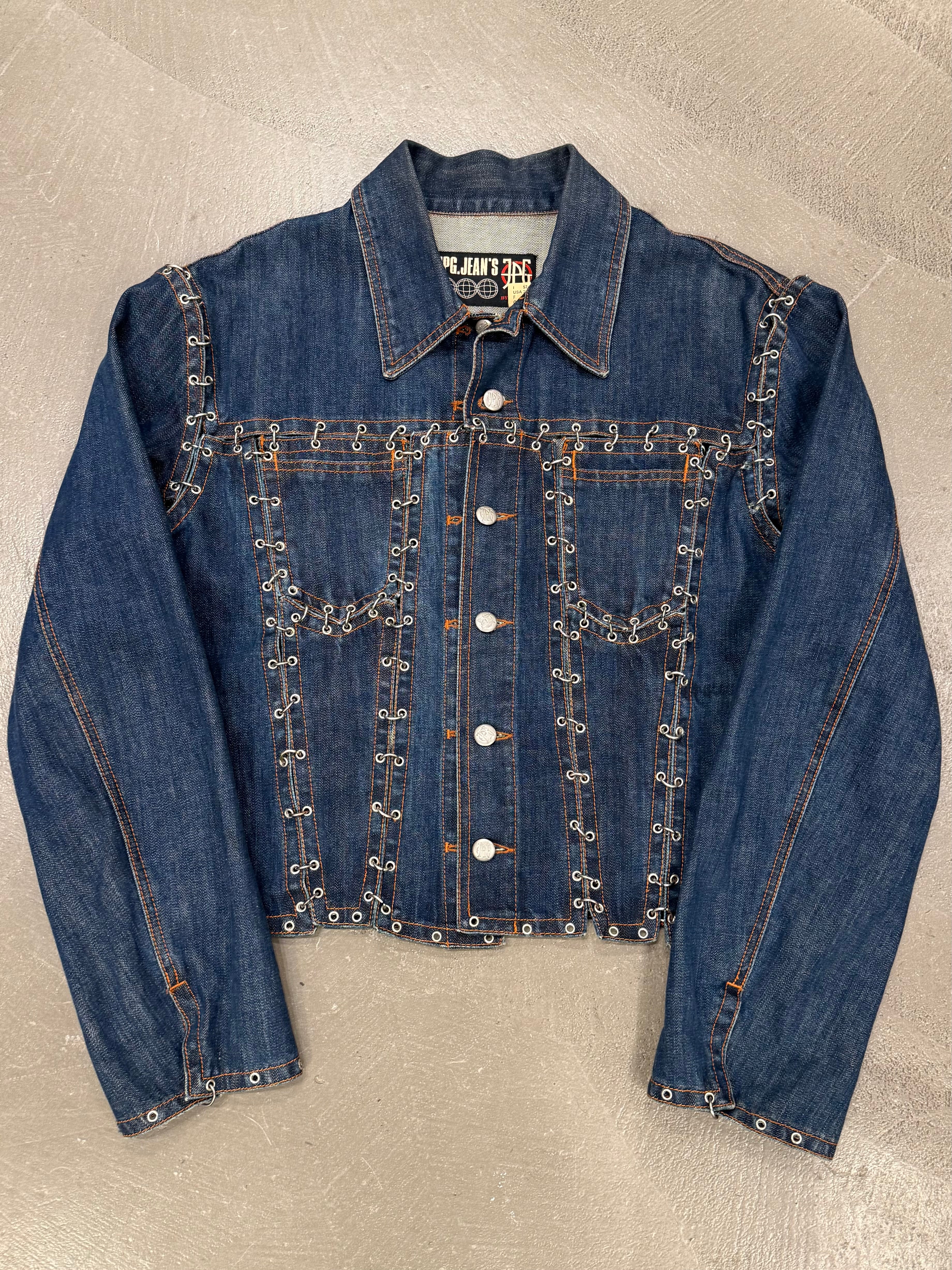 This early 2000s Jean Paul Gaultier denim jacket features a patchwork construction enriched with pierced metal detailing, creating a bold interplay between denim and hardware. A statement outerwear piece that reflects Gaultier’s experimental approach to surface, ornamentation, and subversive tailoring.