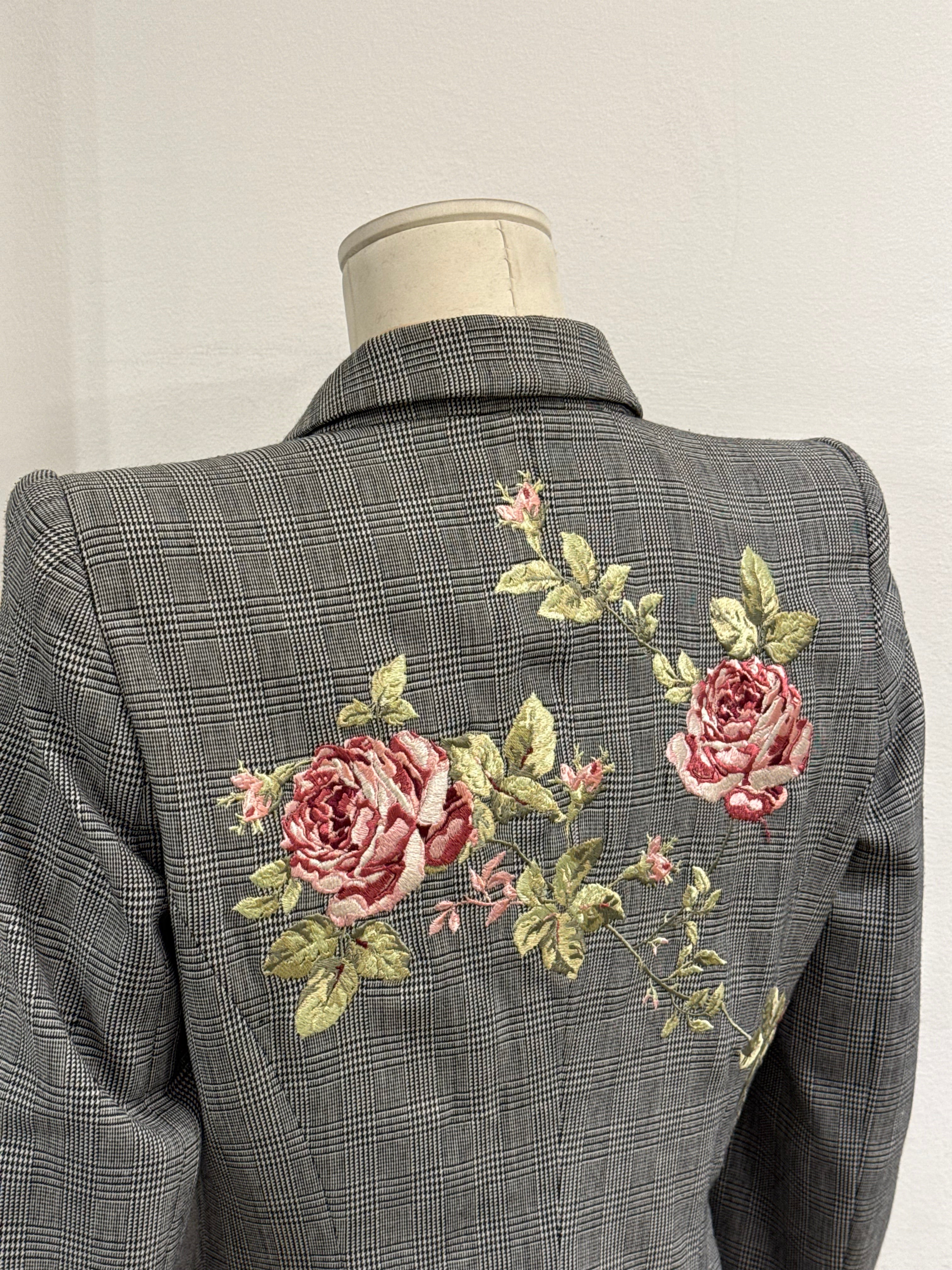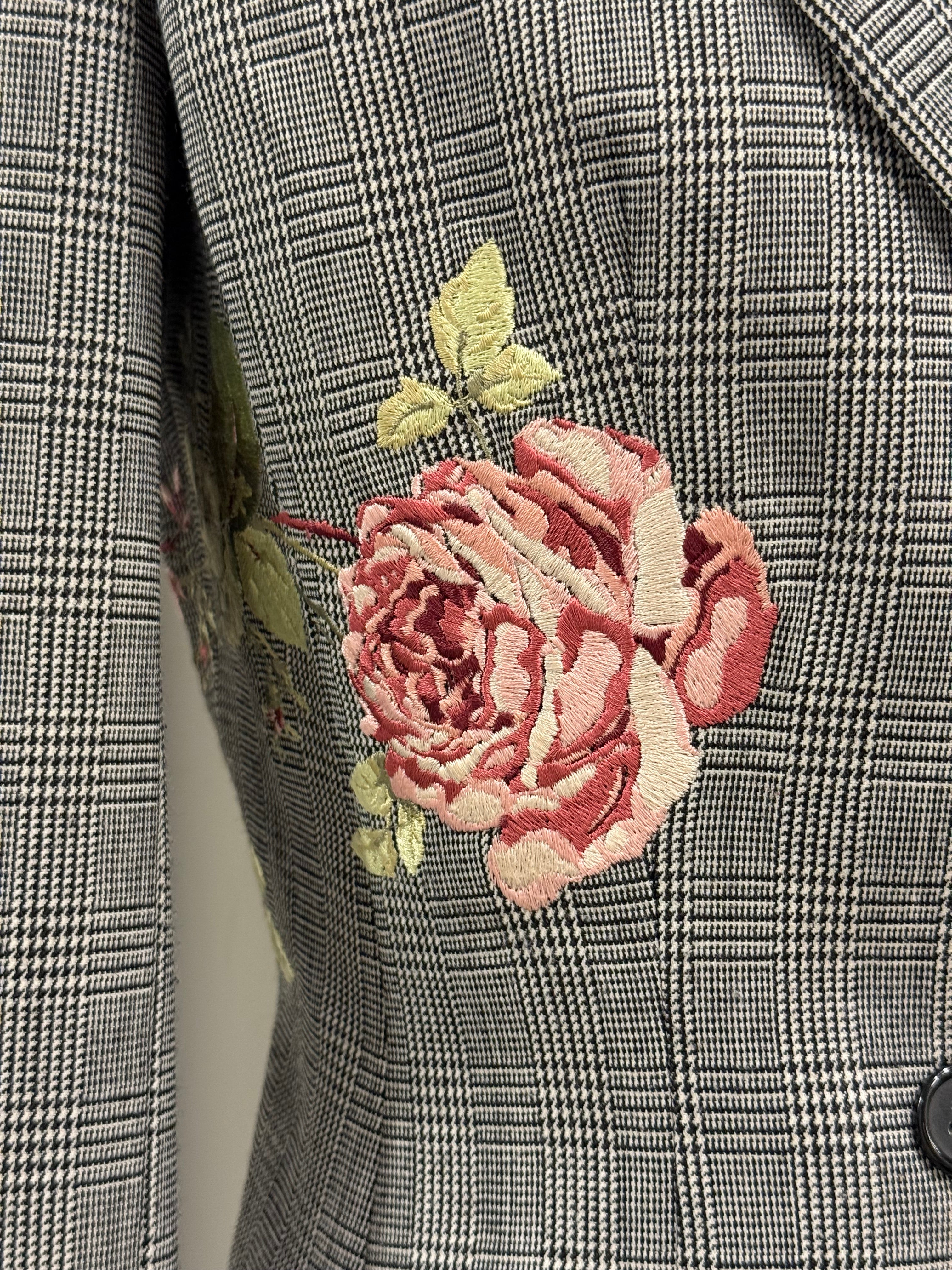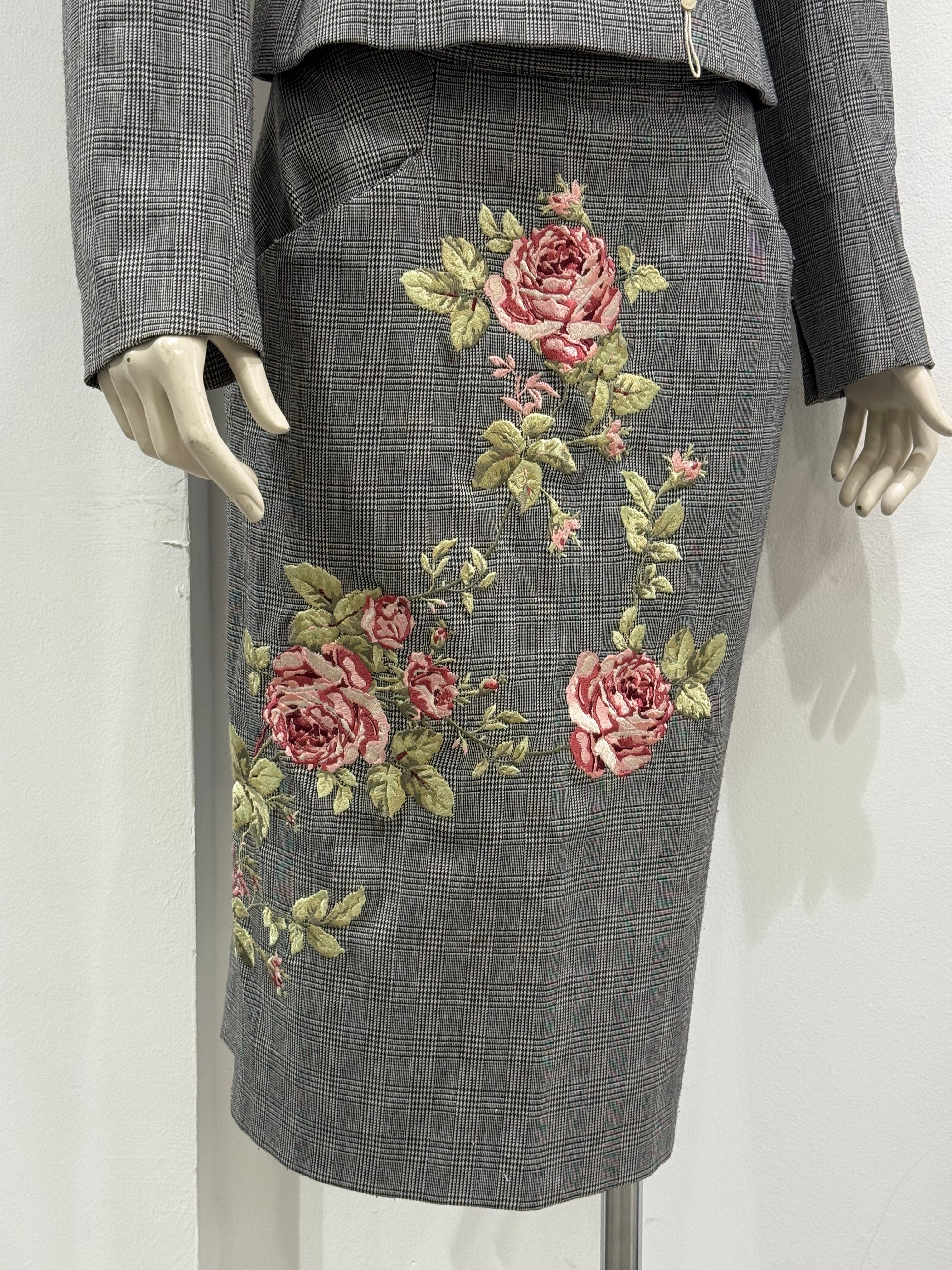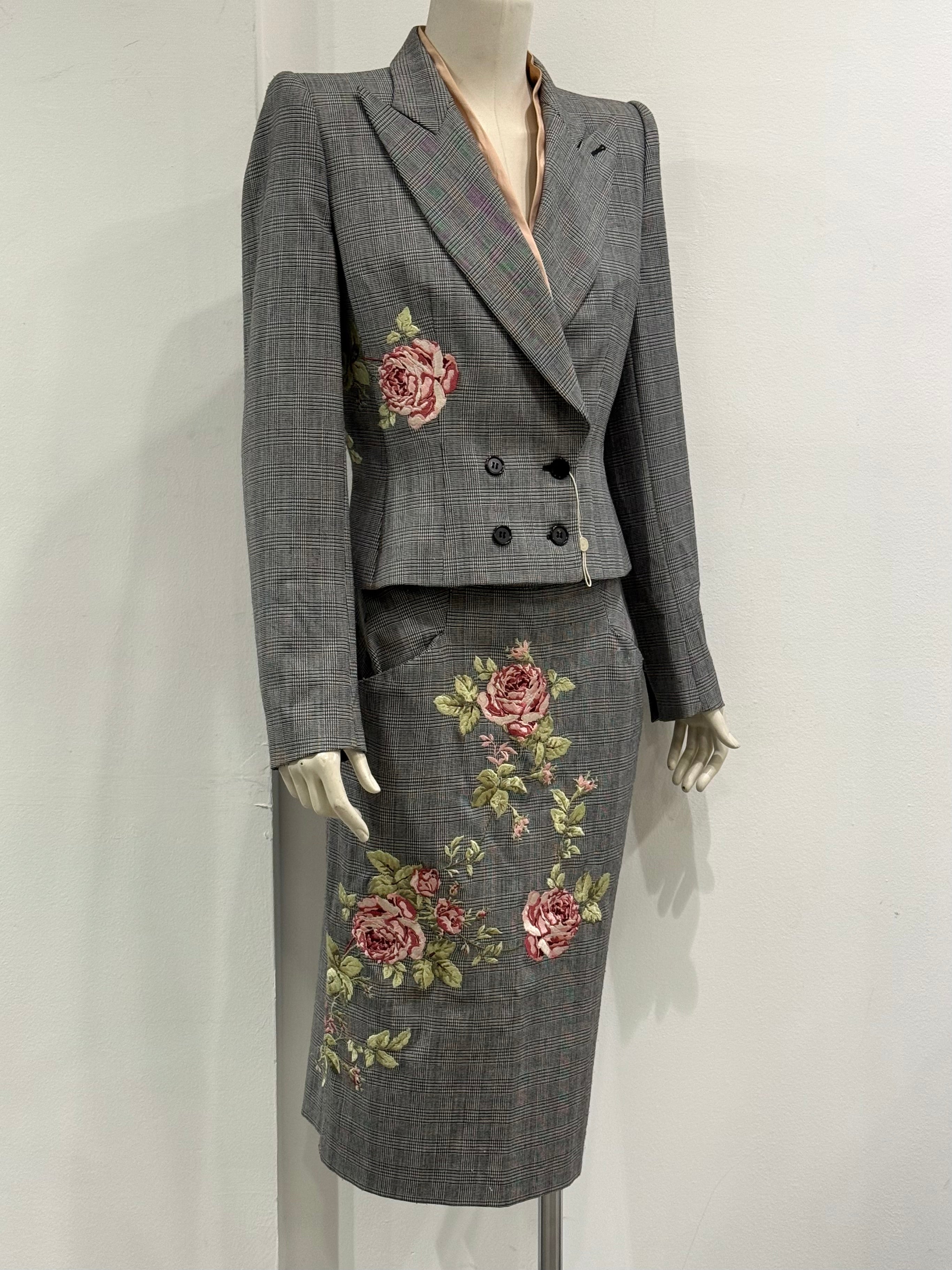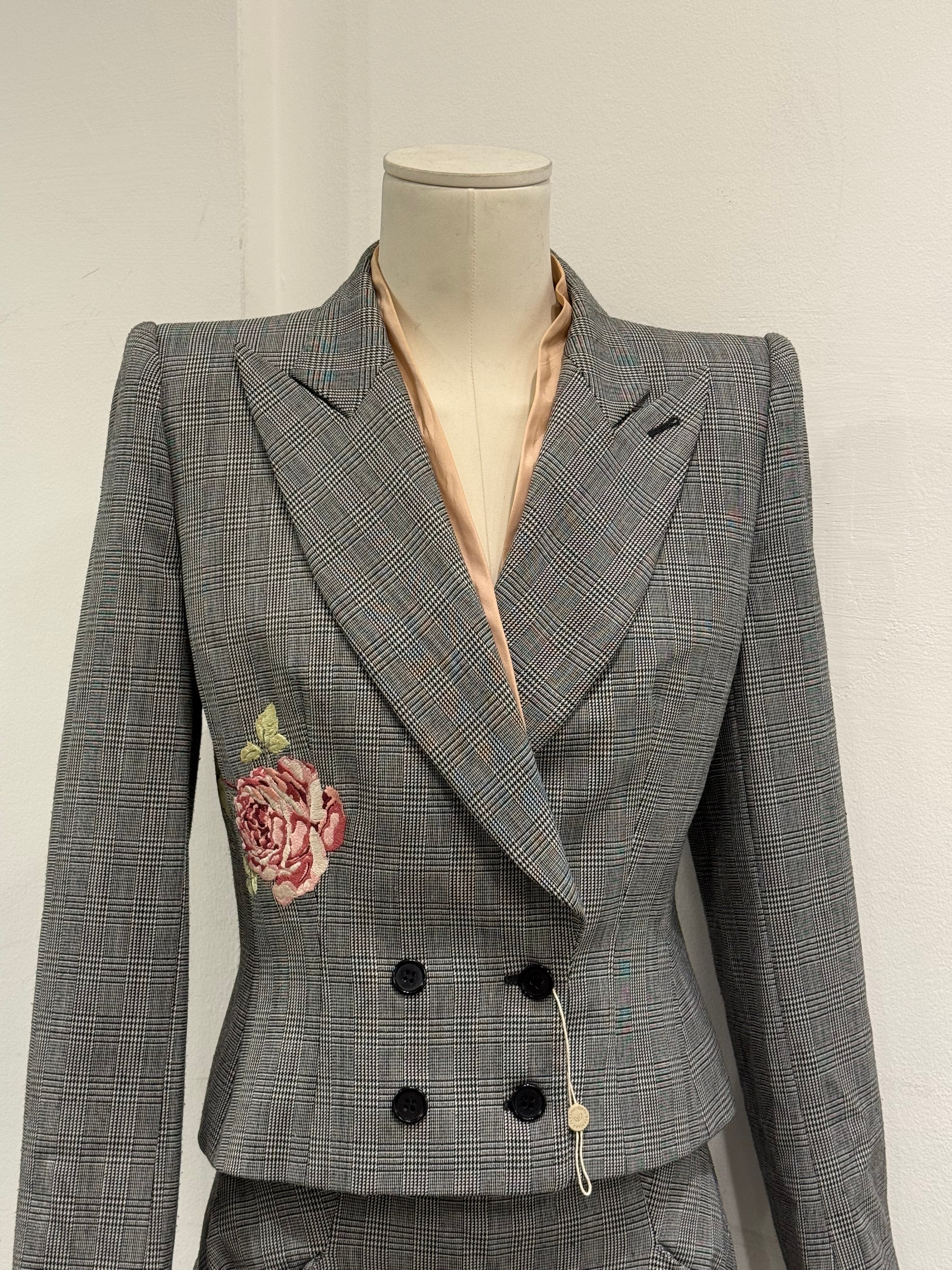 Exceptional runway suit set from Alexander McQueen’s Autumn/Winter 1997 collection. Composed of a fitted grey checked wool blazer with strong shoulders and a matching pencil skirt, both detailed with intricate floral embroidery. A museum-worthy piece showcasing McQueen’s mastery of tailoring and romantic contrast.