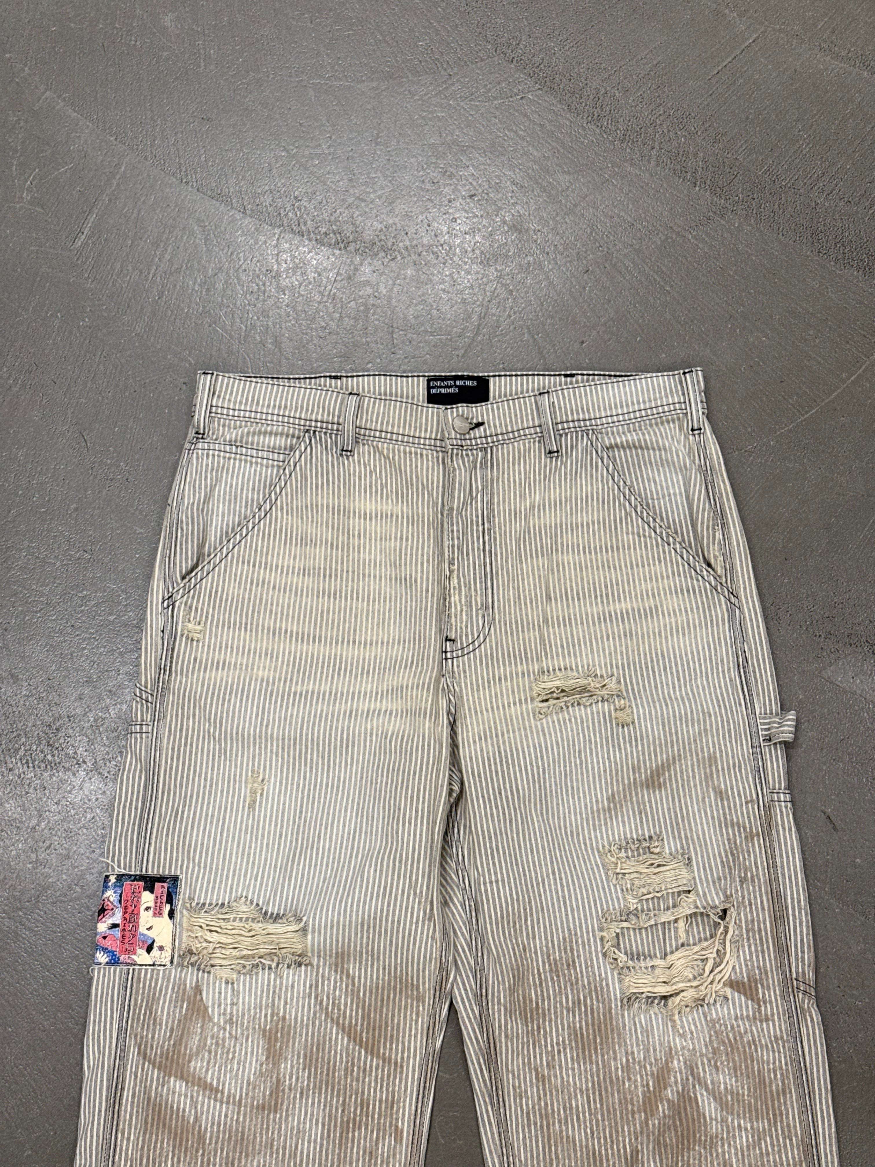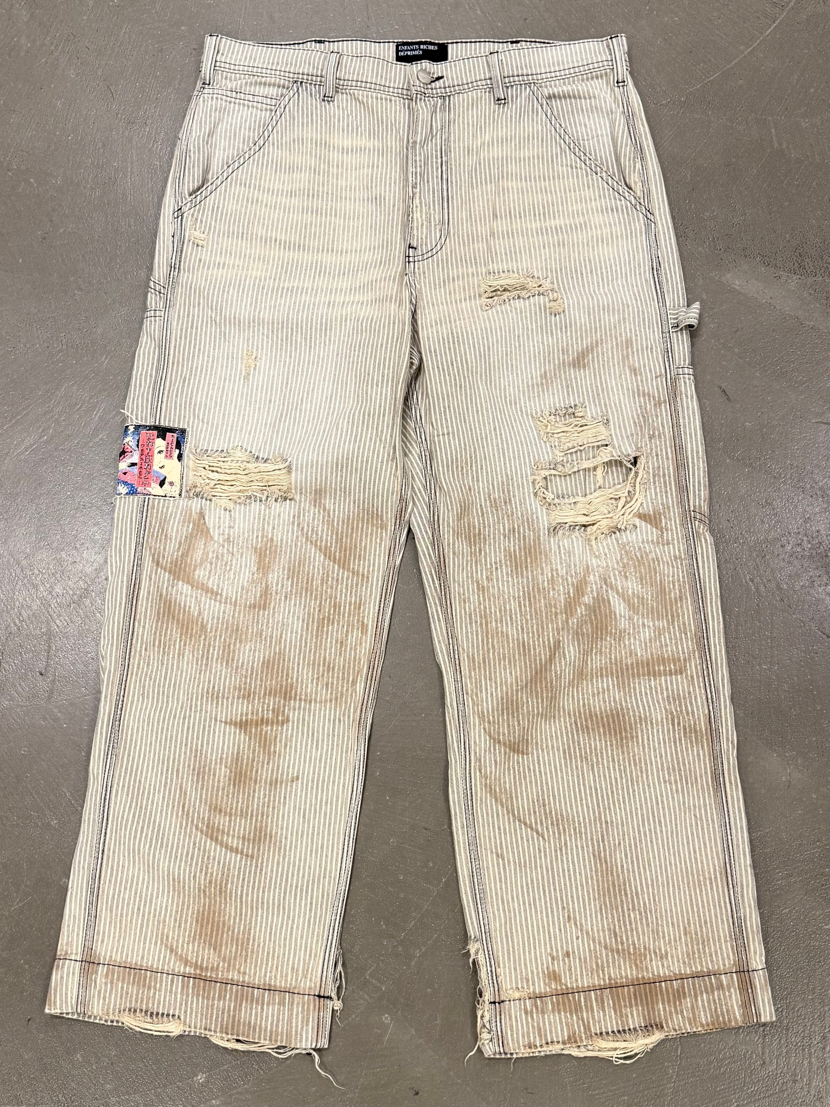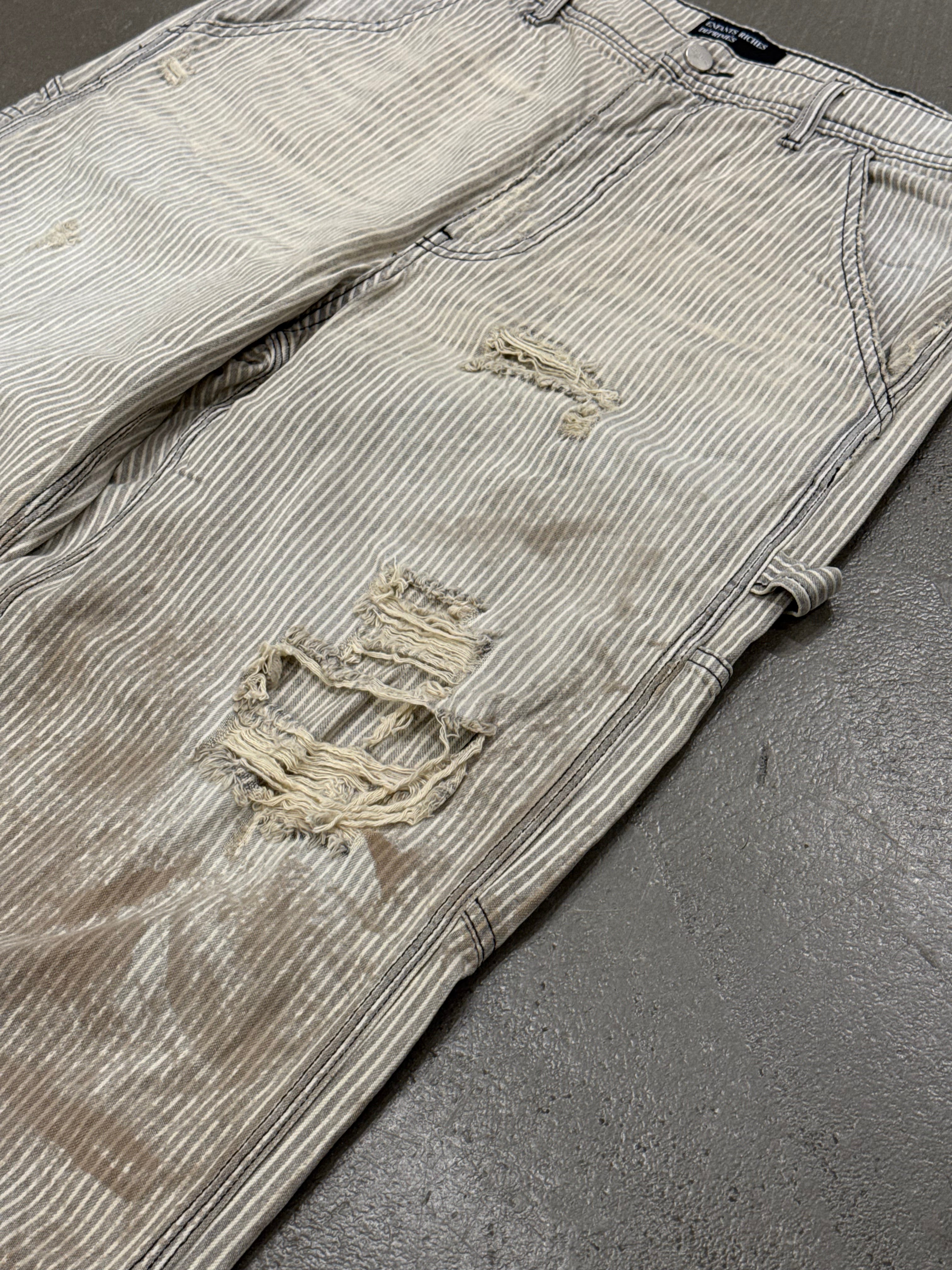 From Enfants Riches Déprimés’ Spring/Summer 2024 collection, these Hickory Stripe Shuji pants reinterpret vintage American workwear with an avant-garde edge. Crafted from washed cotton, they feature intentional distressing, raw hems, and a wide cropped fit. The result is a bold juxtaposition of refined craftsmanship and deconstructed aesthetics.