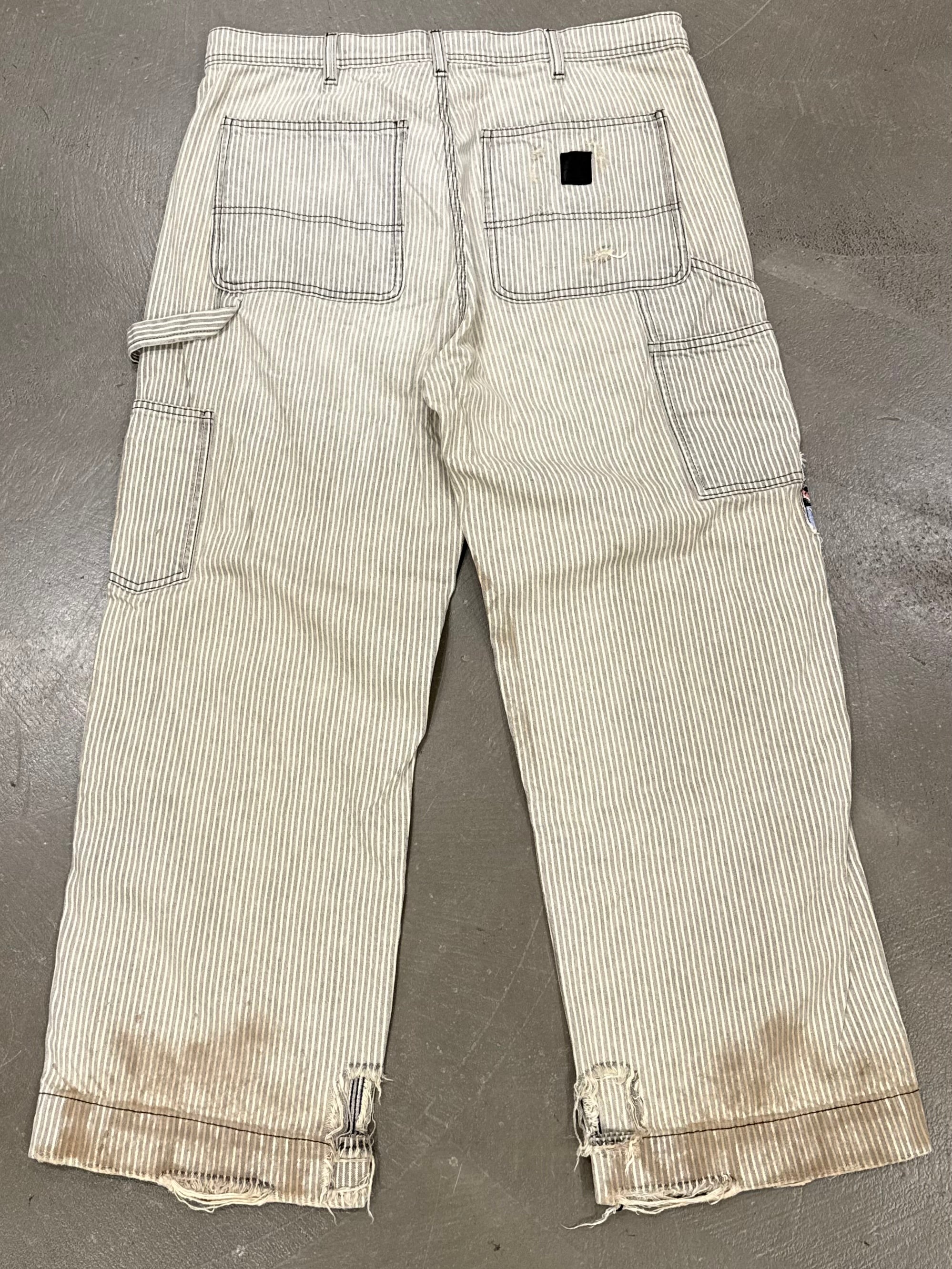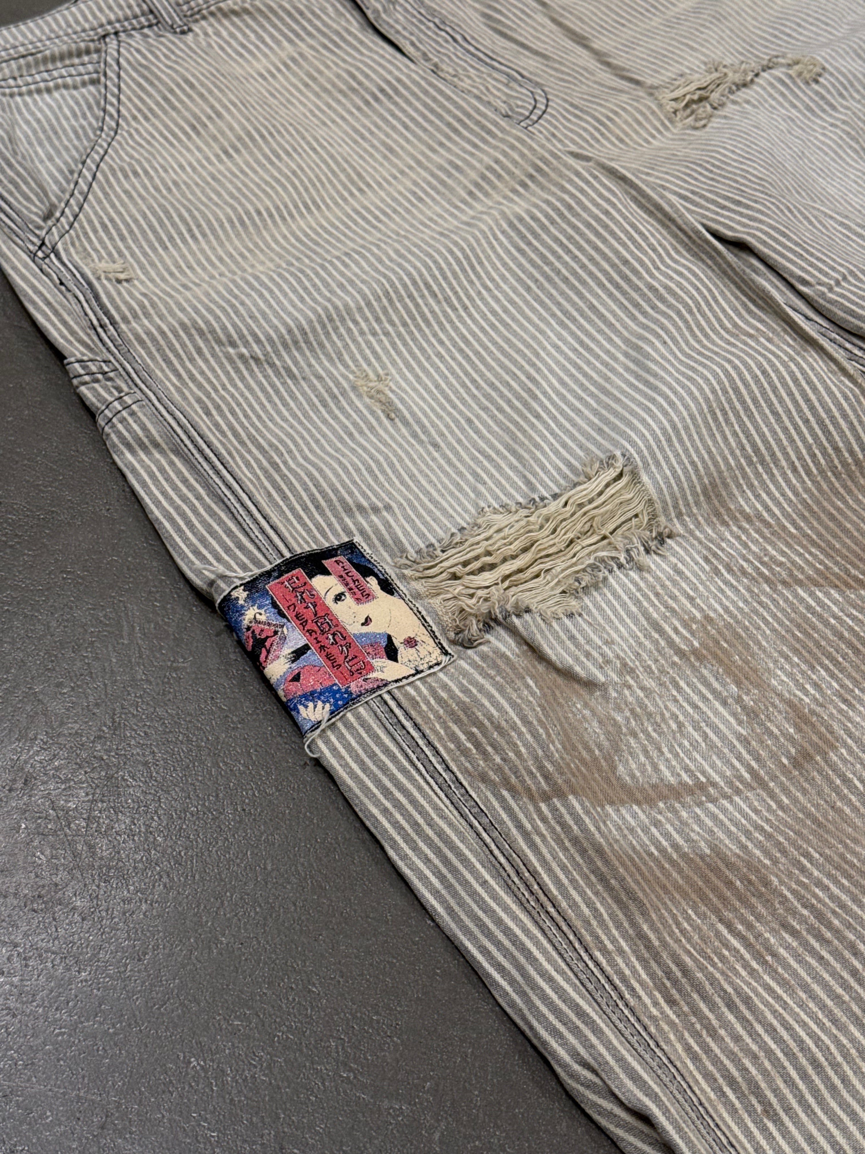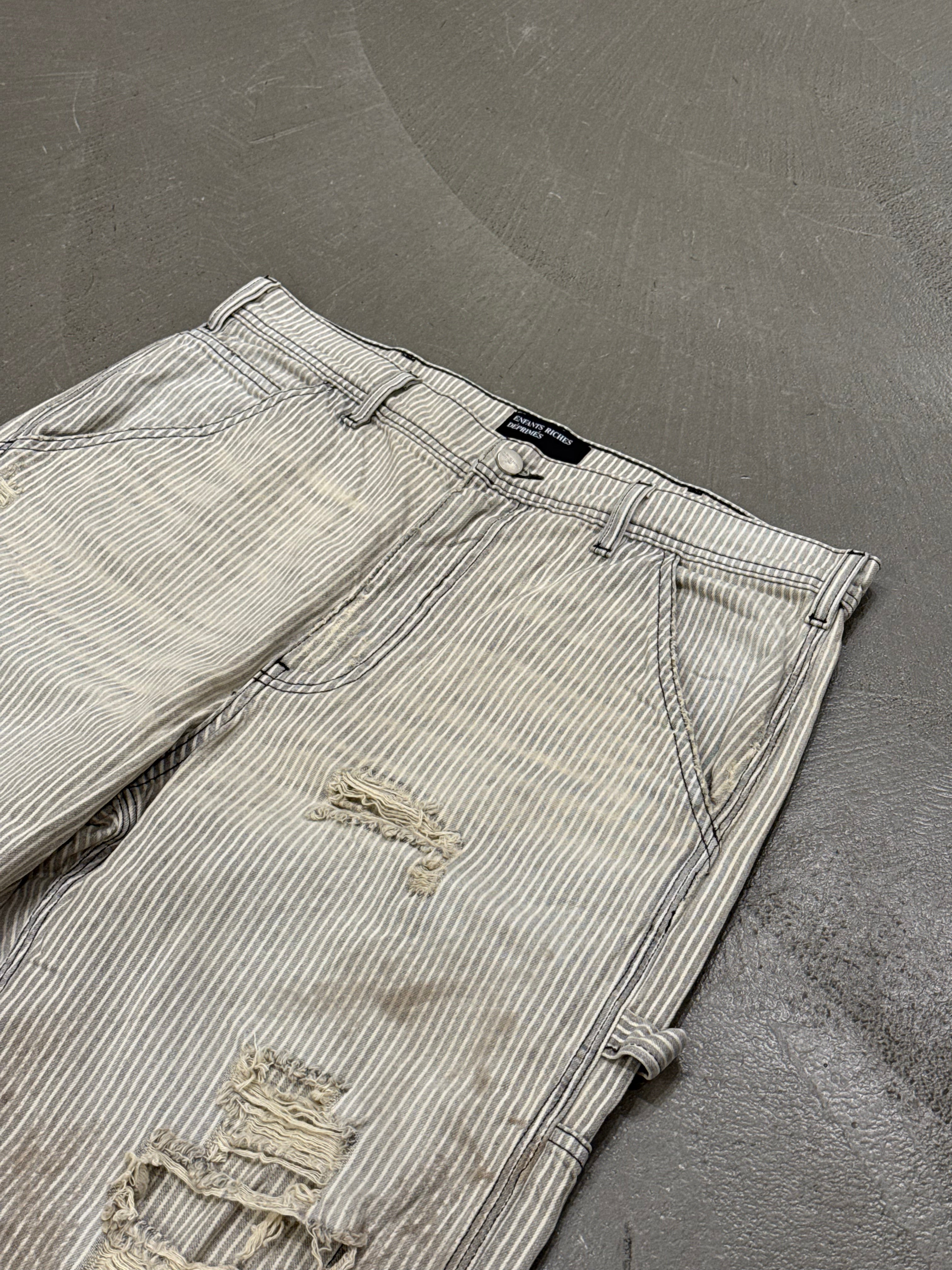 From Enfants Riches Déprimés’ Spring/Summer 2024 collection, these Hickory Stripe Shuji pants reinterpret vintage American workwear with an avant-garde edge. Crafted from washed cotton, they feature intentional distressing, raw hems, and a wide cropped fit. The result is a bold juxtaposition of refined craftsmanship and deconstructed aesthetics.