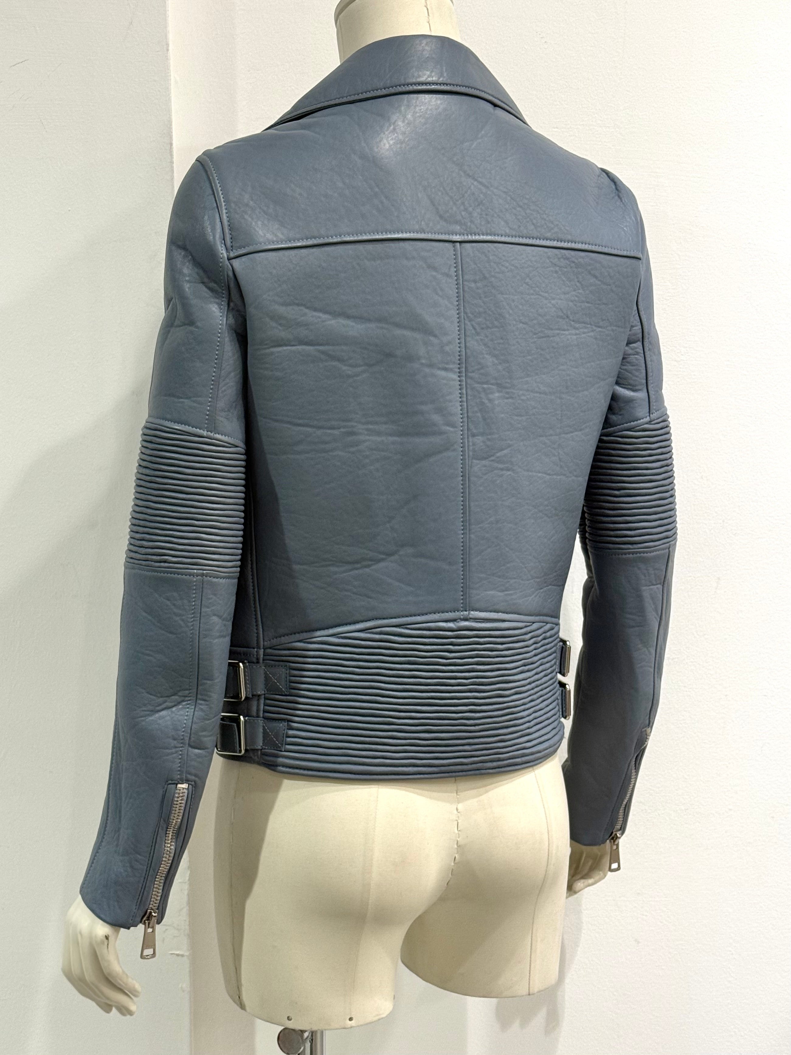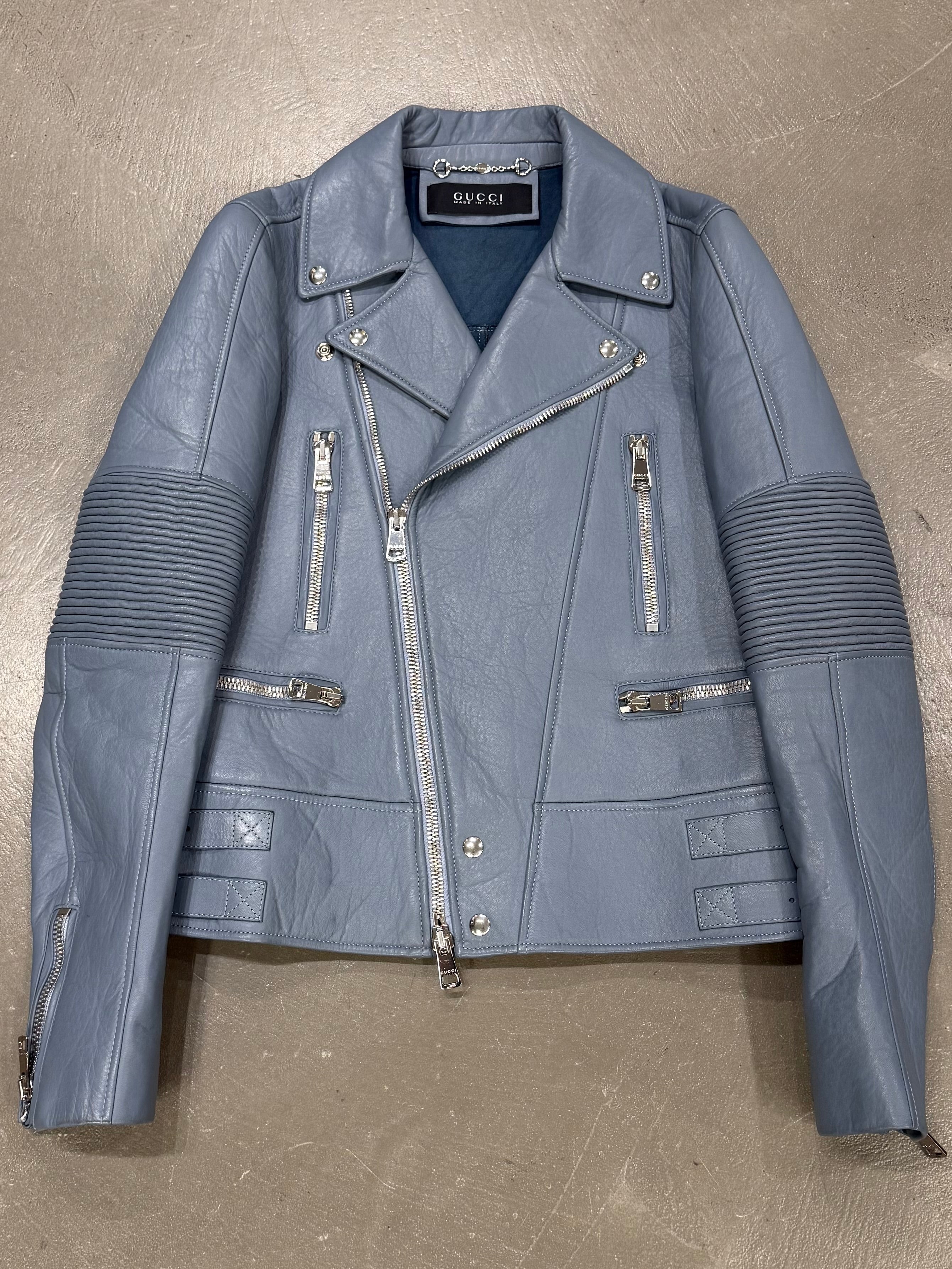 Structured biker jacket from Gucci’s Autumn/Winter 2014 collection, crafted in supple light blue leather. Features quilted detailing at the sleeves, multiple zip pockets, and an asymmetric front closure—a refined interpretation of the classic moto silhouette.