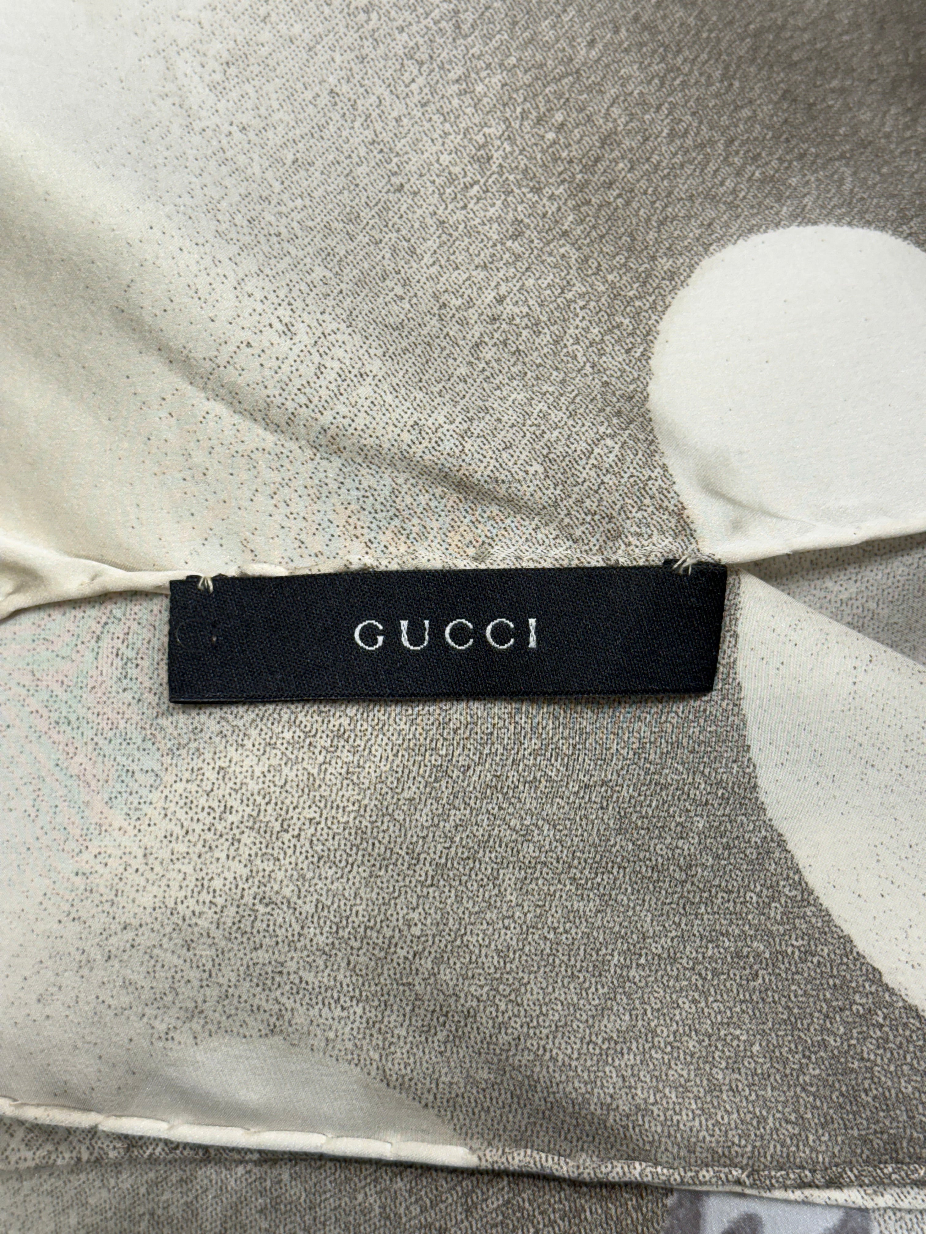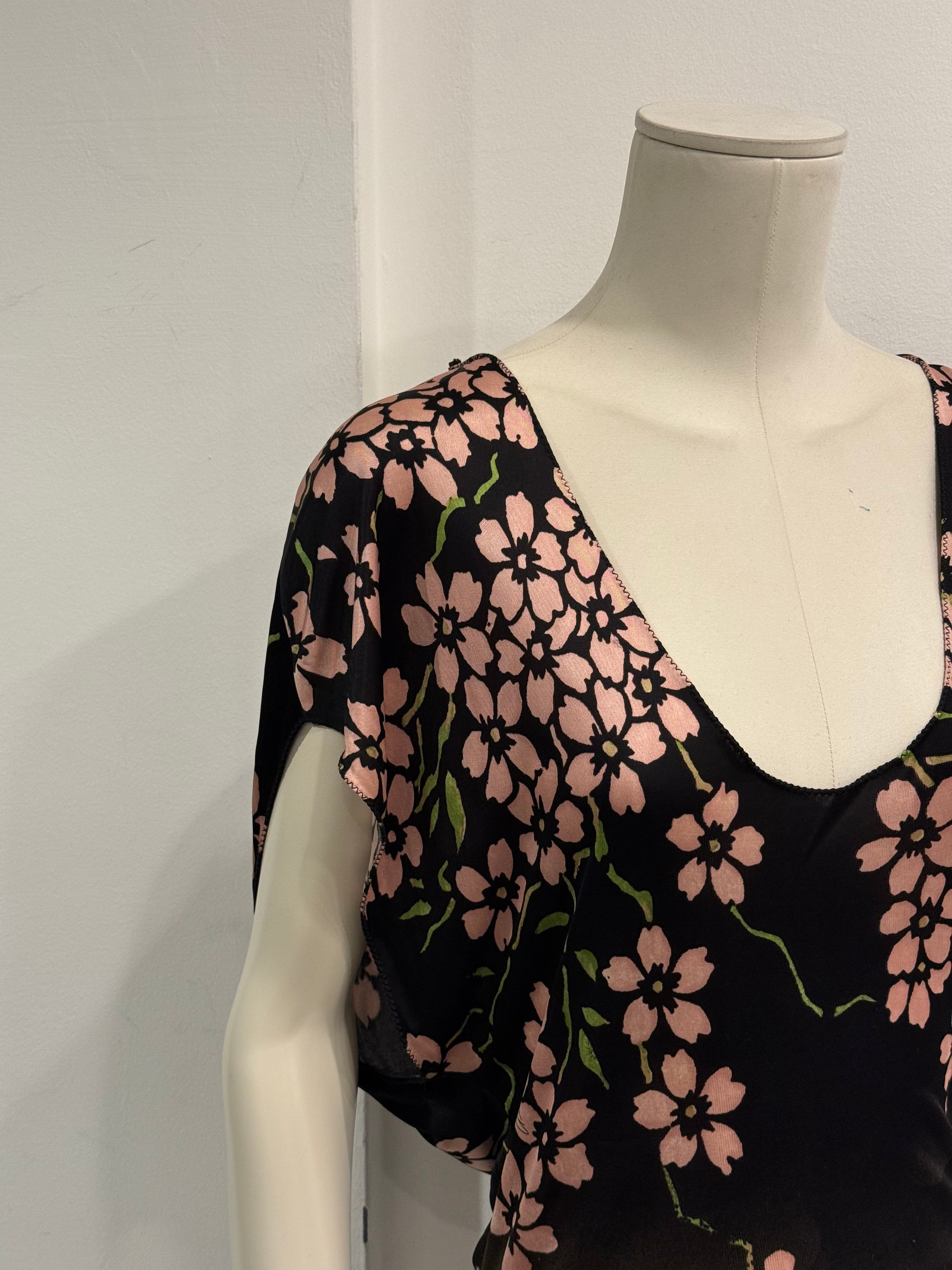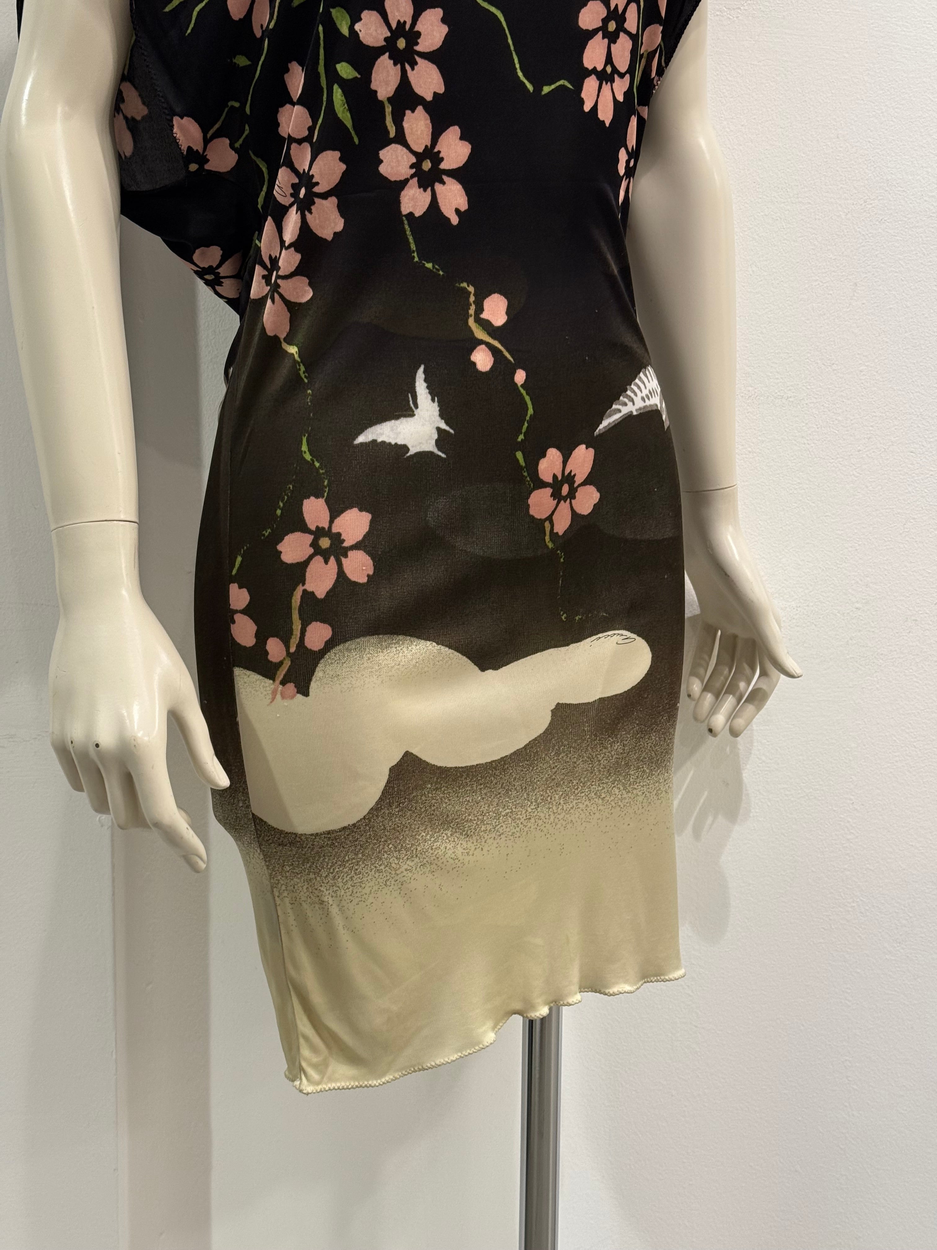 This exceptional Gucci runway dress from the Spring/Summer 2003 collection, designed by Tom Ford, features the iconic cherry blossom motif that defined the season. Crafted in viscose, it presents a fluid silhouette enriched by an integrated matching scarf, enhancing its sensual and dramatic elegance. A highly collectible archival piece that embodies the bold, romantic vision of early 2000s Gucci.