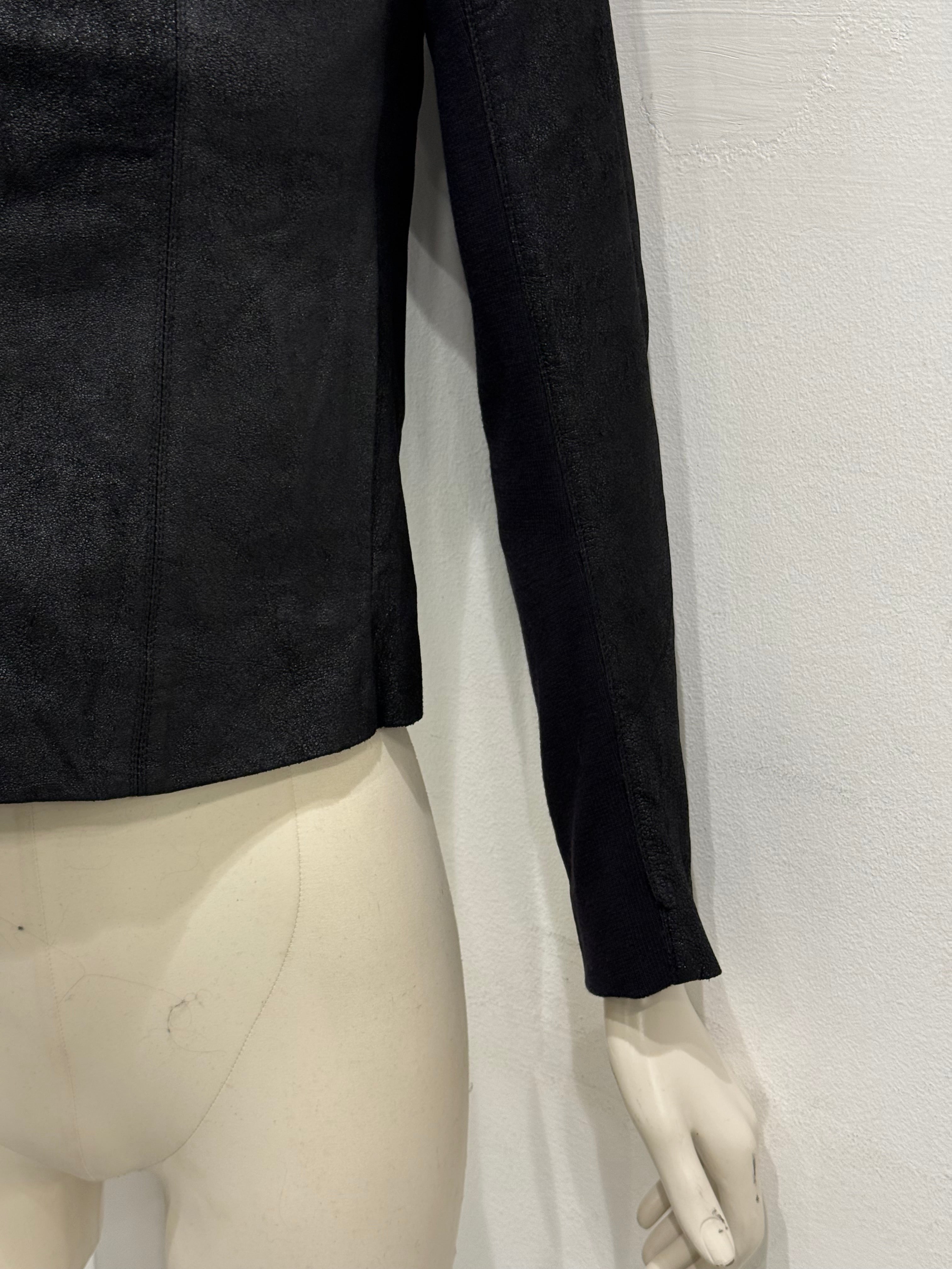 This Rick Owens hooded leather jacket from the 2000s showcases the designer’s signature dark and architectural approach. Crafted from lamb leather, it features a fitted silhouette with an integrated hood, emphasizing both functionality and dramatic presence. A strong archival piece that captures the raw and sculptural essence of early Rick Owens.