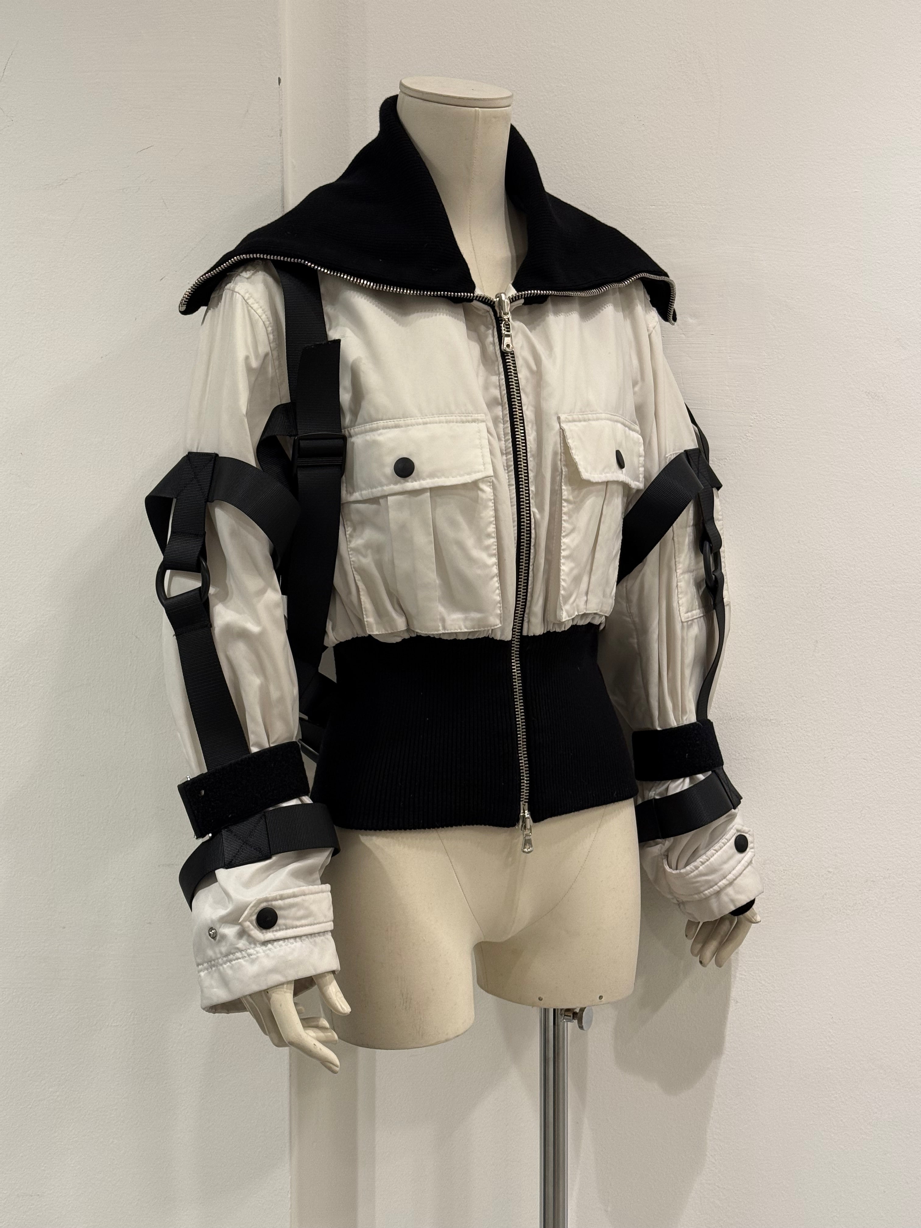 This Dolce & Gabbana runway jacket from the Autumn/Winter 2003 collection is a striking example of early-2000s experimental design. Crafted with a technical parachute-style nylon shell, the piece features a complex bondage-inspired construction with layered panels, adjustable straps, and a sculptural cropped silhouette. The contrast between utilitarian materials and sharp tailoring reflects the provocative, futuristic mood of the era’s runway collections. A highly collectible archival piece with strong visual impact.