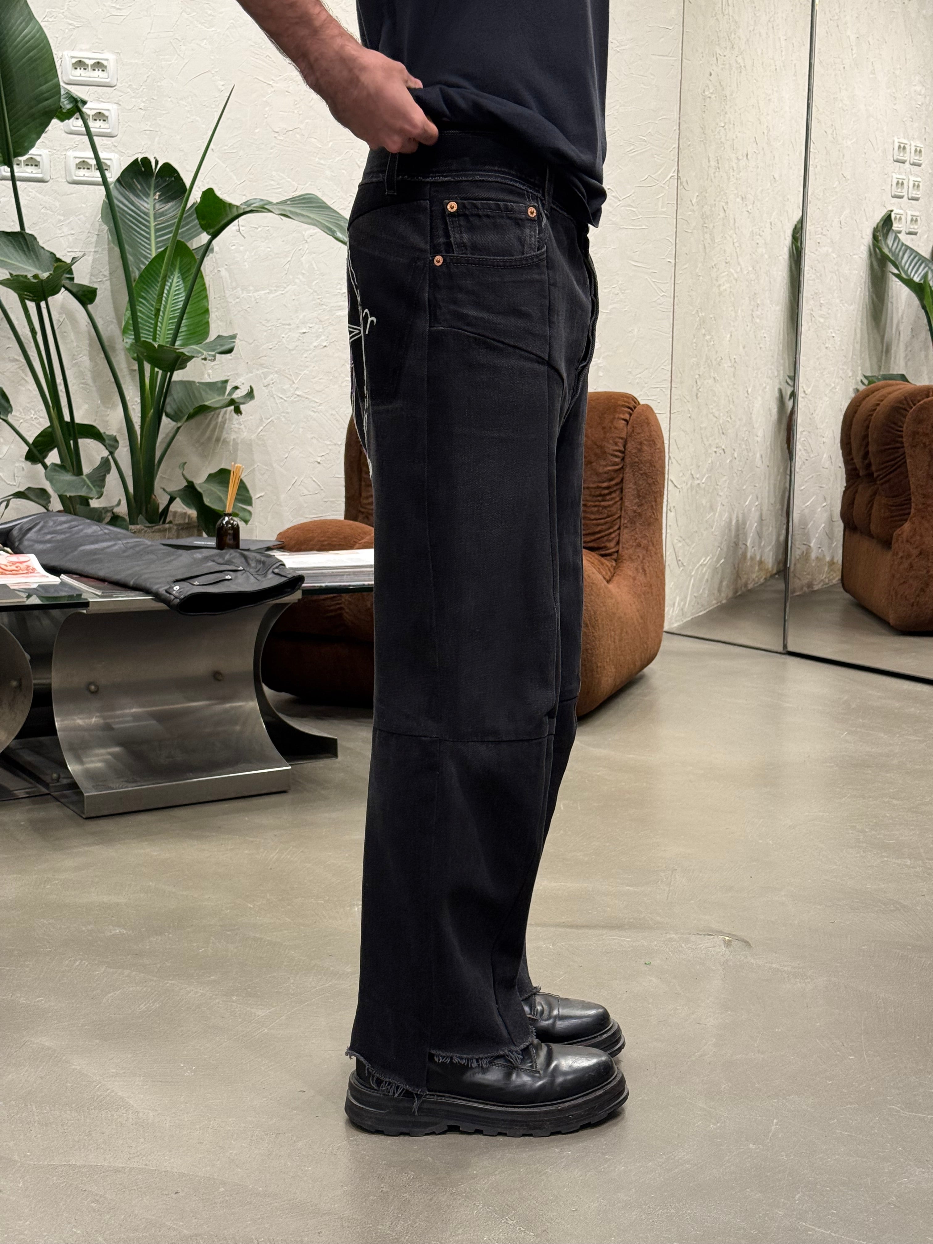 These jeans from Vetements’ Autumn/Winter 2017 collection are one of the most iconic denim pieces from the brand’s collaborative era with Demna Gvasalia. Featuring the bold “Total Fucking Darkness” purple embroidery across the back, they reinterpret heavy metal iconography through Vetements’ irreverent lens. The jeans are crafted from heavyweight black denim with a straight-leg cut, raw hems, and signature oversized proportions. A statement archival piece that merges subcultural references with luxury craftsmanship.