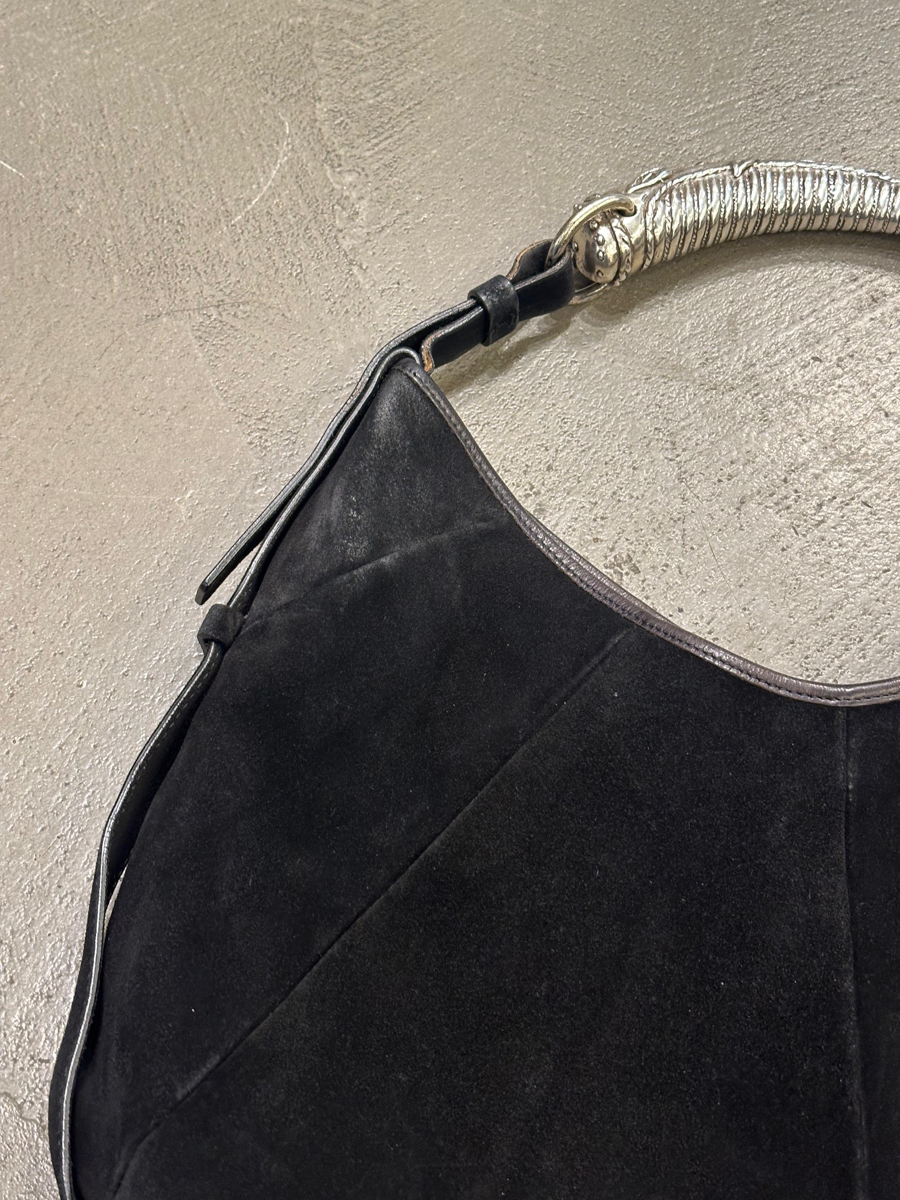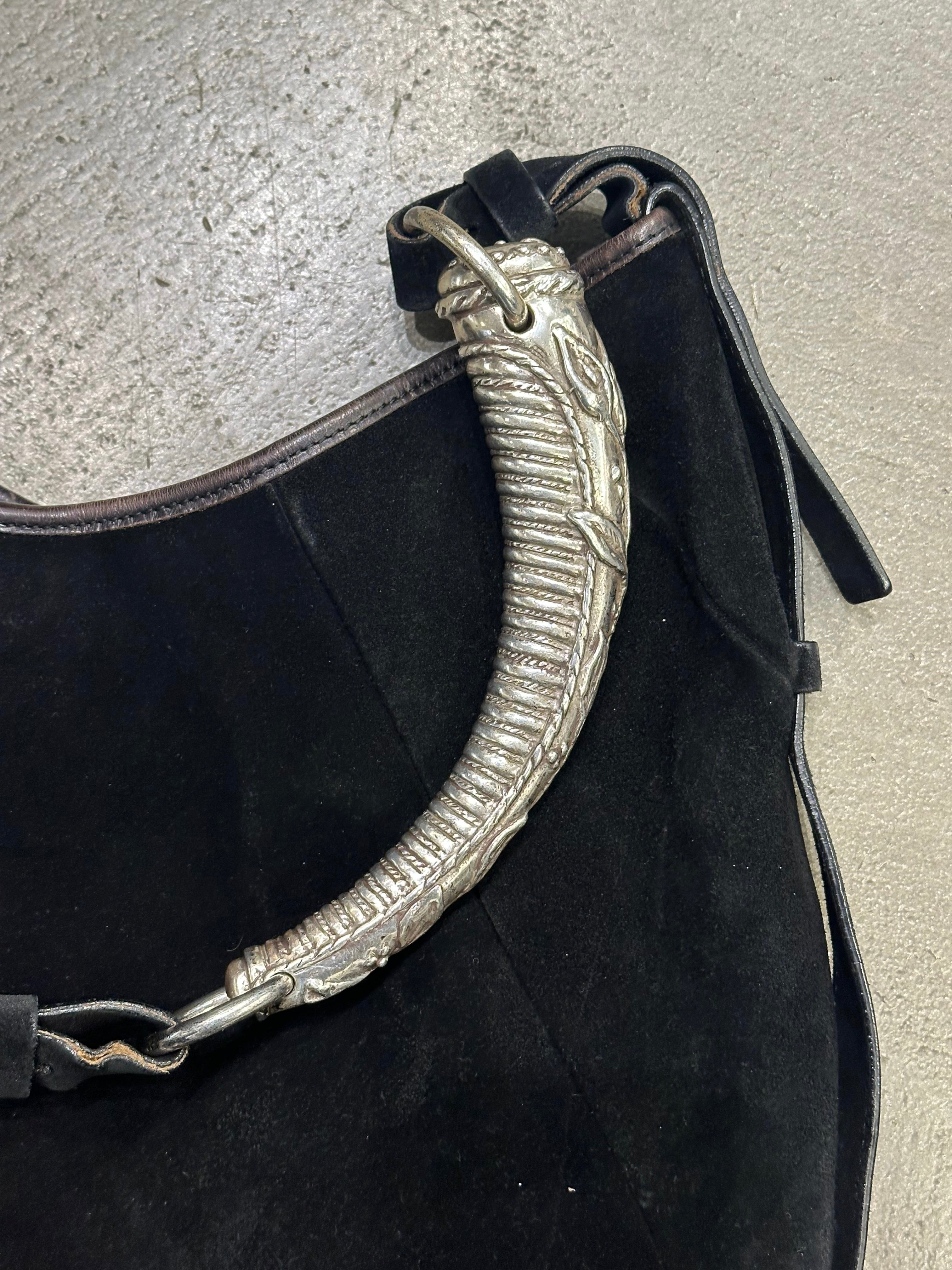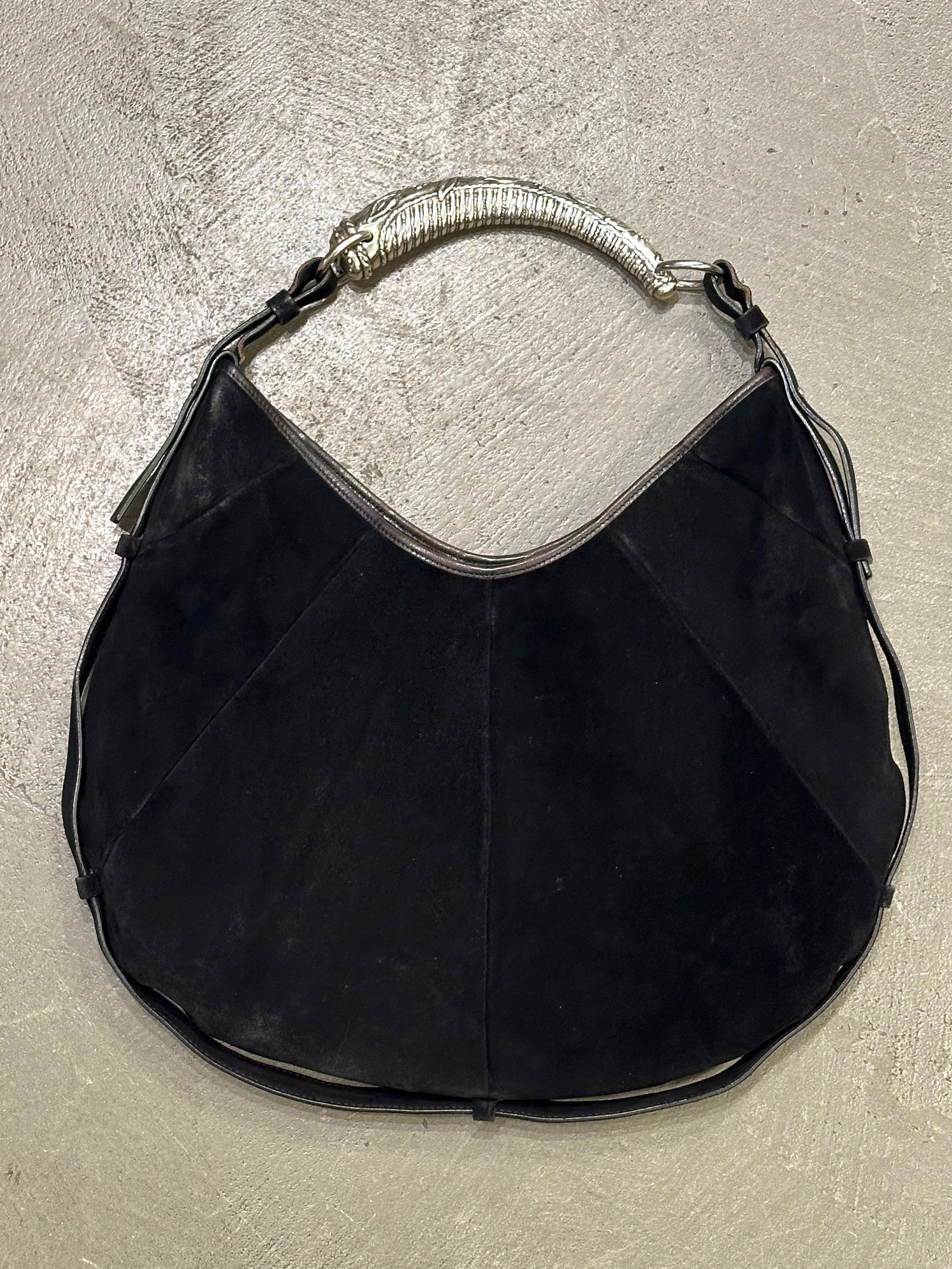Crafted in soft black suede, this 2002 Yves Saint Laurent Mombasa bag is an early and highly collectible example of the house’s iconic design. The signature sculptural horn-shaped handle in silver-tone metal creates a striking focal point, reflecting the bold elegance and craftsmanship of the Tom Ford era. Its wide, rounded silhouette offers a graceful, effortless drape, while the minimalist construction highlights the luxurious texture and form of the suede. A timeless archival piece, this bag combines sophisticated style with refined artistry, making it a standout accessory for collectors and fashion enthusiasts seeking early-2000s YSL allure.