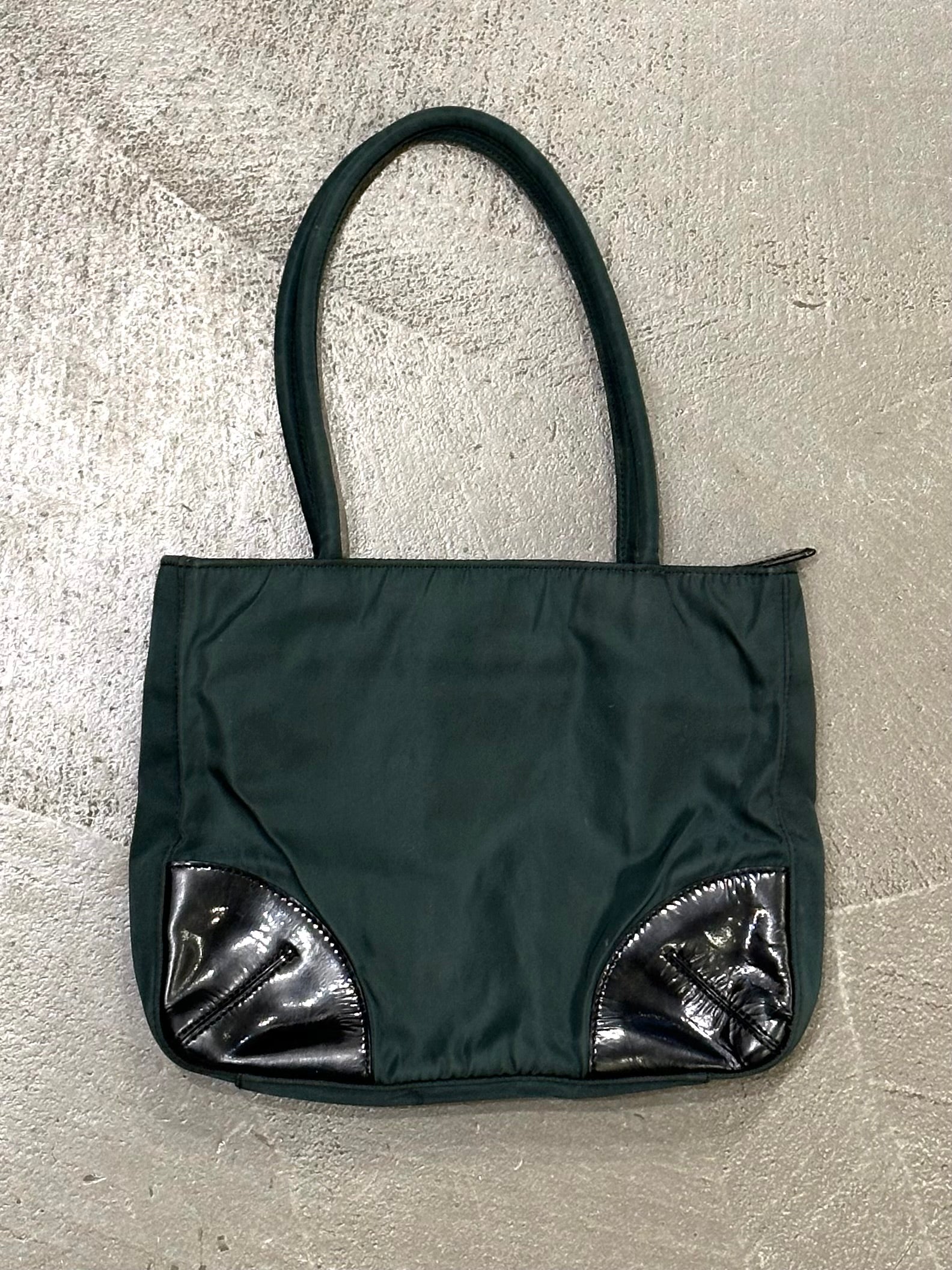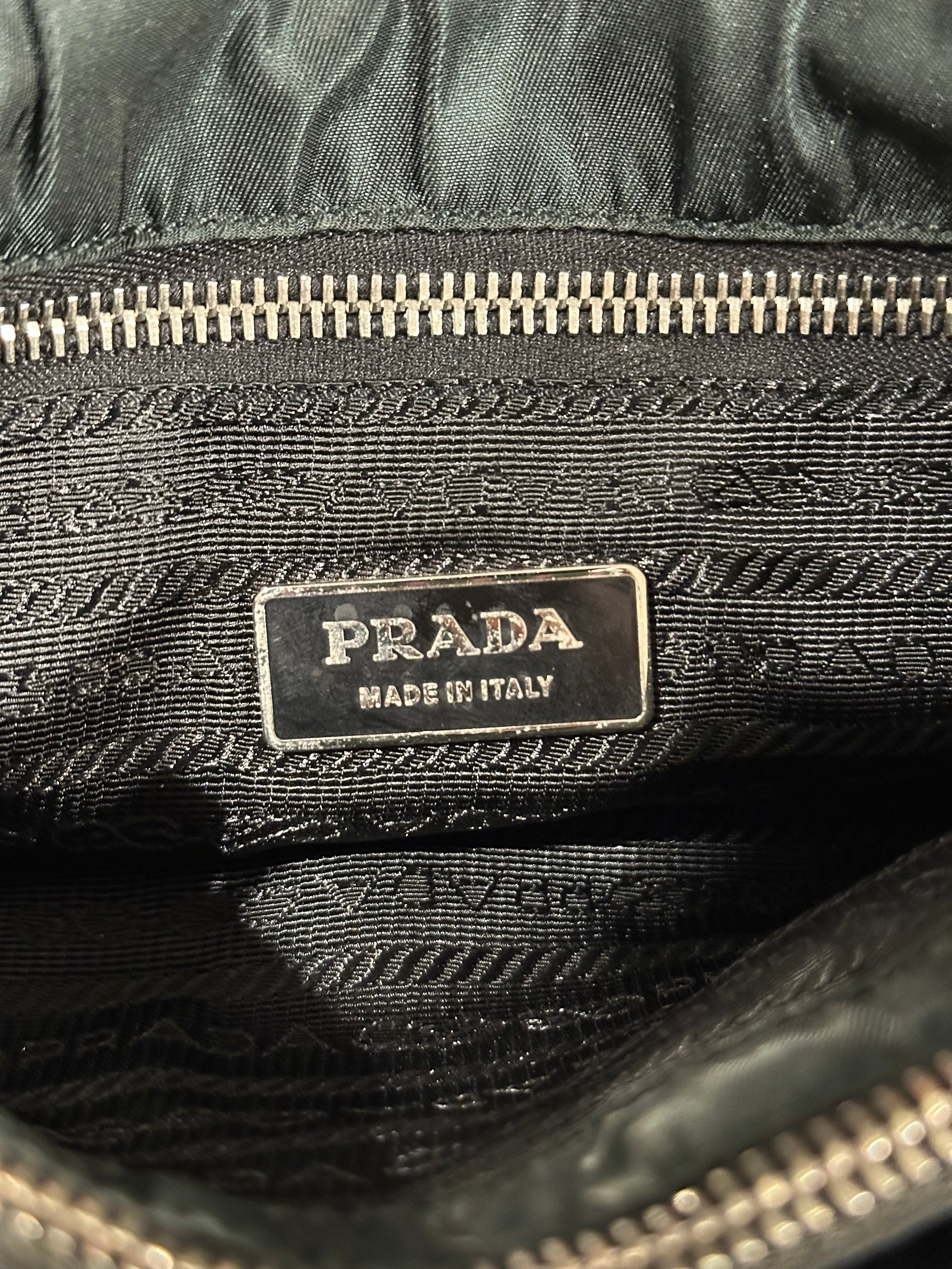 This vintage Prada bag combines the brand's iconic green nylon fabric with black leather accents, creating a timeless and versatile design. Featuring a structured, square silhouette, silver-tone hardware, and a signature triangular logo plaque, it is both practical and stylish. The interior is thoughtfully designed with three compartments, including one zippered pocket, offering organized storage for daily essentials. Perfect for everyday use or as a collector's piece for Prada enthusiasts, this bag balances functionality with classic Prada elegance, making it a standout accessory for any wardrobe.
