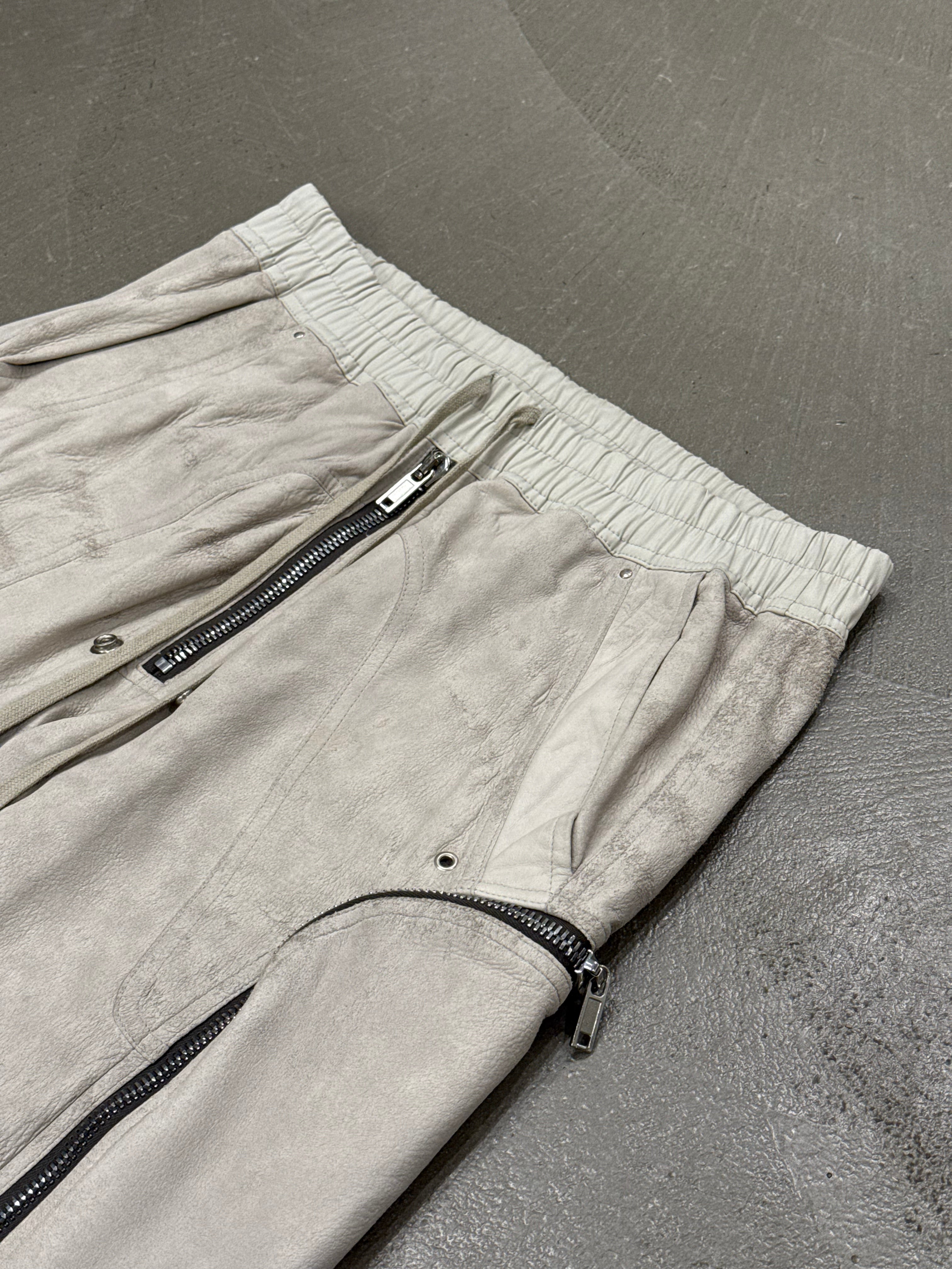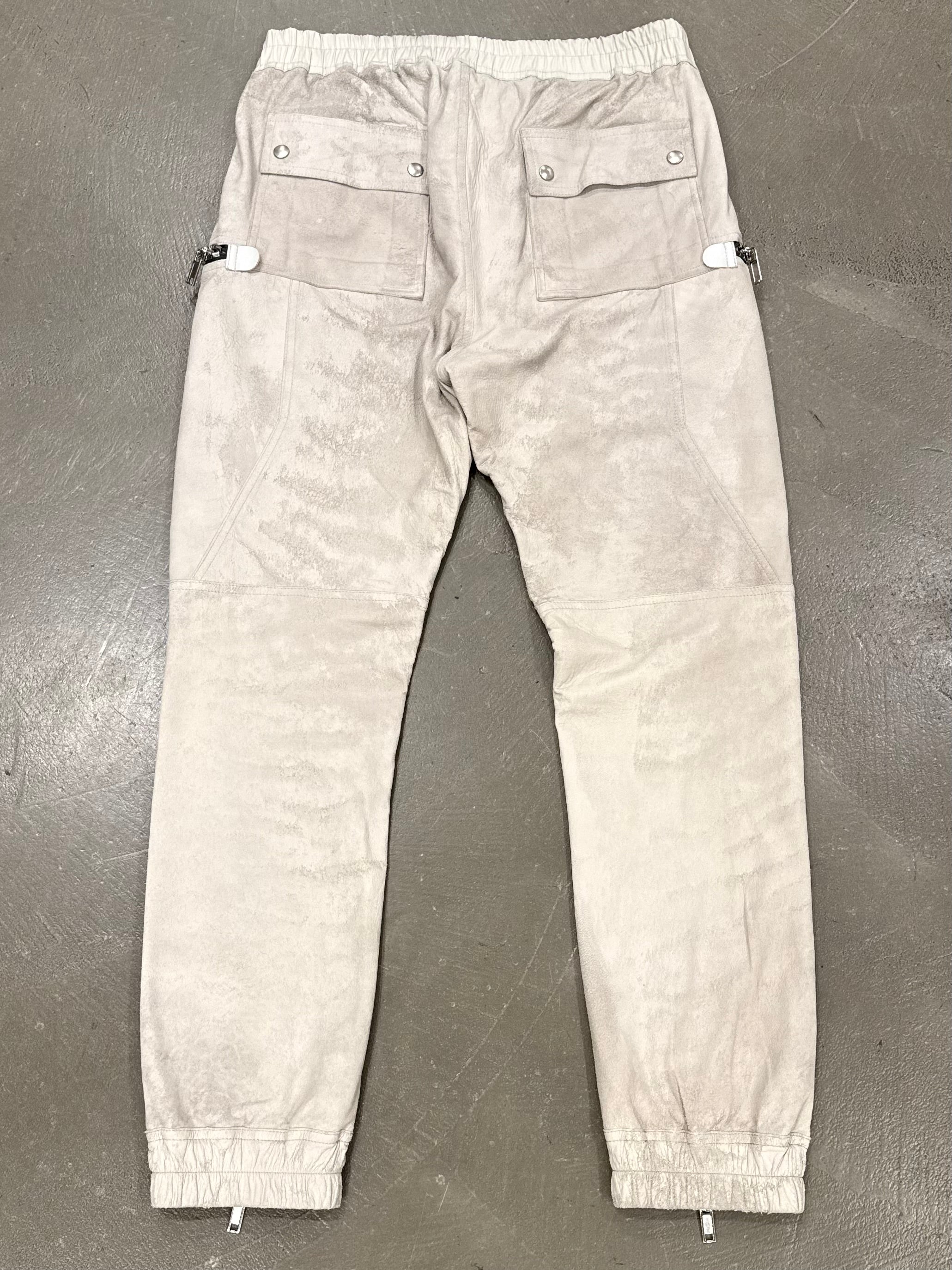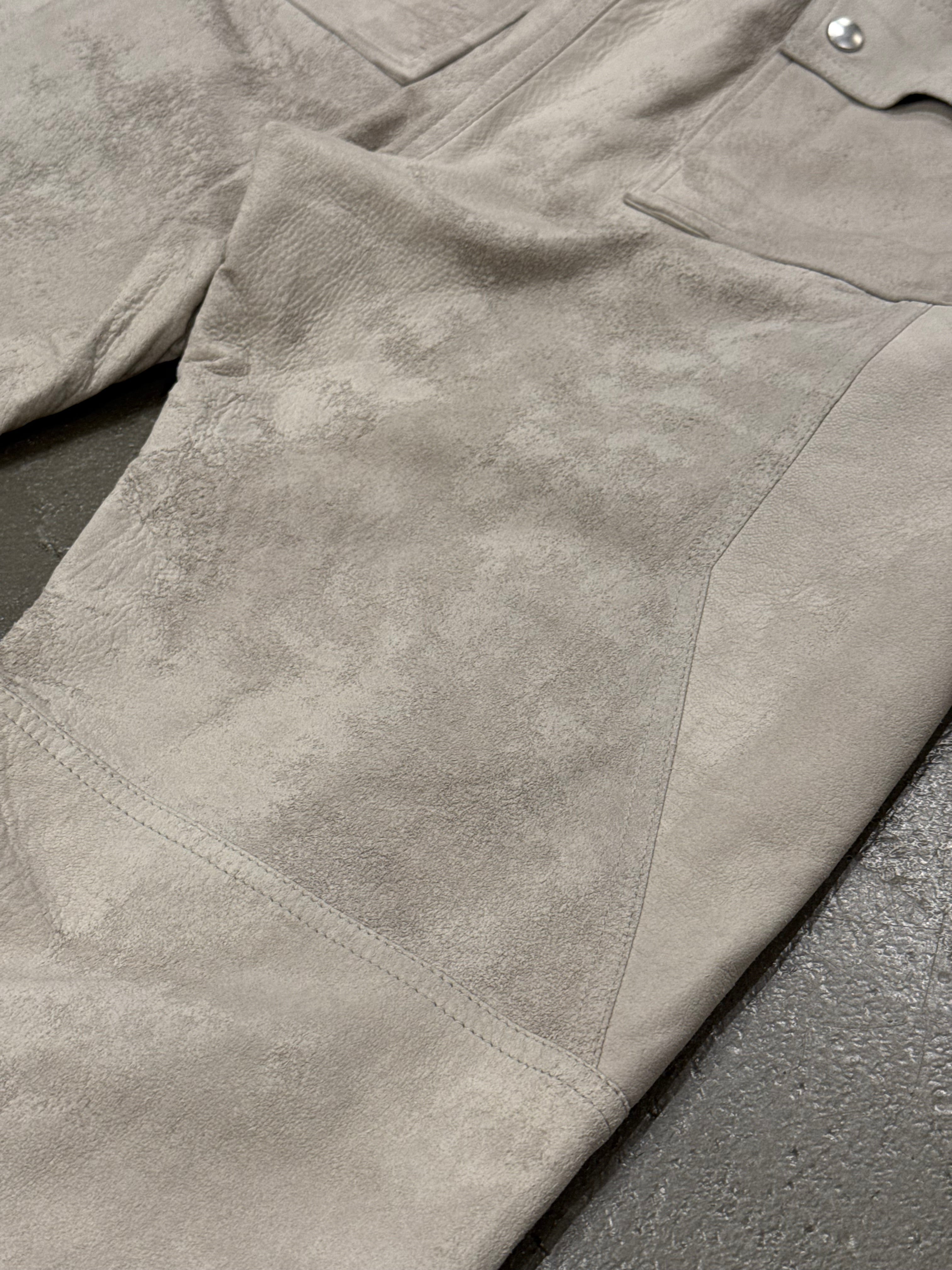 Crafted from distressed lamb leather, these Bauhaus cargo pants from Rick Owens’ Spring/Summer 2021 “Phlegeton” collection embody the designer’s signature brutalist aesthetic. Featuring exaggerated zippers along the legs, articulated seams, and a relaxed yet structured silhouette, the piece merges utilitarian design with a sculptural edge. The washed, blistered finish enhances the tactile character of the leather, giving each pair a unique patina over time.